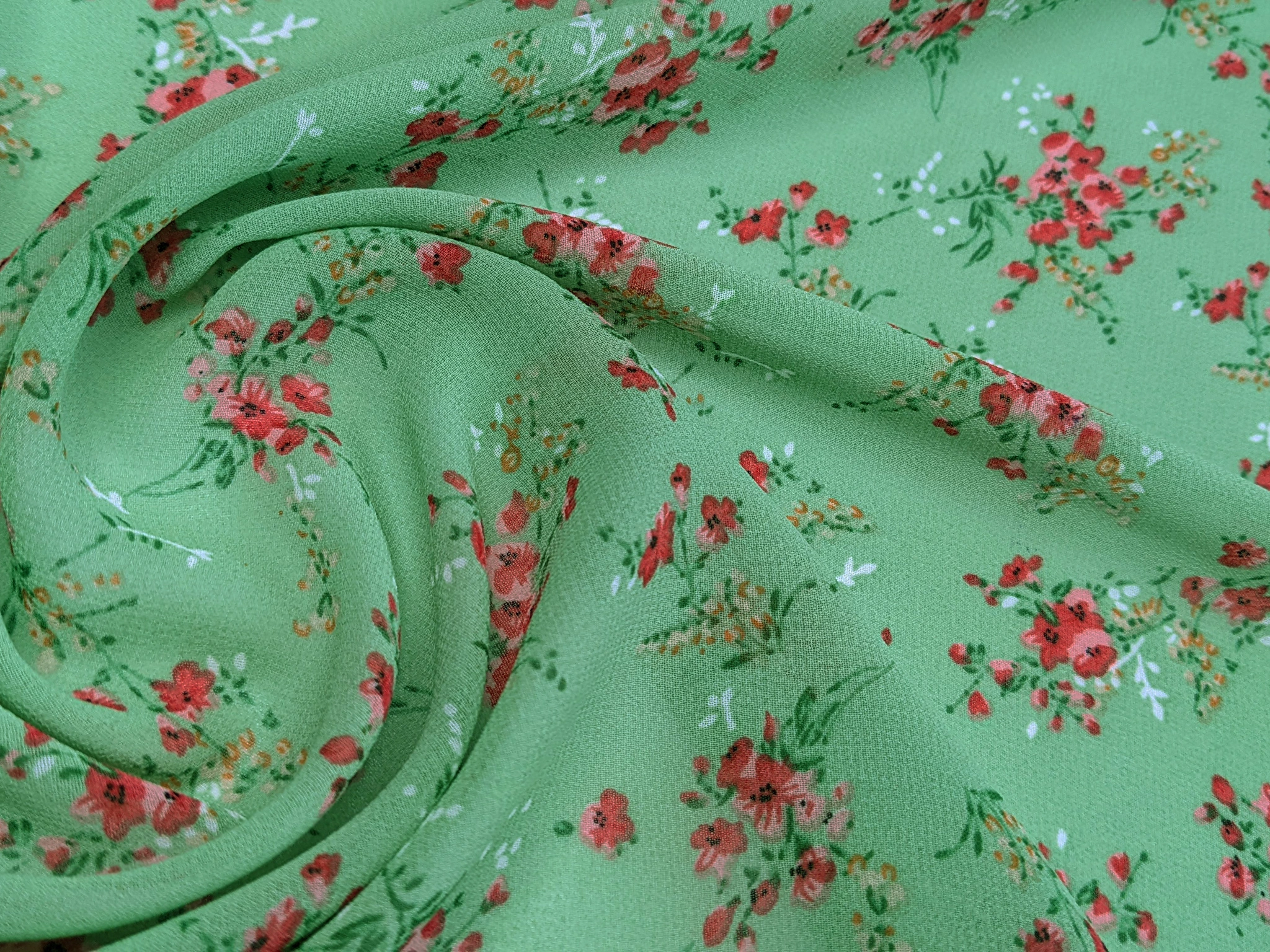 Принтований креп-шифон - це напівпрозора шорстка тканина. Тканина гарно драпірується. Прати й прасувати вироби з крепа- шифону коштує з обережністю, вибираючи делікатні режими. Полотно дуже міцне завдяки туго переплетених ниток. Для пошиття суконь рекомендуємо придбати легку підкладкову тканину.