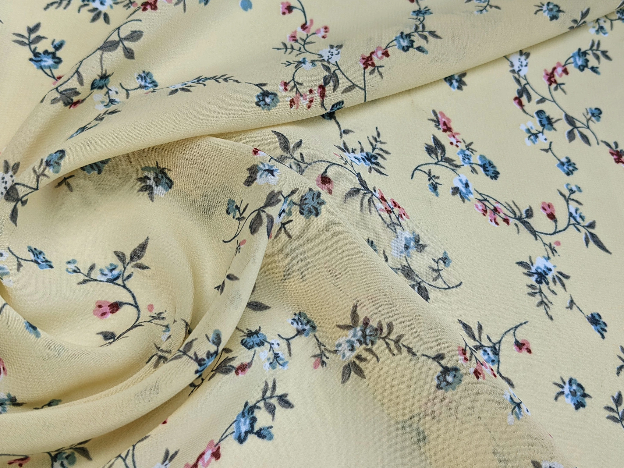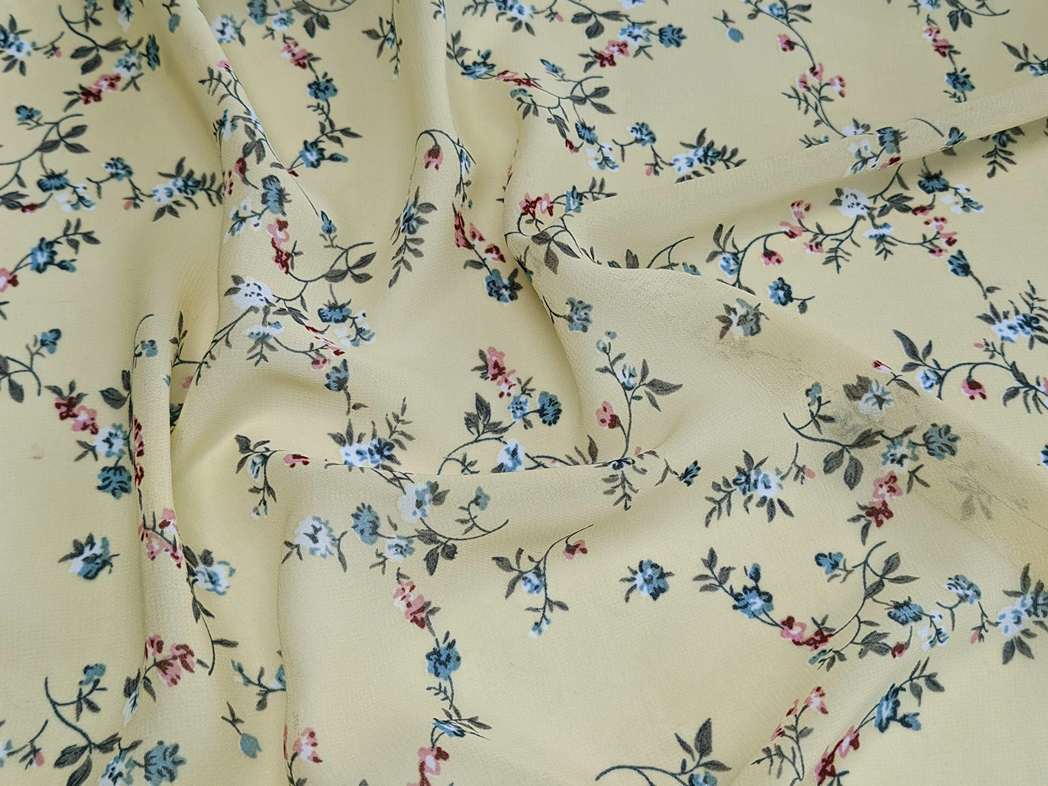 Принтований креп-шифон - це напівпрозора шорстка тканина. Тканина гарно драпірується. Прати й прасувати вироби з крепа- шифону коштує з обережністю, вибираючи делікатні режими. Полотно дуже міцне завдяки туго переплетених ниток. Для пошиття суконь рекомендуємо придбати легку підкладкову тканину.