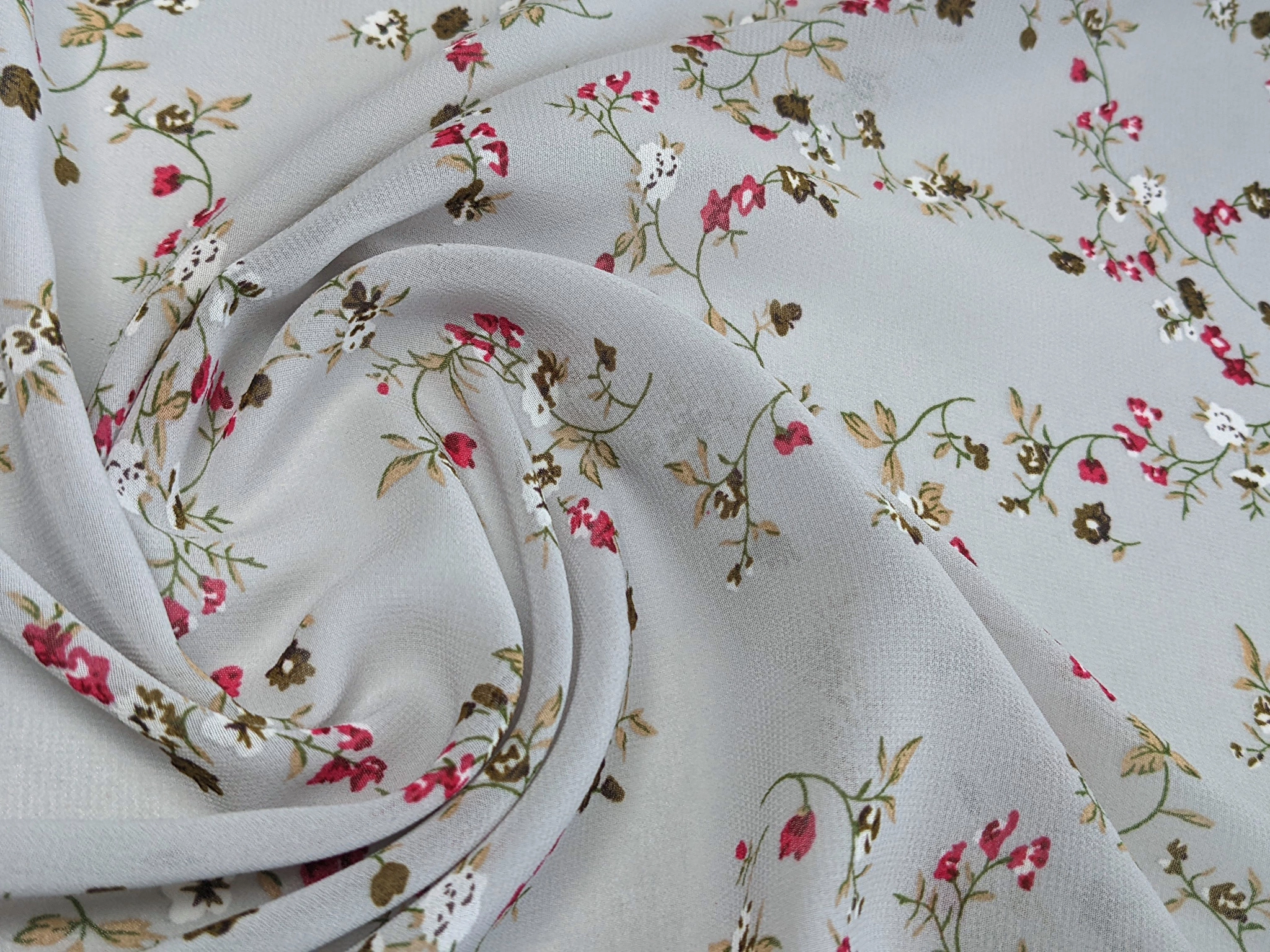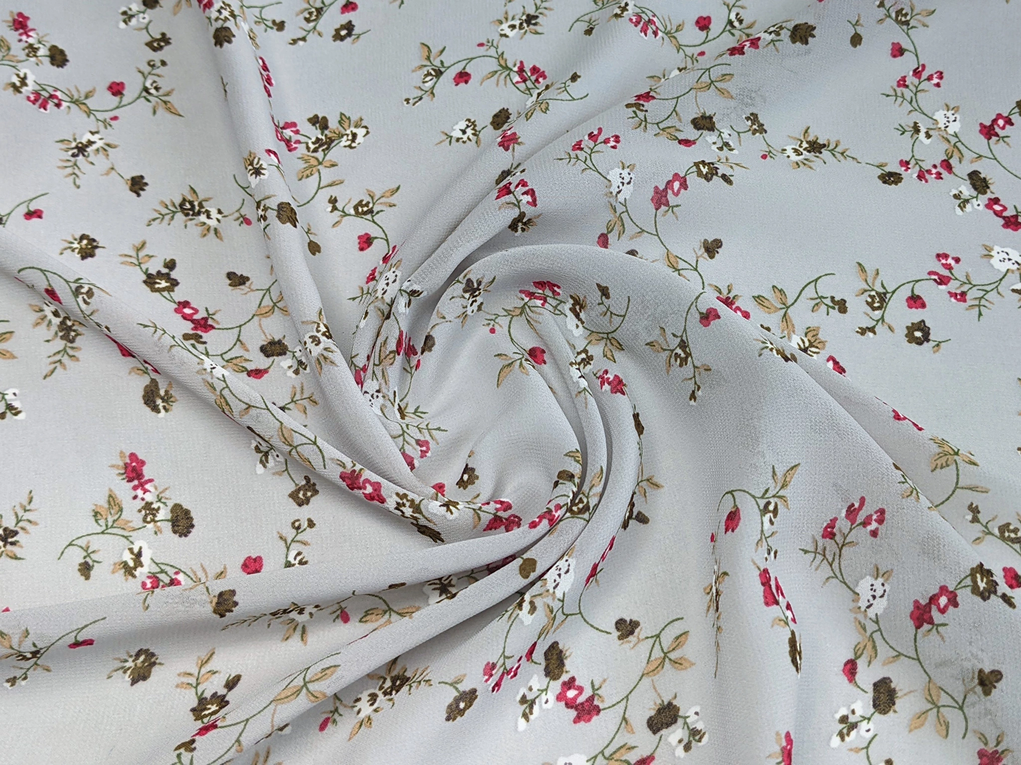 Принтований креп-шифон - це напівпрозора шорстка тканина. Тканина гарно драпірується. Прати й прасувати вироби з крепа- шифону коштує з обережністю, вибираючи делікатні режими. Полотно дуже міцне завдяки туго переплетених ниток. Для пошиття суконь рекомендуємо придбати легку підкладкову тканину.
