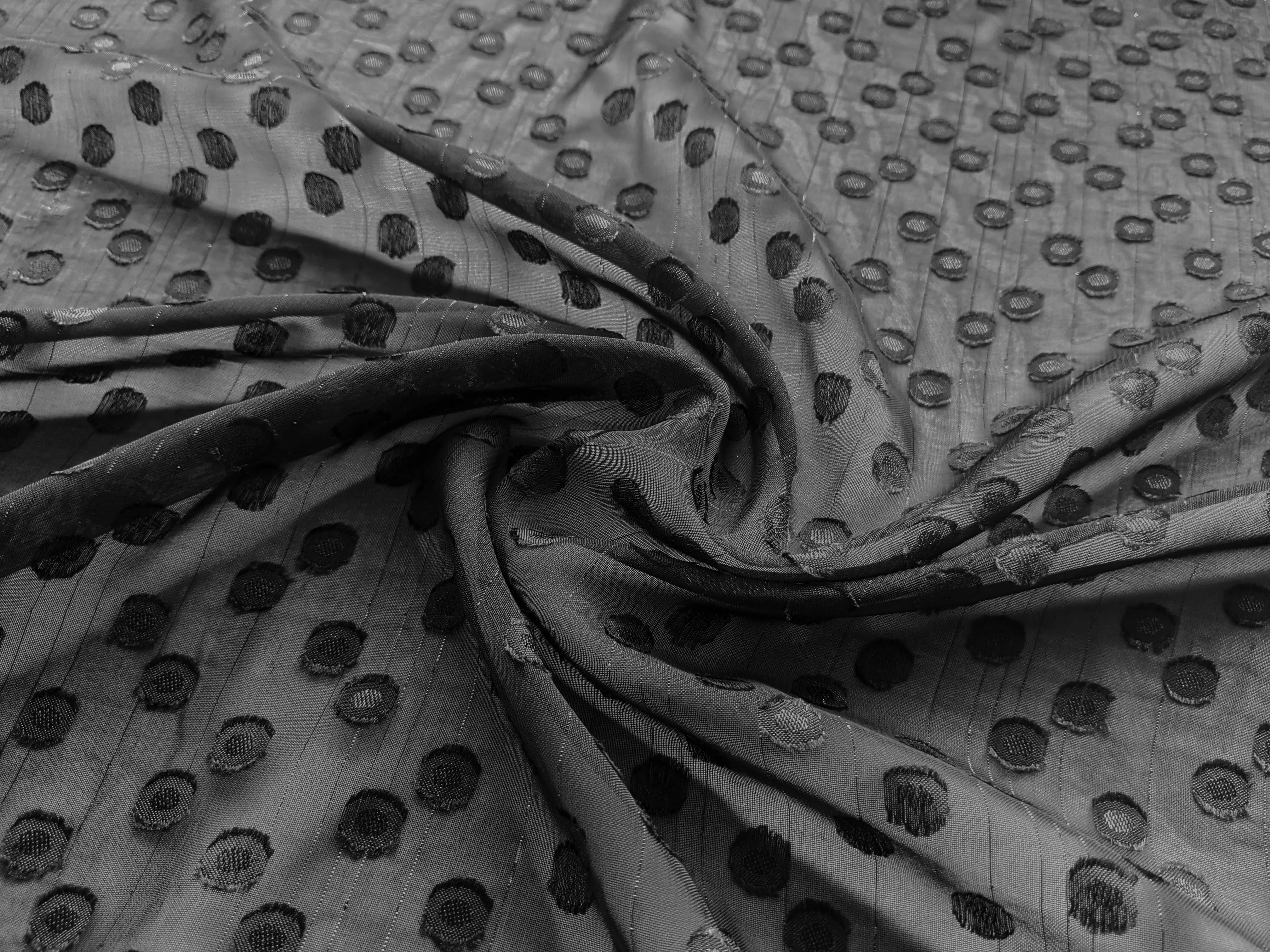 Шифон металік - полотно з люрексовой ниткою і витканими кружечками. Тканина дуже легка, майже не мнеться. Стильний дизайн дозволяє створити жіночні образи для літнього сезону. Люрексова нитка додасть легкого сяйва. Тканина відмінно підходить для пошиття накидок, блуз, суконь і спідниць. Для пошиття сукні або спідниці необхідно обрати підкладку. Тканину на підкладку ви можете придбати на нашому сайті в комплекті з шифоном.