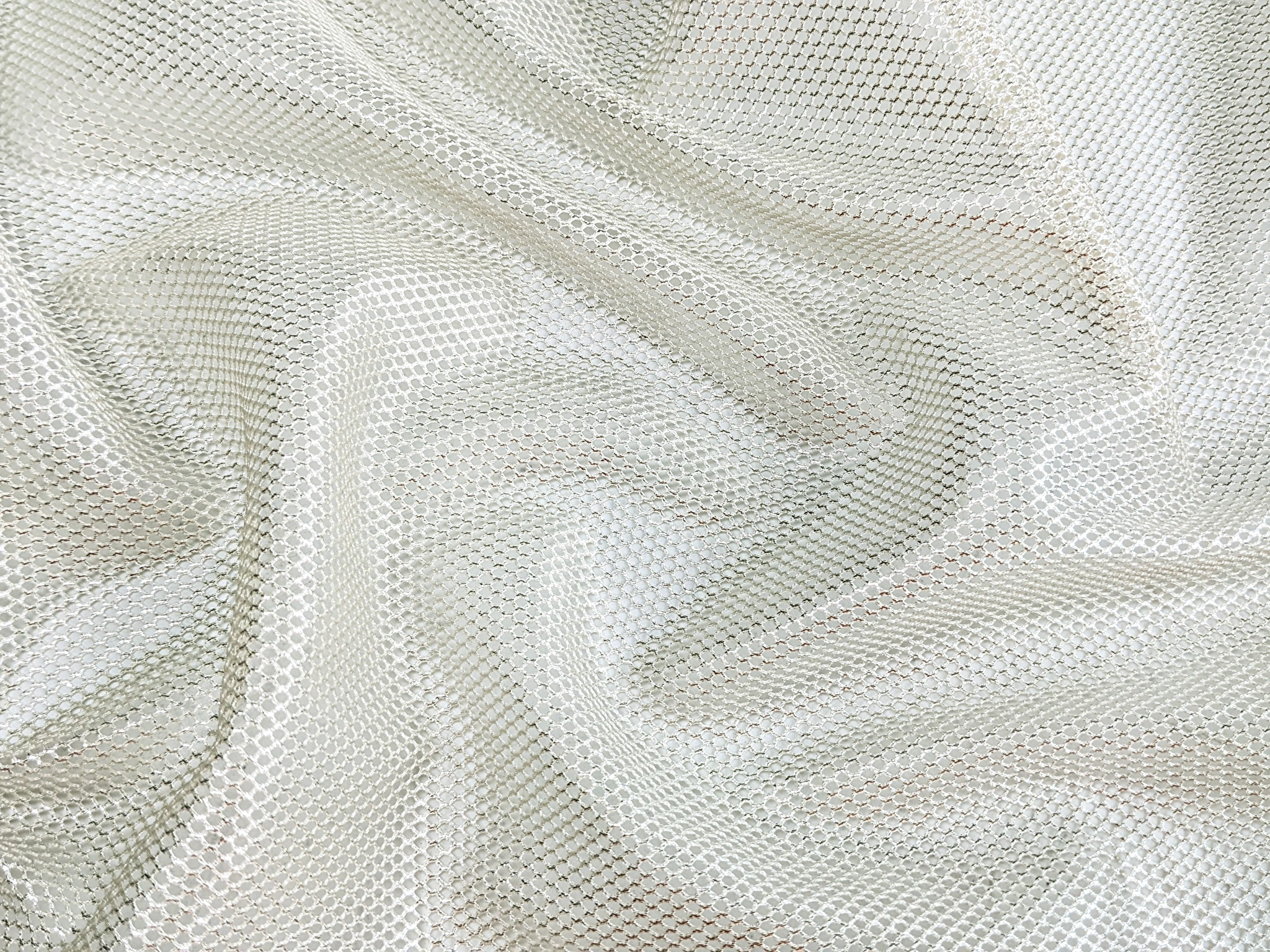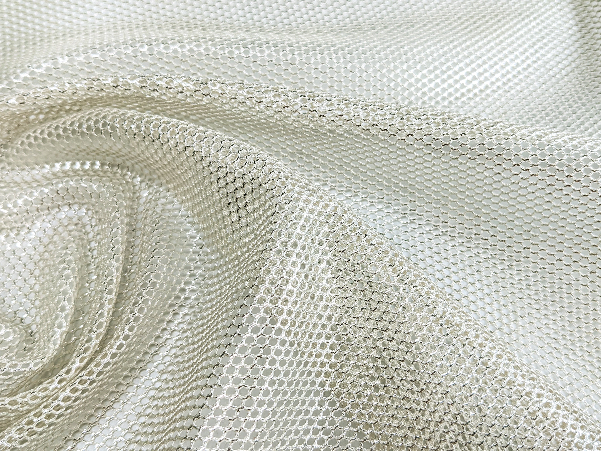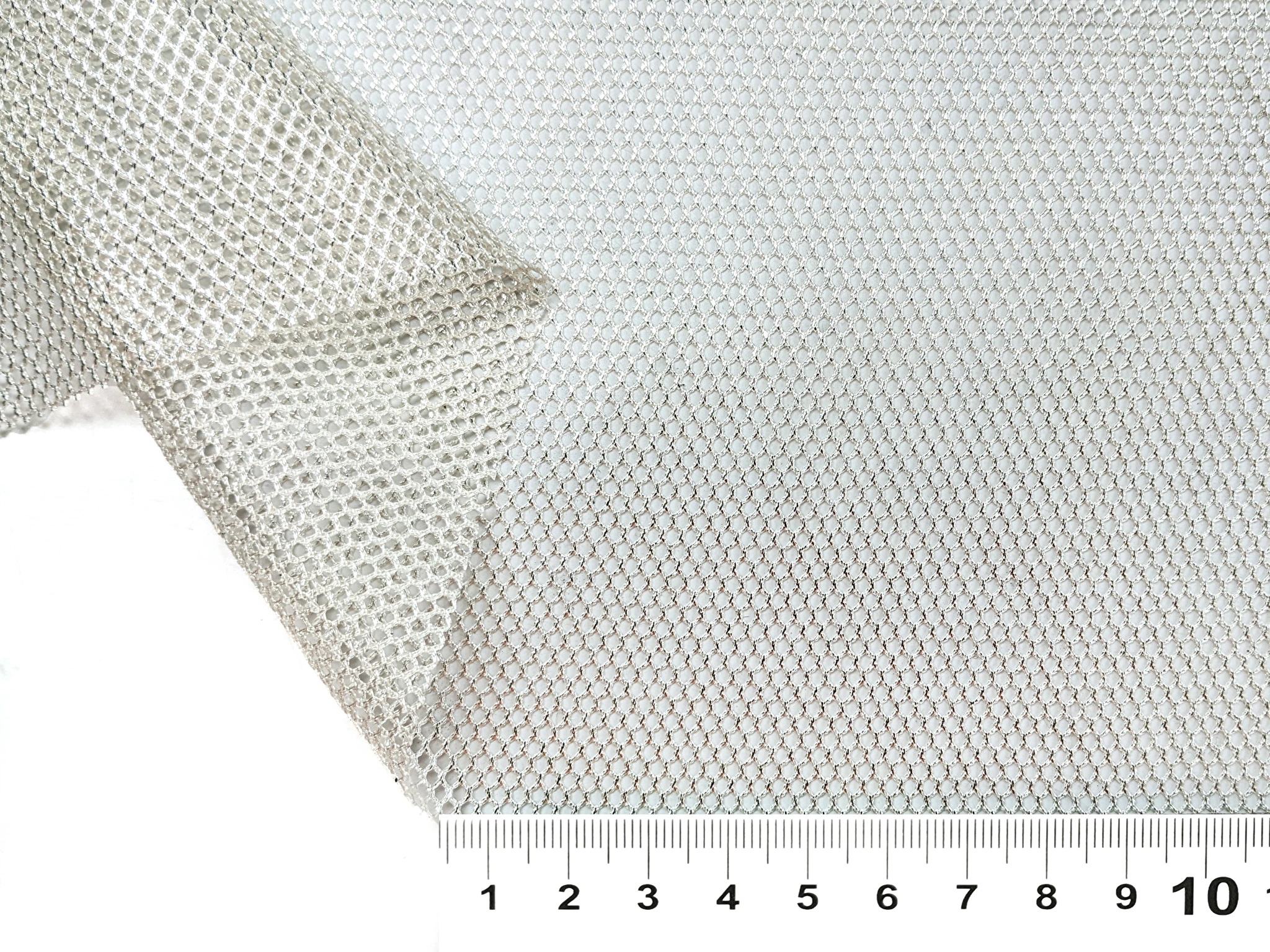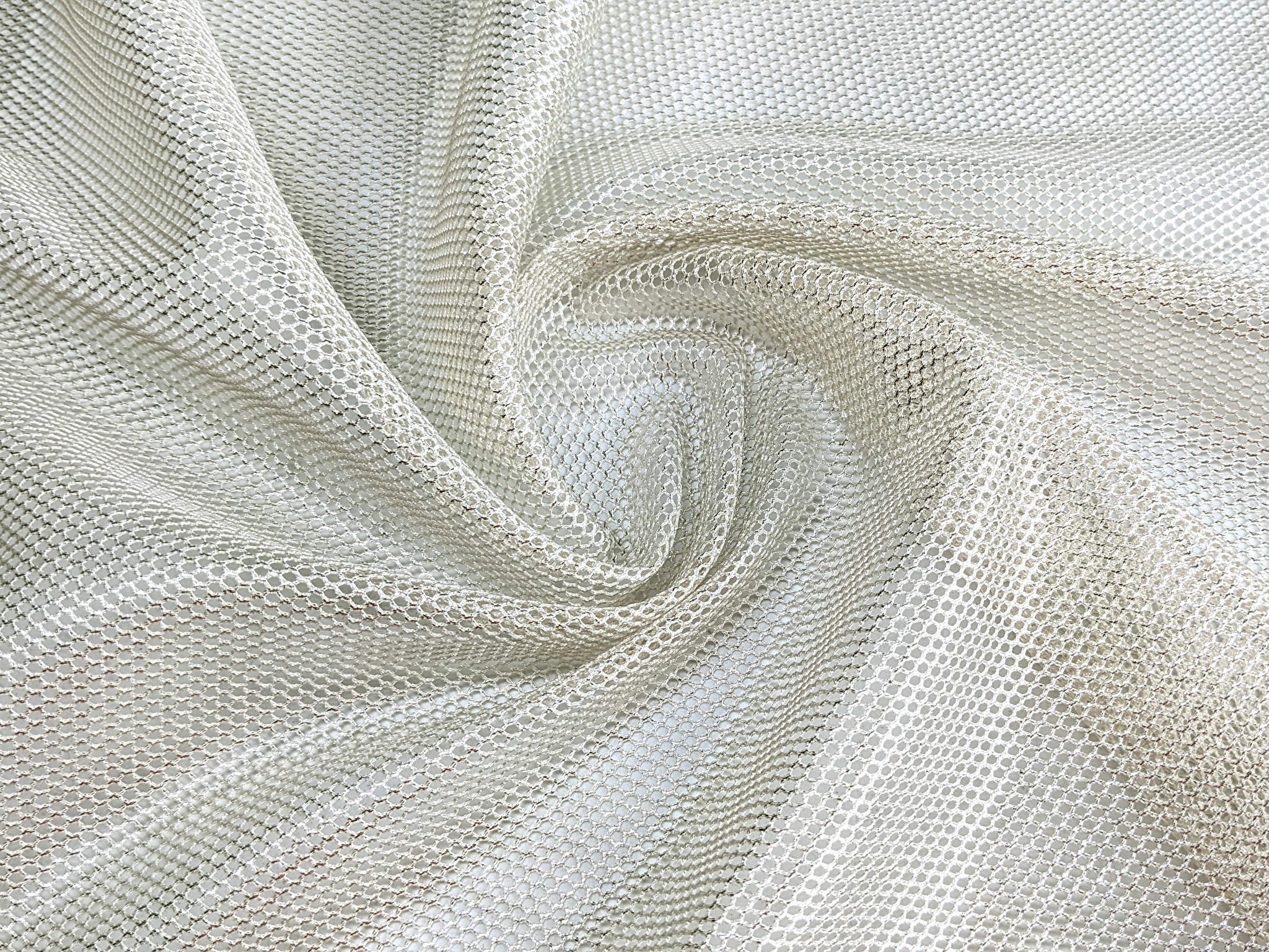 Сітка блиск - це тонке напівпрозоре полотно з дрібними осередками розміром 1,5 мм. Тонка металізована нитка надає поверхні помірний, ненав'язливий сталевий блиск, що переливається. Матеріал пружний, пластичний, має легку еластичність завдяки наскрізному сітчастому плетенню, не мнеться, при драпіруванні утворює стійку форму.