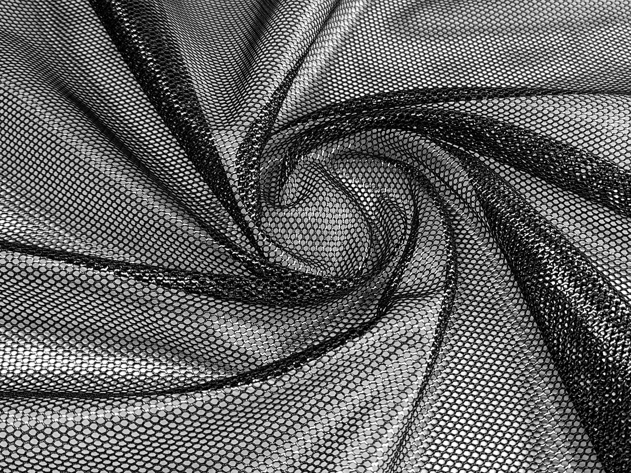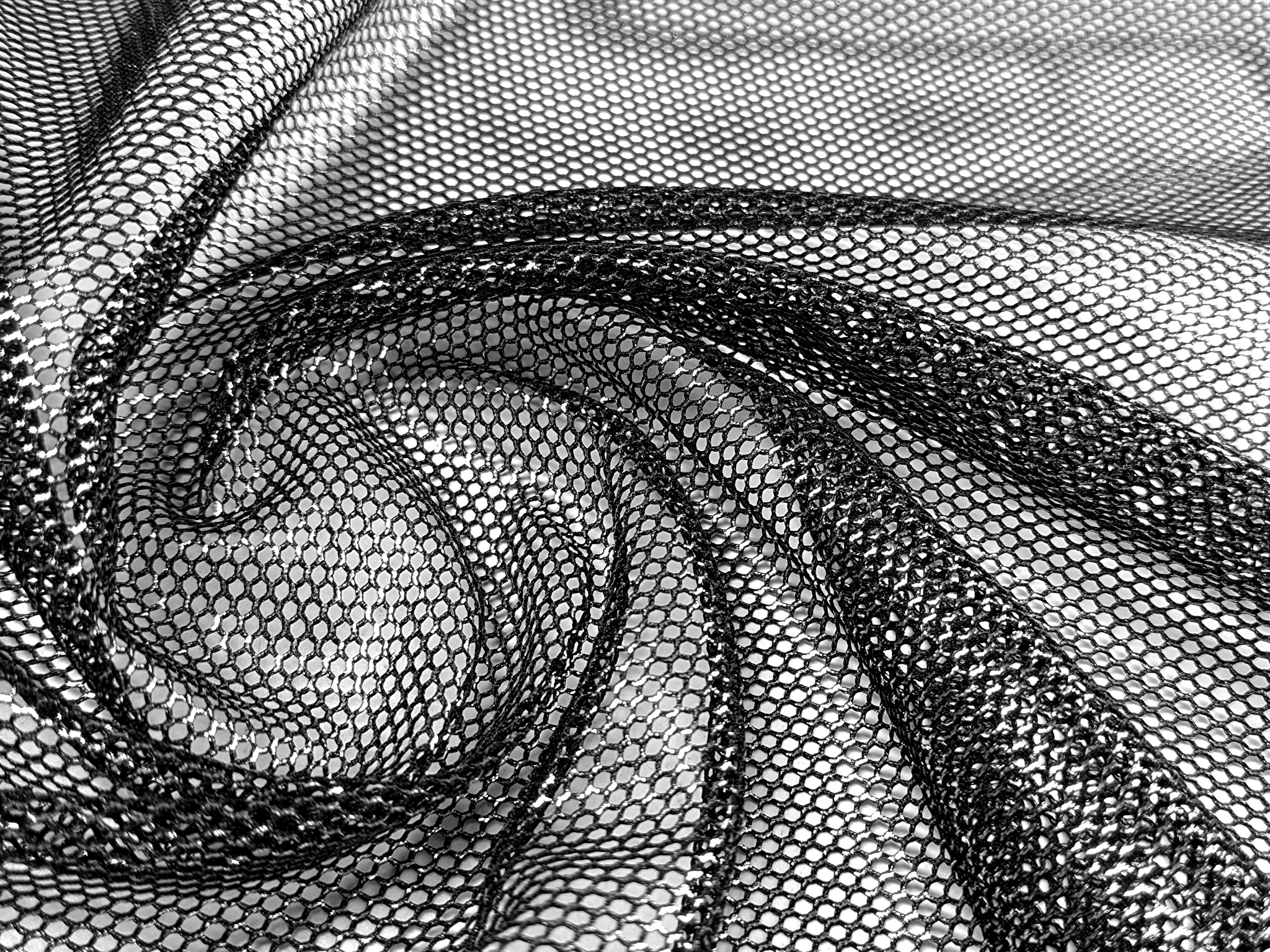 Сітка блиск - це тонке напівпрозоре полотно з дрібними осередками розміром 1,5 мм. Тонка металізована нитка надає поверхні помірний, ненав'язливий сталевий блиск, що переливається. Матеріал пружний, пластичний, має легку еластичність завдяки наскрізному сітчастому плетенню, не мнеться, при драпіруванні утворює стійку форму.