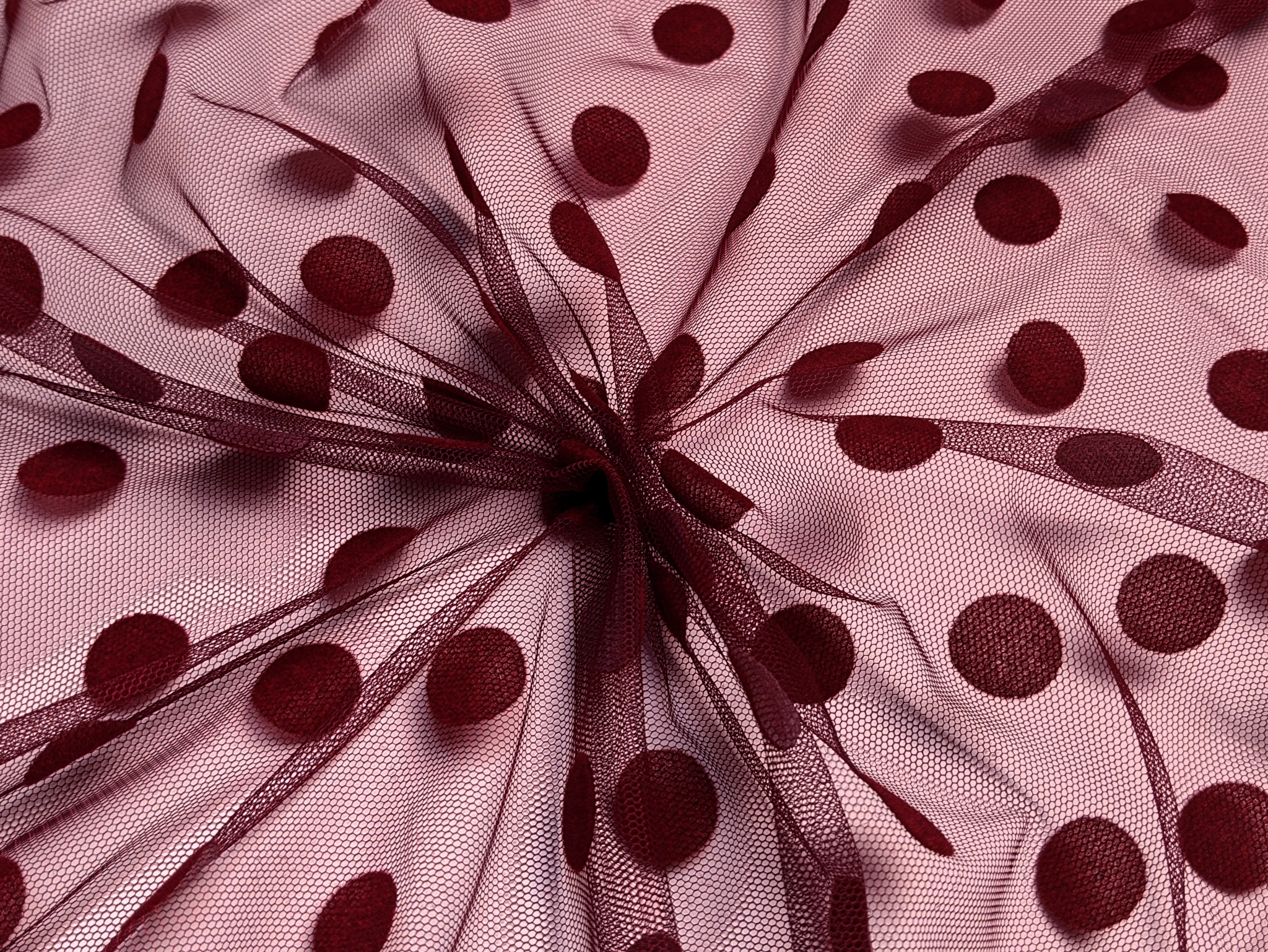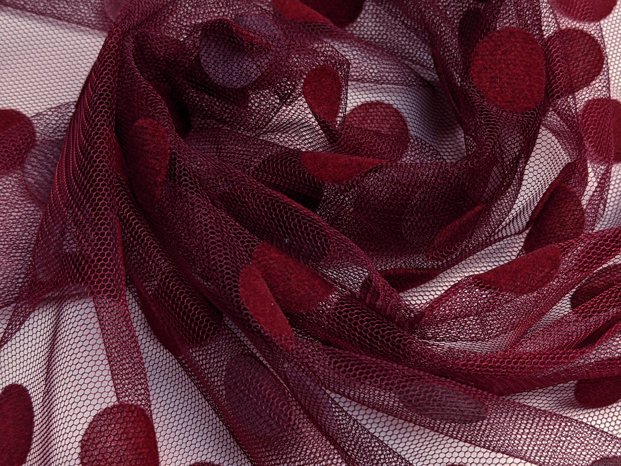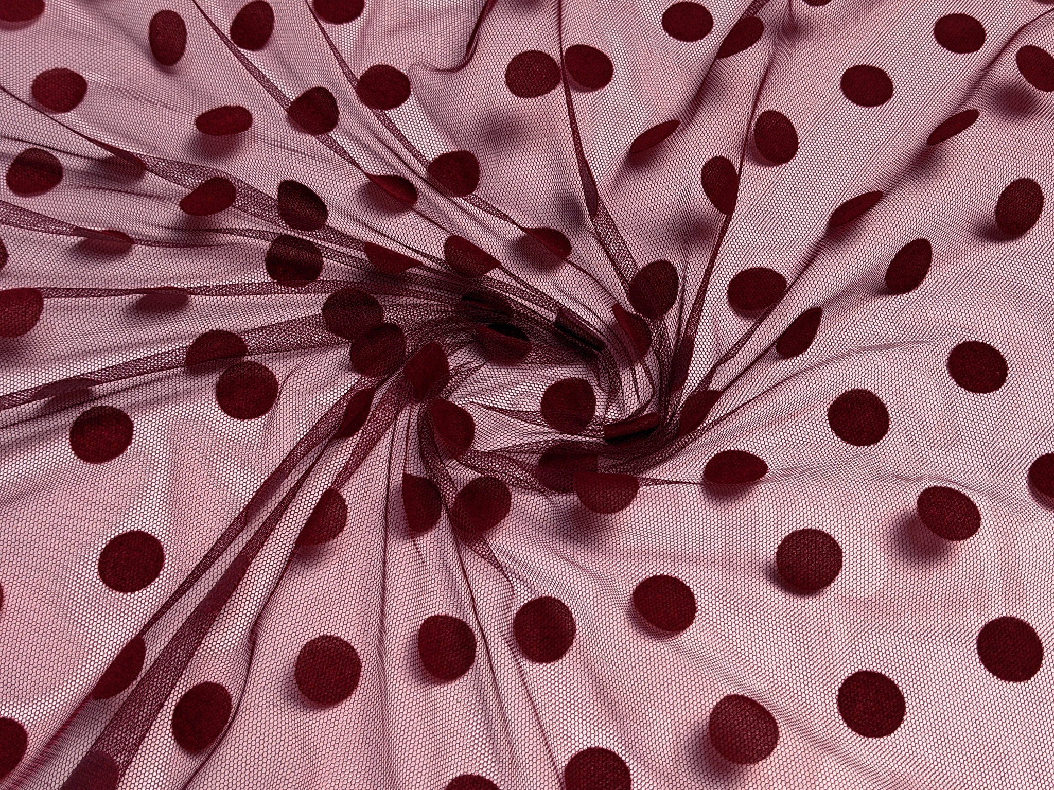 Сітка флок – це легка, невагома та делікатна тканина, яка добре зберігає форму. Полотно не мнеться, тягнеться з одного боку, добре драпірується. Лицьова сторона має бархатисте напилення у вигляді горошків. Сітку флок можна застосовувати для пошиття всього виробу, також може бути декором для будь-яких фасонів одягу та аксесуарів.