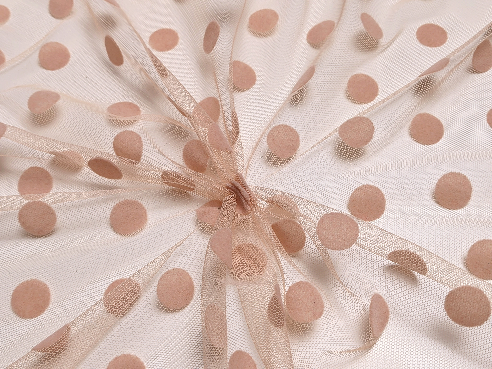 Сітка флок – це легка, невагома та делікатна тканина, яка добре зберігає форму. Полотно не мнеться, тягнеться з одного боку, добре драпірується. Лицьова сторона має бархатисте напилення у вигляді горошків. Сітку флок можна застосовувати для пошиття всього виробу, також може бути декором для будь-яких фасонів одягу та аксесуарів.