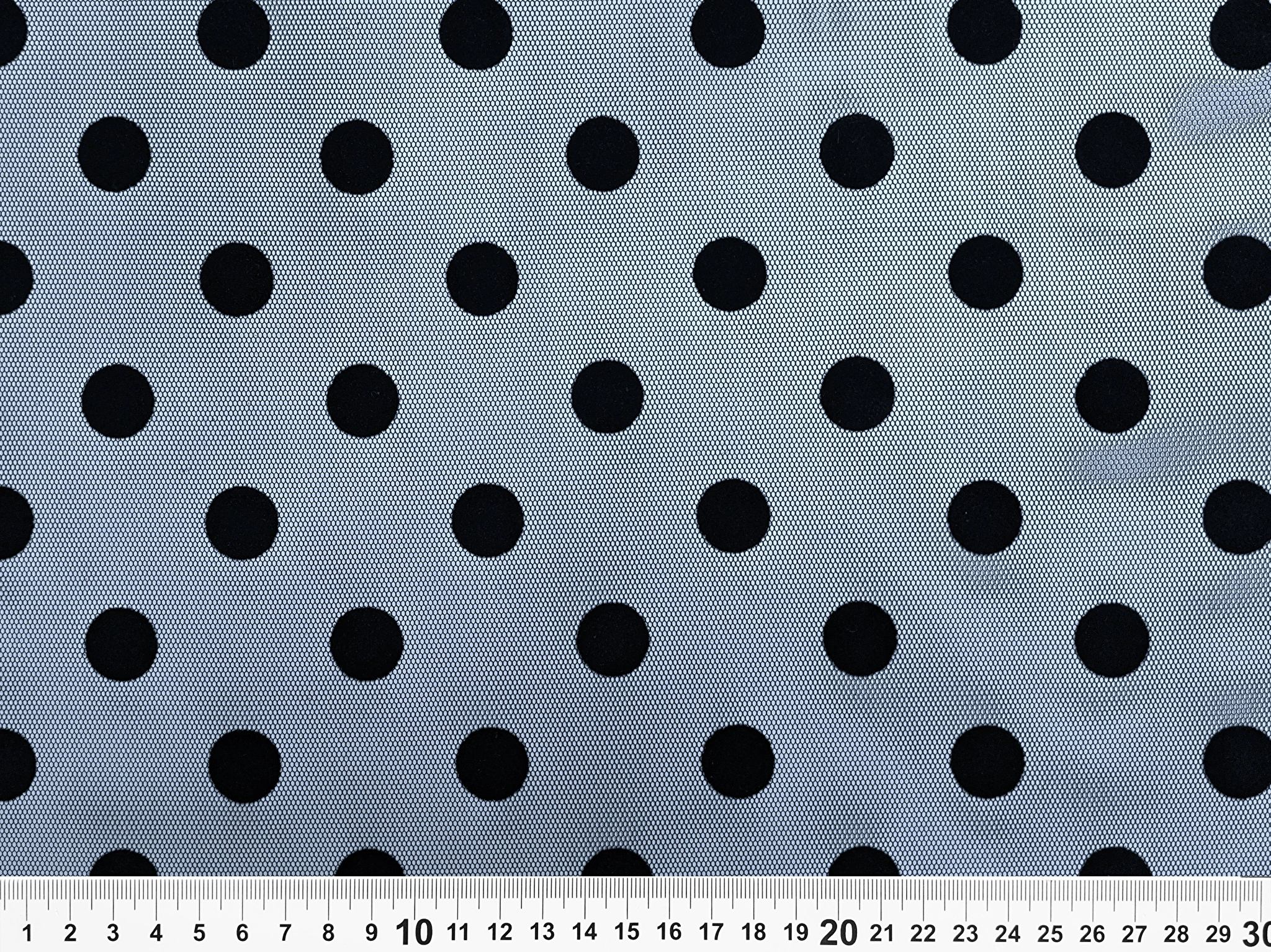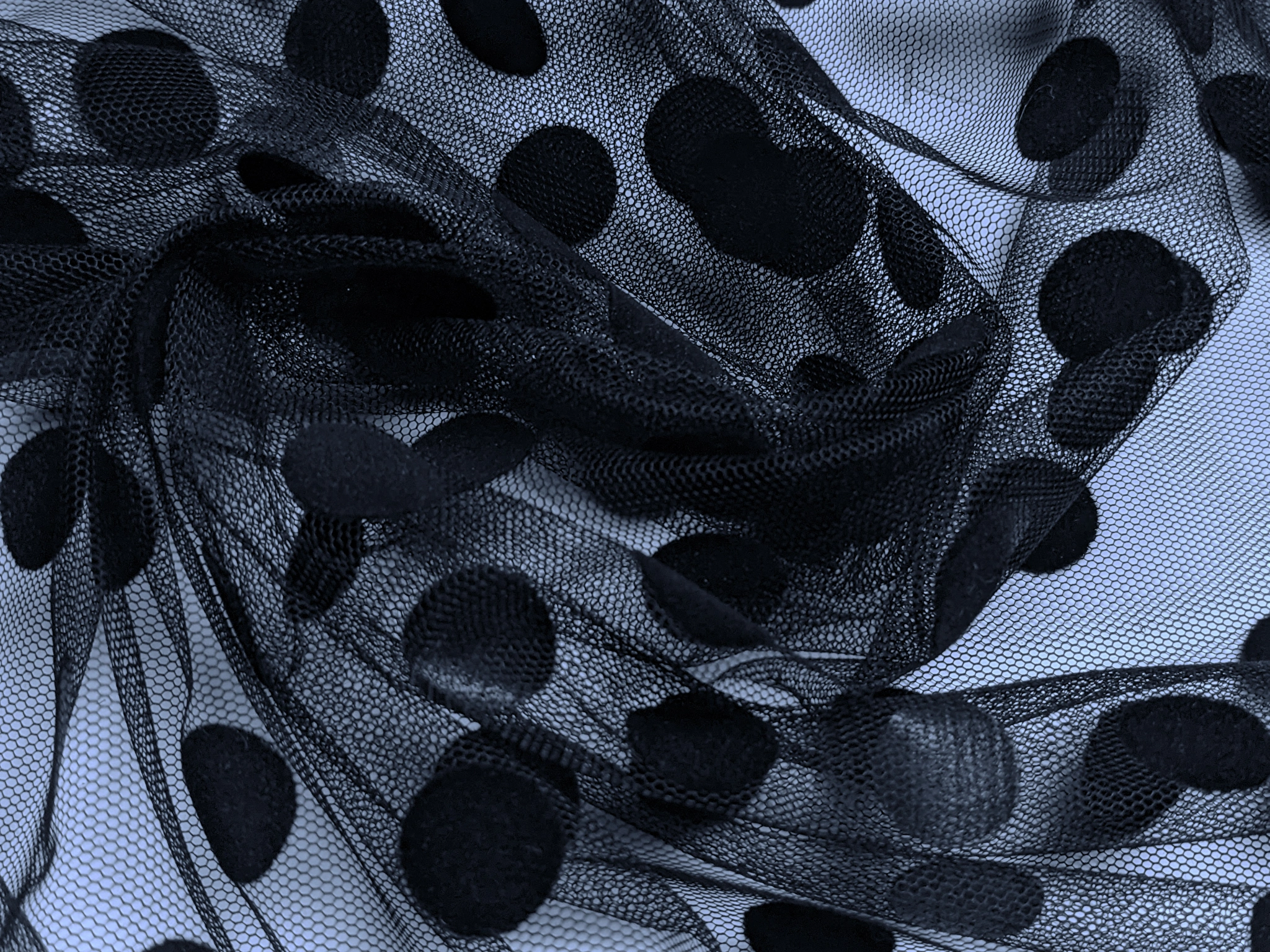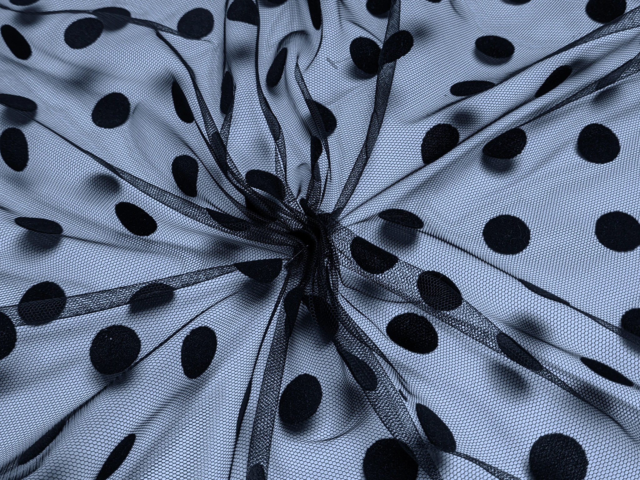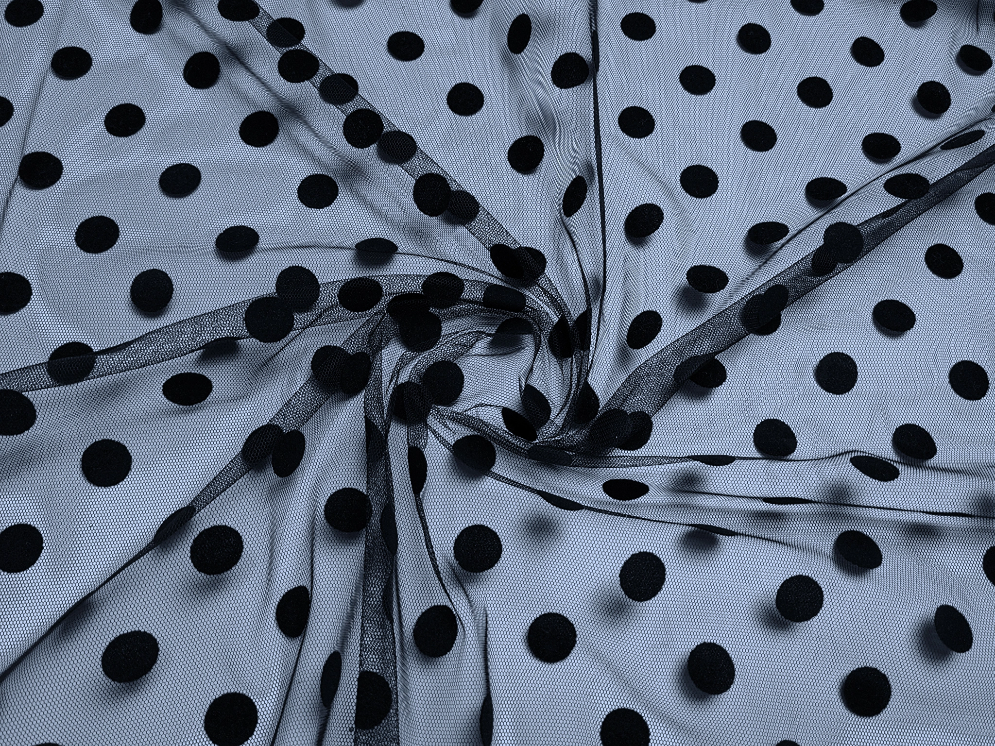 Сітка флок – це легка, невагома та делікатна тканина, яка добре зберігає форму. Полотно не мнеться, тягнеться з одного боку, добре драпірується. Лицьова сторона має бархатисте напилення у вигляді горошків. Сітку флок можна застосовувати для пошиття всього виробу, також може бути декором для будь-яких фасонів одягу та аксесуарів.