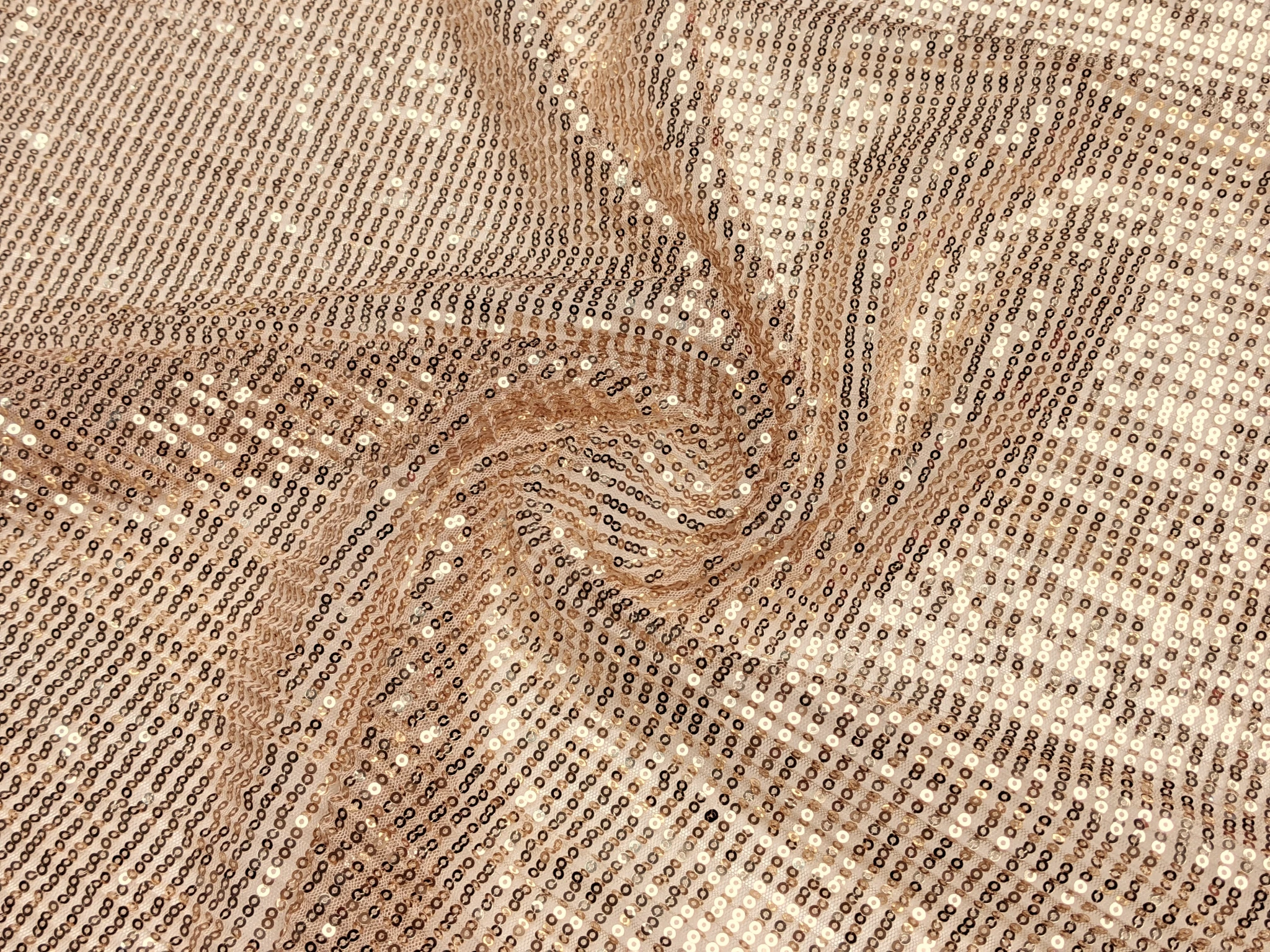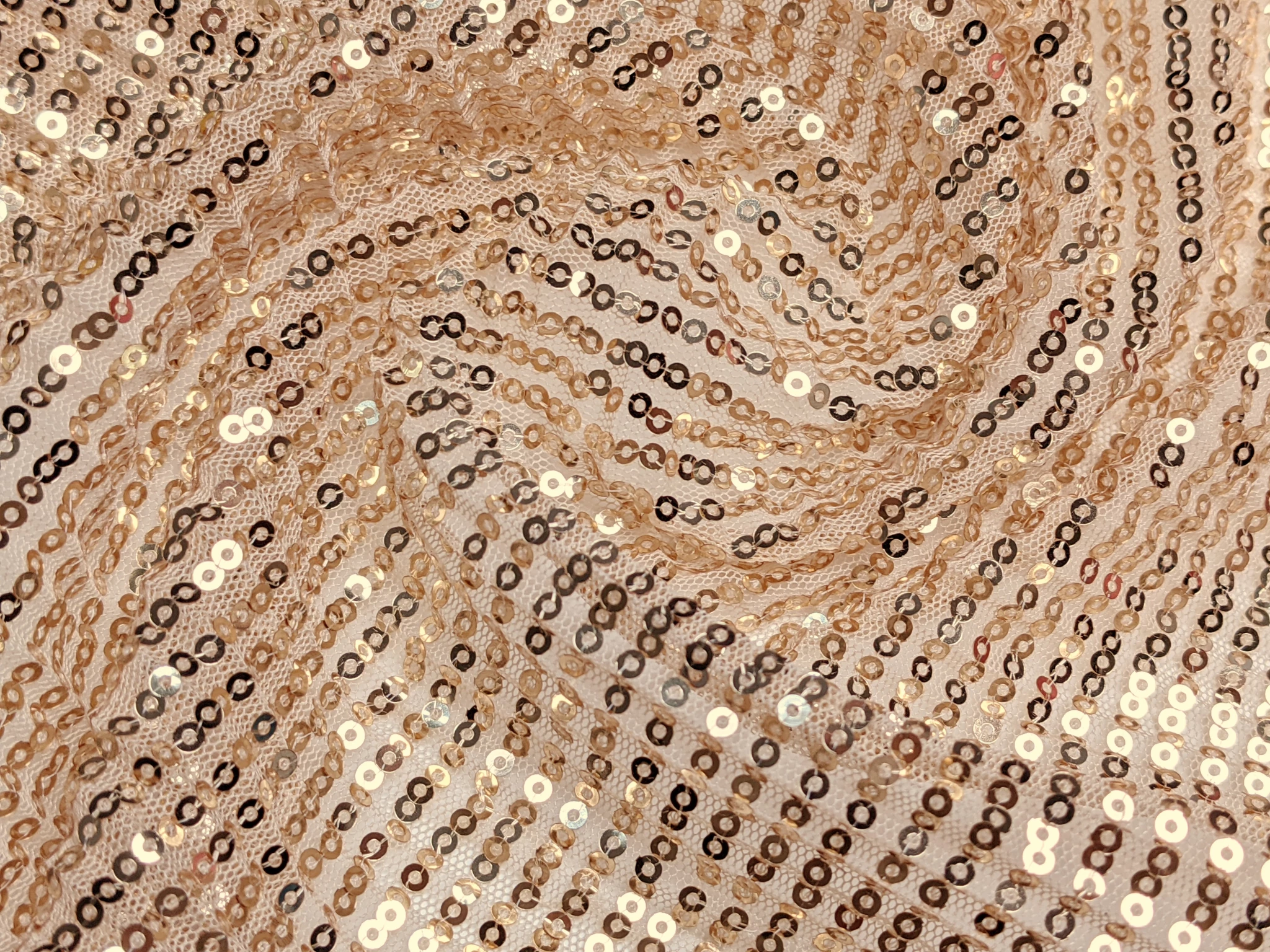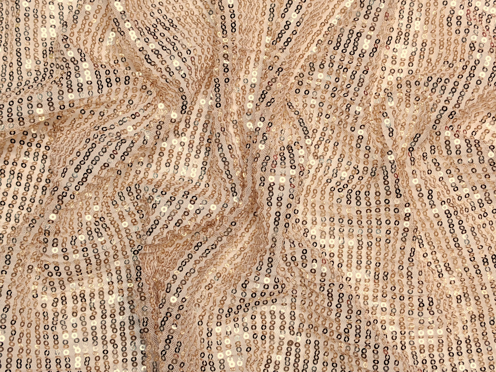 Сітка гофре з паєтками - це легка, напівпрозора сітка з нашитими паралельно дрібними паєтками (вздовж кромки). Сітка має невеликий поперечний стрейч, що вимагає враховувати під час пошиття. Структура сітки виконана як гофре поперек полотна, глибина складки 2 мм. Тканина виглядає дуже ошатно, ефектно та казково.