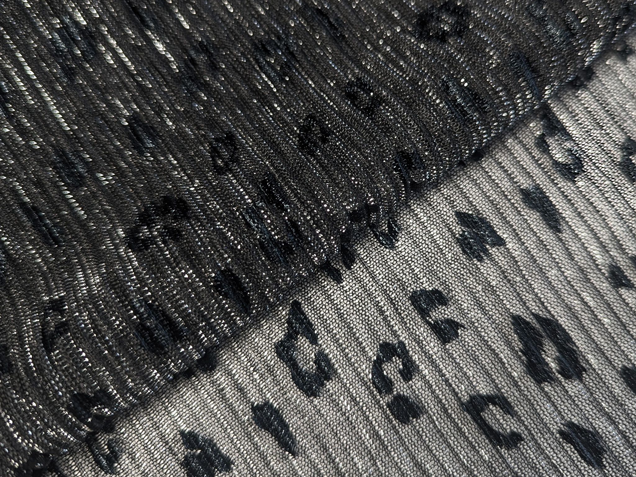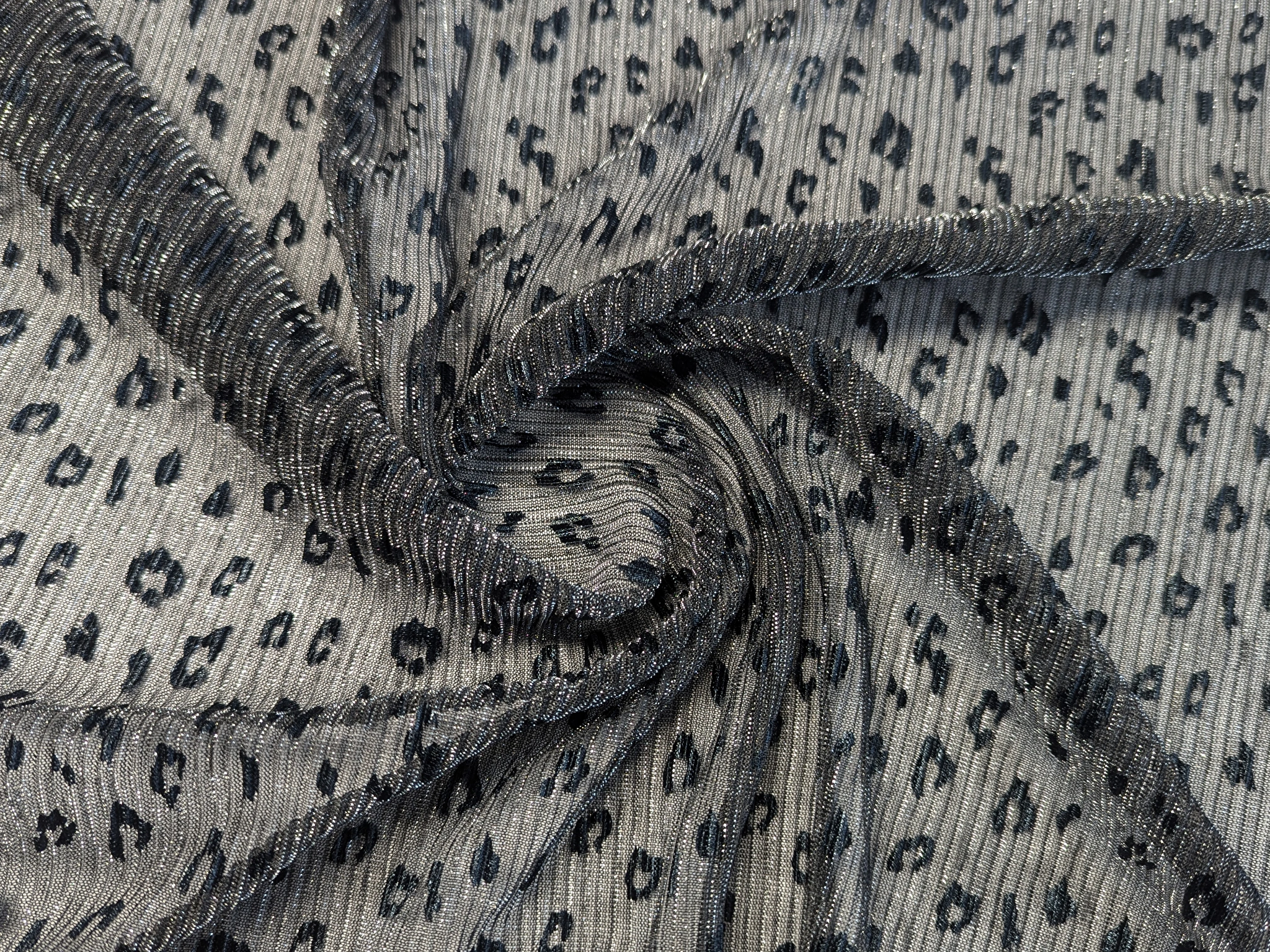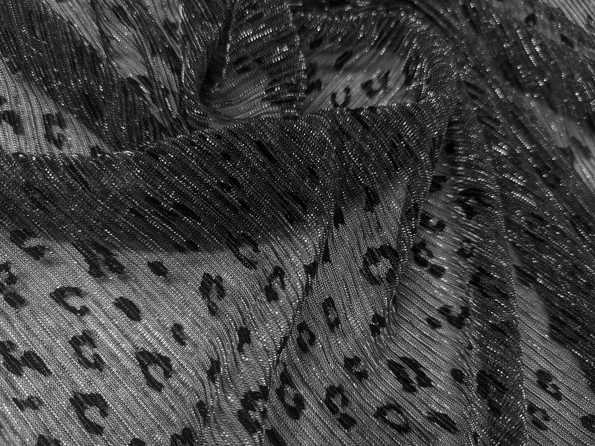 М'яка і приємна на дотик сітка з люрексом має плісировку, завдяки якій тканина виглядає ще витонченіше і святково, а витканий на тканины малюнок в дизайні леопард та горошки додає яскраву та екстравагантну нотку.