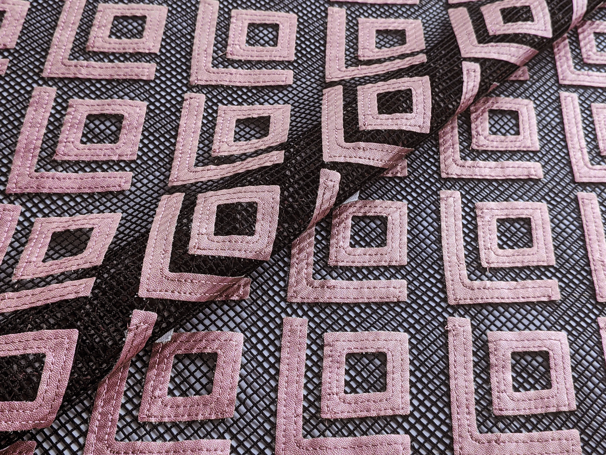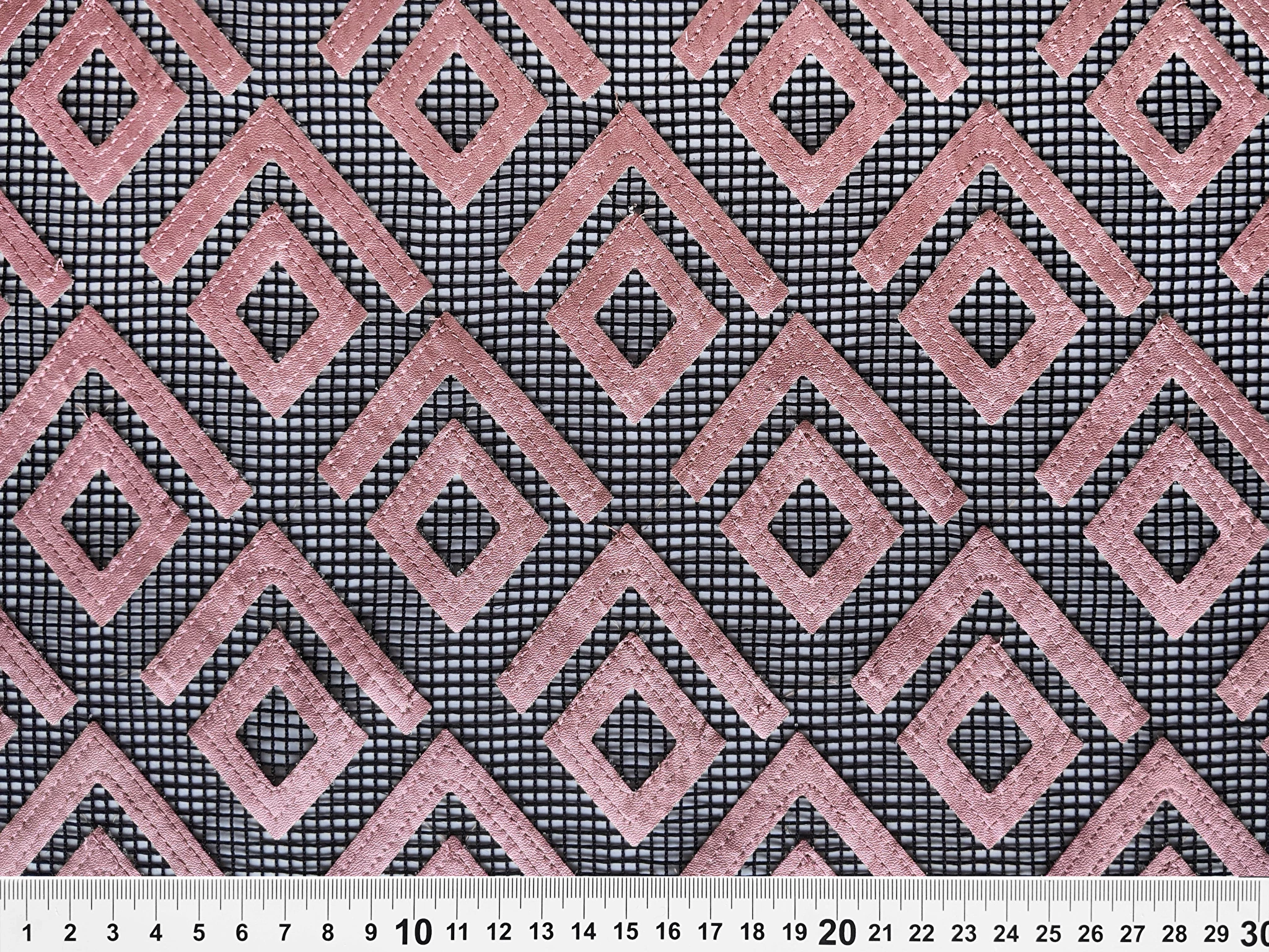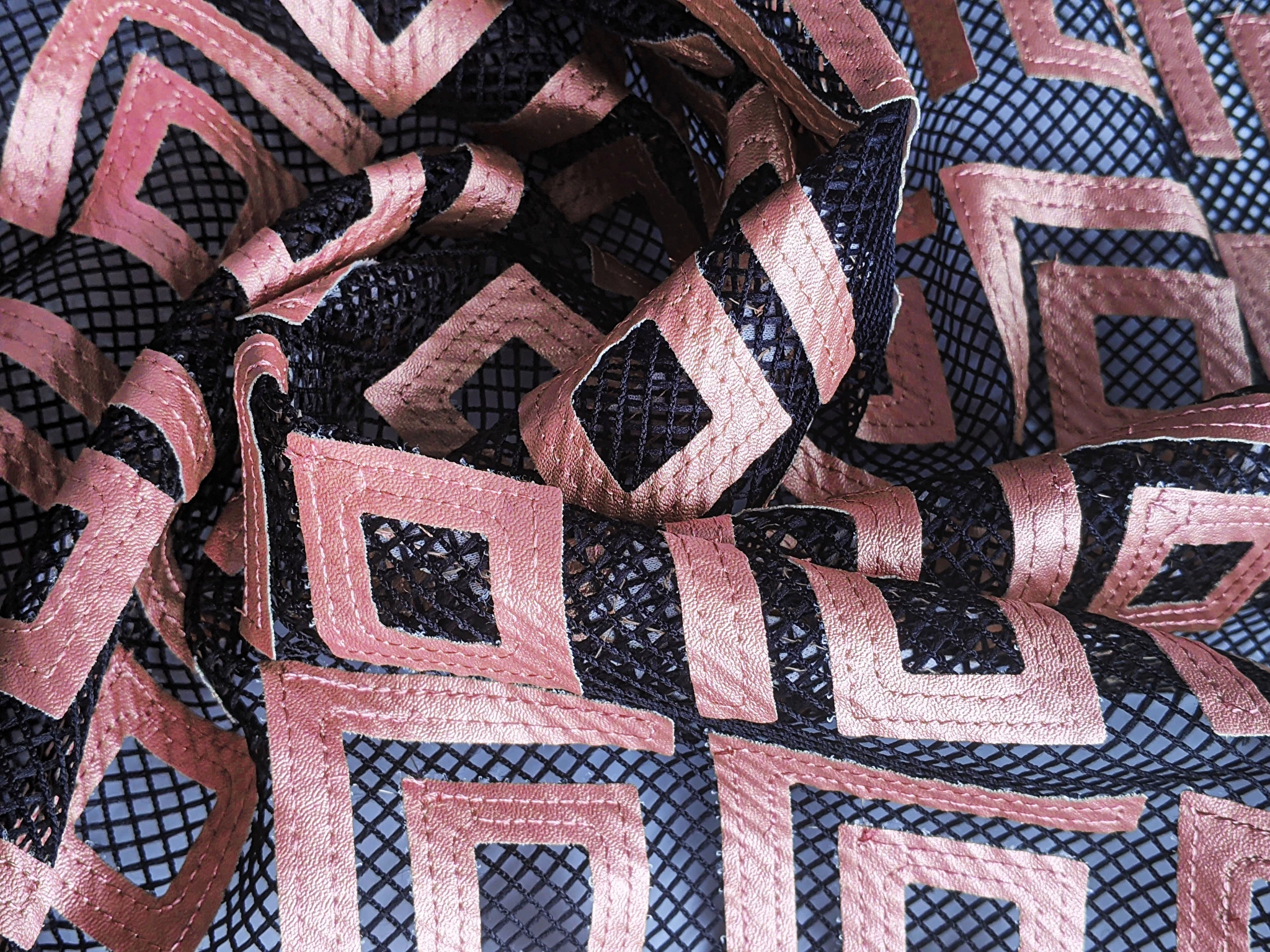 Оригінальні ромби зі шкірозамінника виконані на крупній сітці, яка тримає форму, при цьому м'яка, приємна до тіла. У виробі така сітка може застосовуватися в якості вставок, окремих деталей одягу.