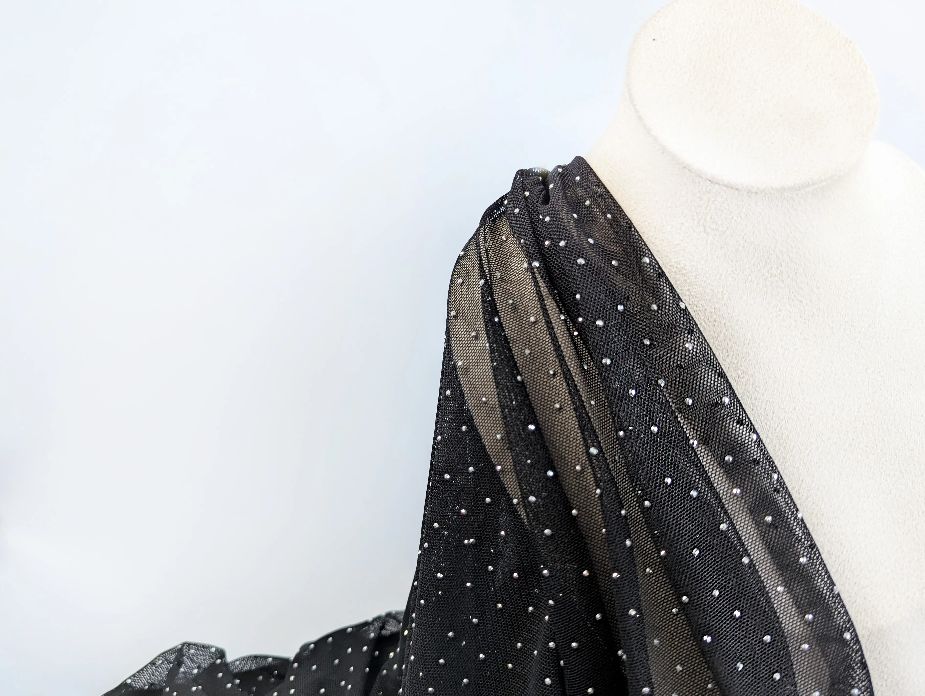 Сітка стрейч зі стразами — це вишукана, легка та еластична тканина, прикрашена дрібними сяйливими стразами. Вона має м’яку структуру, добре тягнеться й красиво драпірується, підкреслюючи фігуру. Стрази надійно закріплені та створюють ефект легкого мерехтіння під час руху, надаючи виробу розкоші й витонченості.