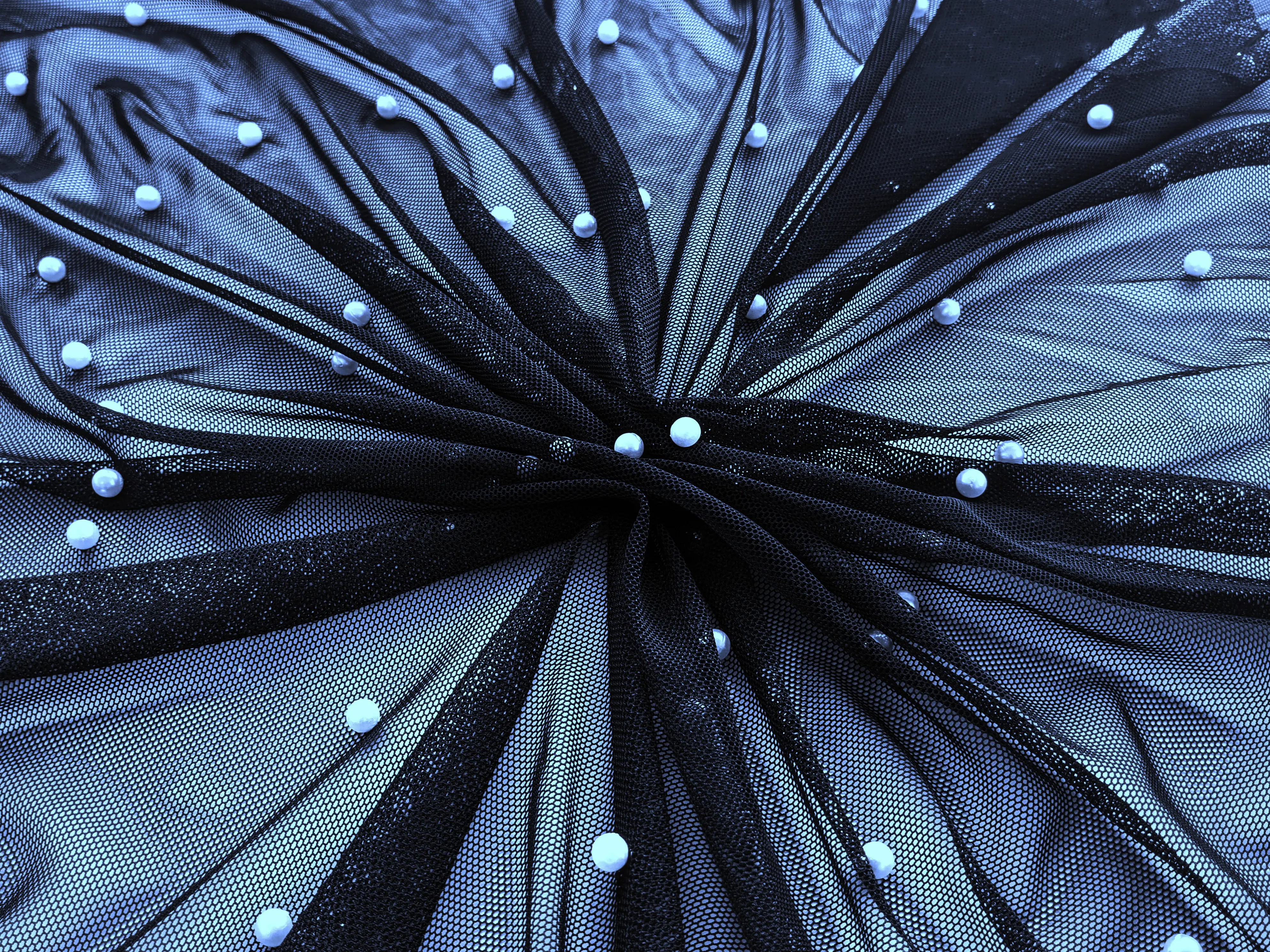 Сітка стрейчева з перлинами - це дуже приємне і м'яке на дотик полотно. У складі тканини є спандекс і завдяки якому полотно тягнеться в обидві сторони. З лицьового боку хаотично закріплений перли білого кольору, який надає ніжності і створює святковий настрій. Перлинки міцно закріплені заклепками. Полотно не мнеться, що не примхливе в догляді.