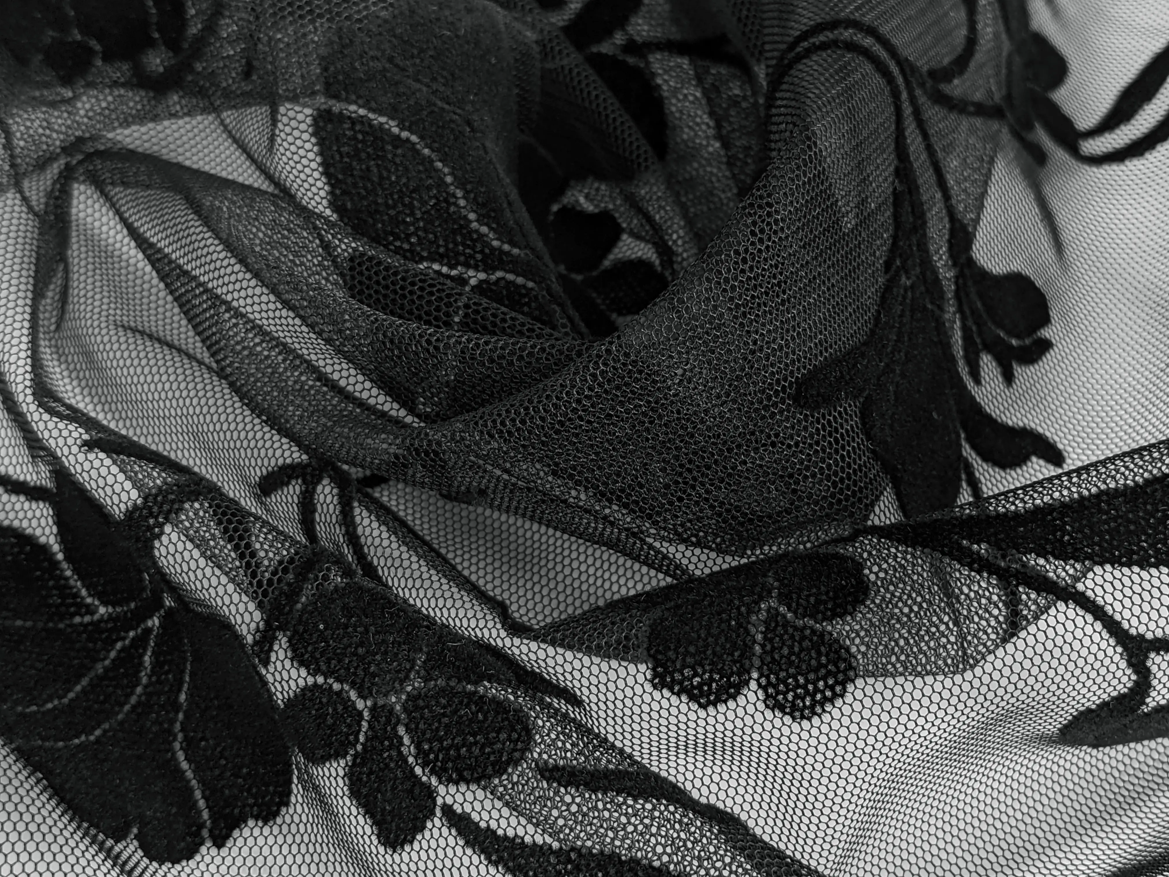 Чорна сітка з флоком стане відмінним доповненням в пошитті будь-якого наряду, будь то вечірнє плаття, блуза або костюм в спортивному стилі.