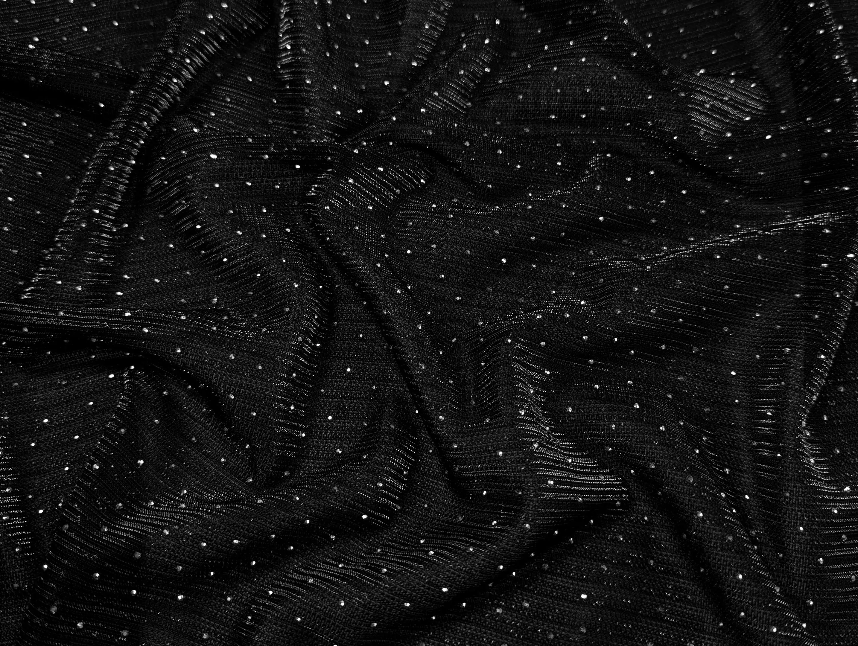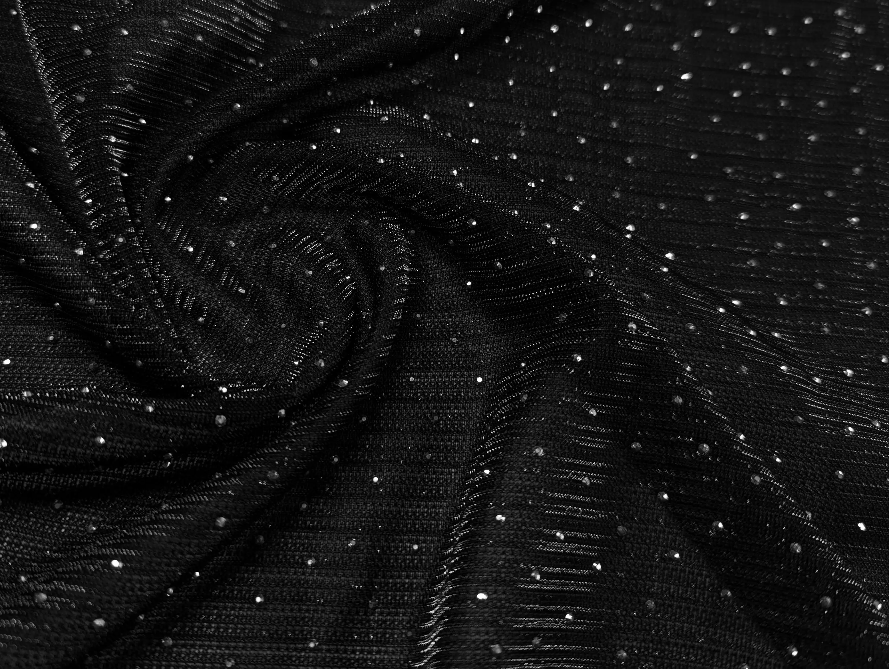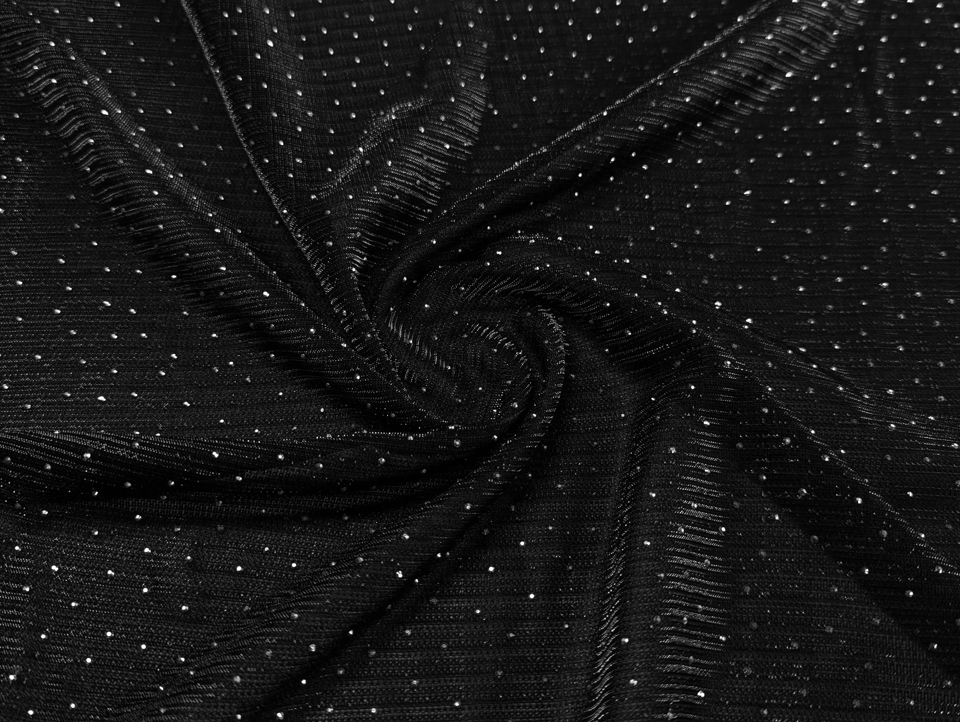 Сітка зі стразами - легка, напівпрозора тканина з ефектною обробкою - поєднує в собі мерехтливий блиск люрексової нитки, вишукане сяйво страз і рельєфні поперечні смужки, що створюють текстурний малюнок. Матеріал м'який, еластичний по ширині полотна, не мнеться, добре драпірується. Поверхня шорстка на дотик, виворіт - гладкий. Просвічується, в залежності від типу виробу може знадобитися підкладка.