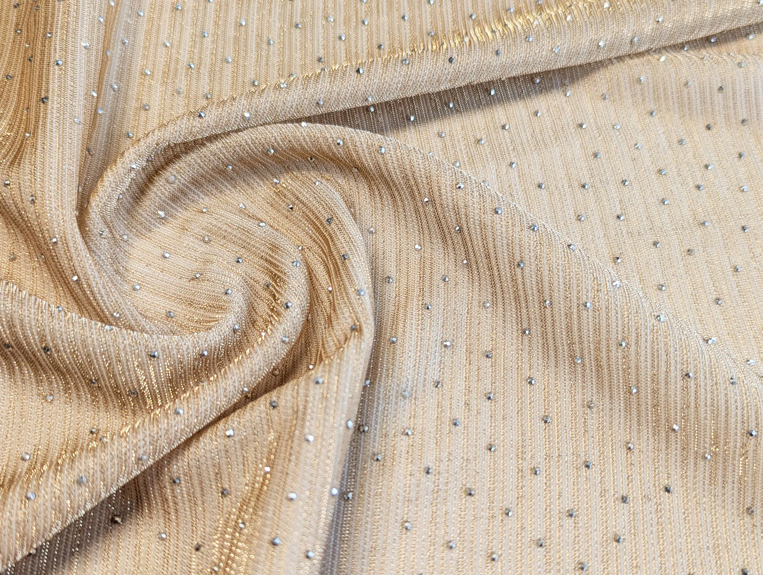Сітка зі стразами - легка, напівпрозора тканина з ефектною обробкою - поєднує в собі мерехтливий блиск люрексової нитки, вишукане сяйво страз і рельєфні поперечні смужки, що створюють текстурний малюнок. Матеріал м'який, еластичний по ширині полотна, не мнеться, добре драпірується. Поверхня шорстка на дотик, виворіт - гладкий. Просвічується, в залежності від типу виробу може знадобитися підкладка.
