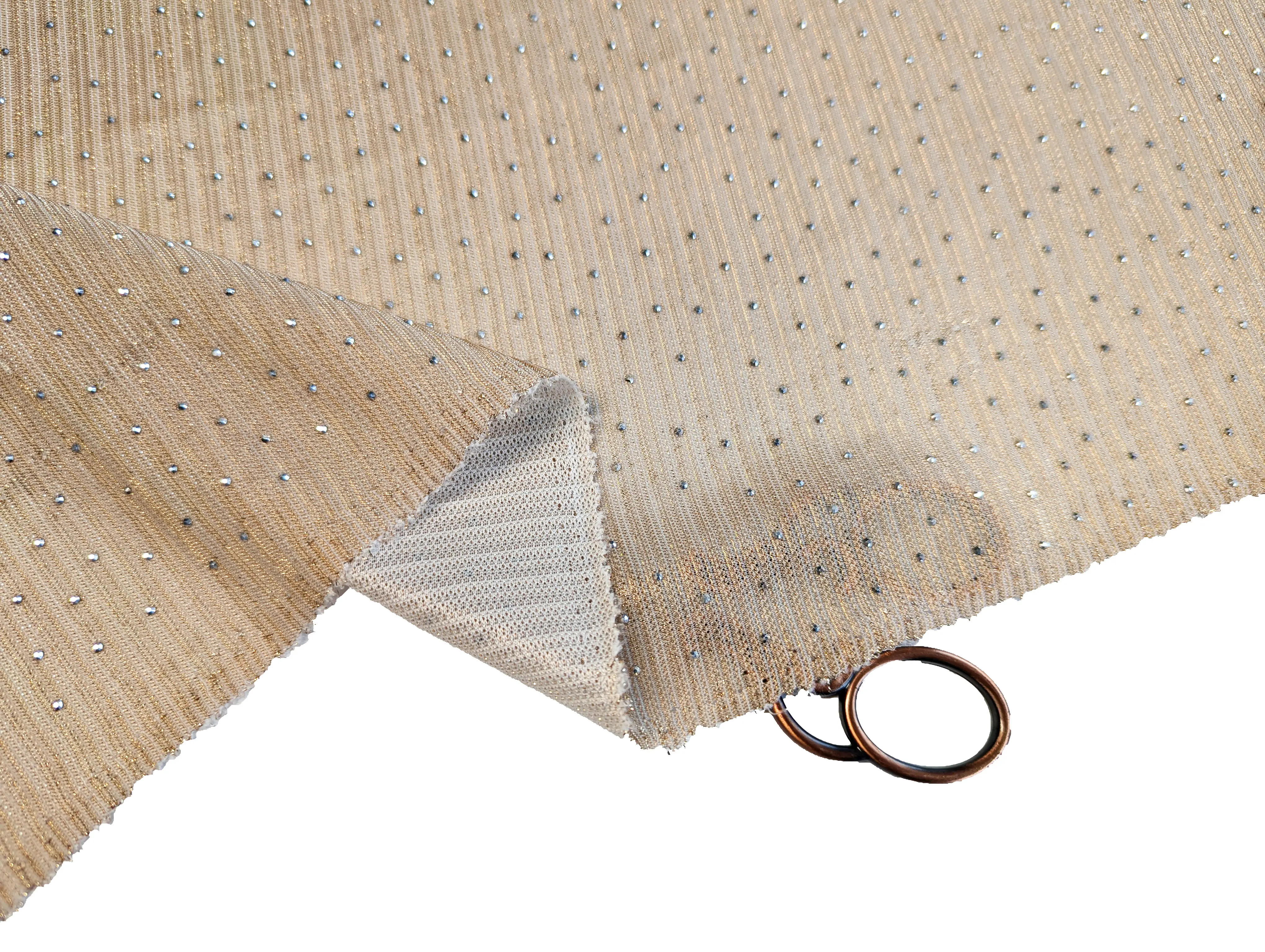 Сітка зі стразами - легка, напівпрозора тканина з ефектною обробкою - поєднує в собі мерехтливий блиск люрексової нитки, вишукане сяйво страз і рельєфні поперечні смужки, що створюють текстурний малюнок. Матеріал м'який, еластичний по ширині полотна, не мнеться, добре драпірується. Поверхня шорстка на дотик, виворіт - гладкий. Просвічується, в залежності від типу виробу може знадобитися підкладка.