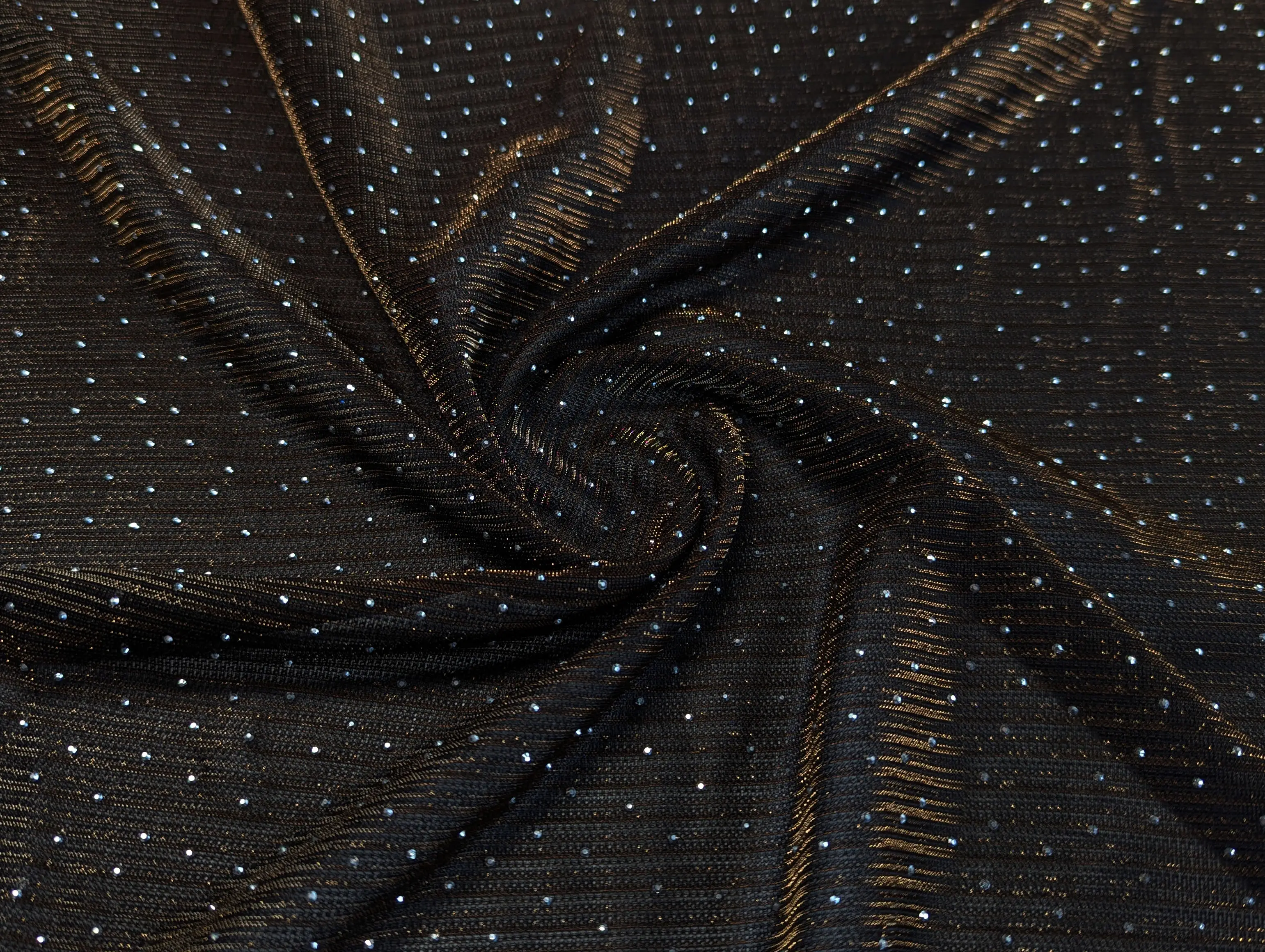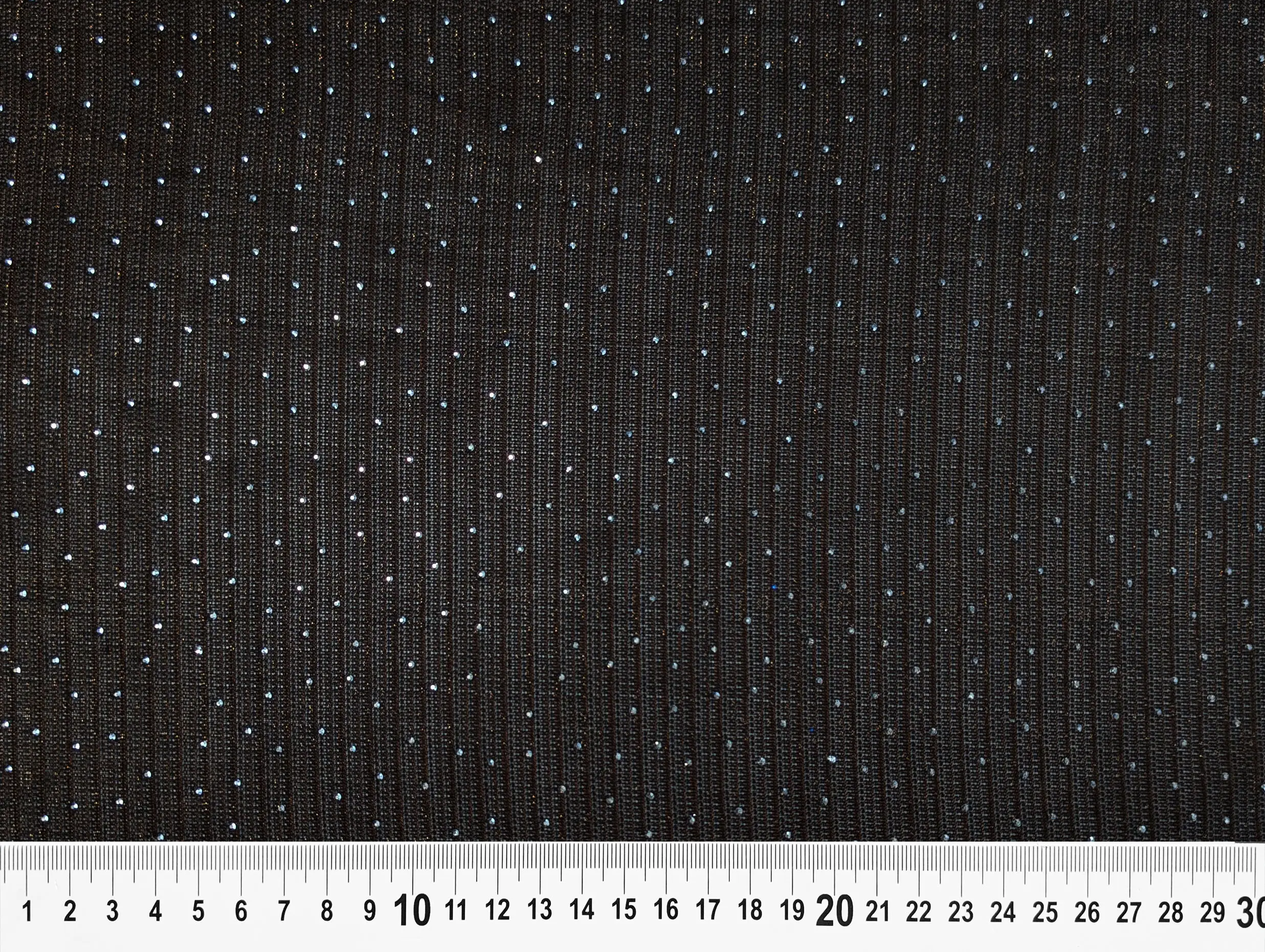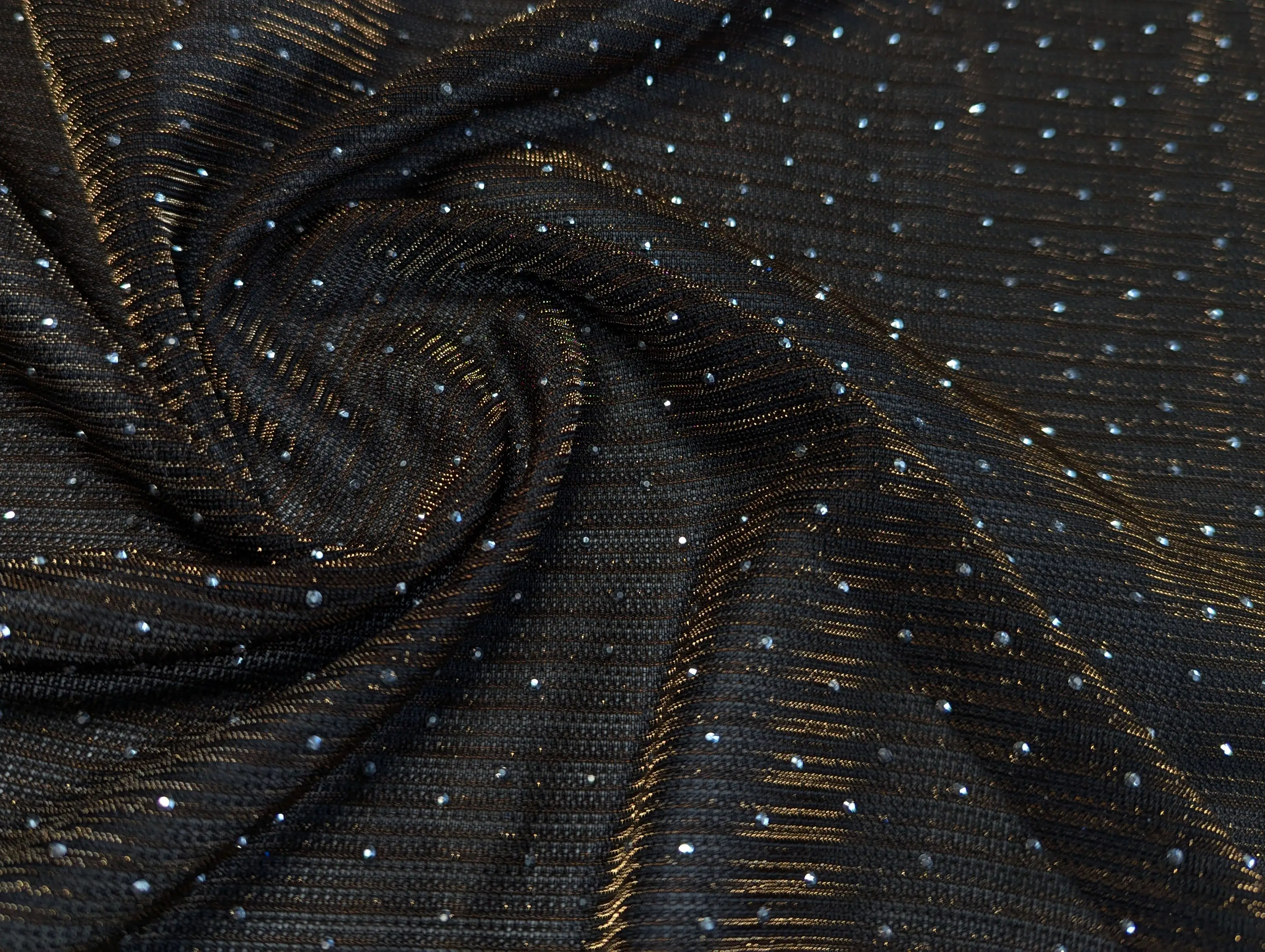 Сітка зі стразами - легка, напівпрозора тканина з ефектною обробкою - поєднує в собі мерехтливий блиск люрексової нитки, вишукане сяйво страз і рельєфні поперечні смужки, що створюють текстурний малюнок. Матеріал м'який, еластичний по ширині полотна, не мнеться, добре драпірується. Поверхня шорстка на дотик, виворіт - гладкий. Просвічується, в залежності від типу виробу може знадобитися підкладка.
