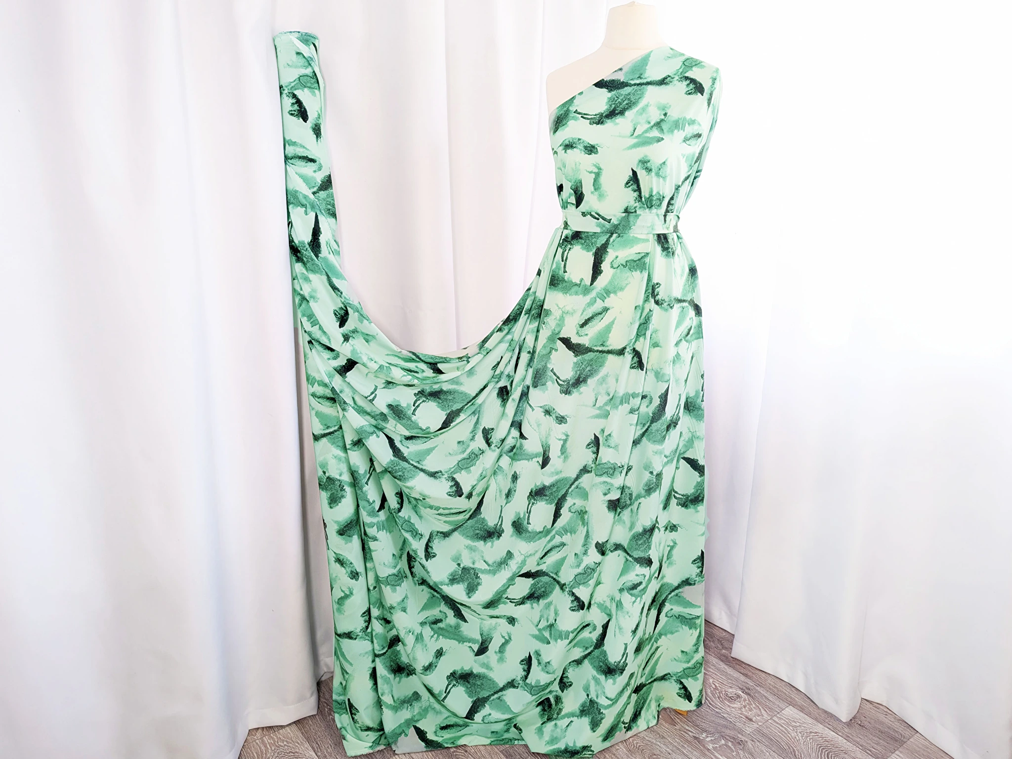 Софт принт – це гладке, легке і приємне на дотик полотно. У складі присутній спандекс, завдяки якому софт трохи тягнеться по одній стороні. Тканина злегка просвічуються на світлі, вона не примхлива у догляді, практично не мнеться. Полотно гарно драпірується.
