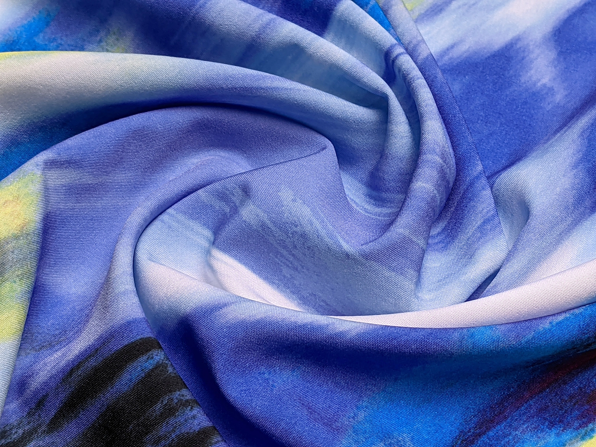Щільна віскоза софт - легка, м'яка, приємна до тіла тканина, що має ковзний ефект. Полотно трохи шелестяче, чудово драпірується, створюючи красиві складки. У складі полотна є невеликий відсоток спандексу, що дозволяє йому трохи тягнуться у всіх напрямках. Тканина не мнеться, не просвічується.