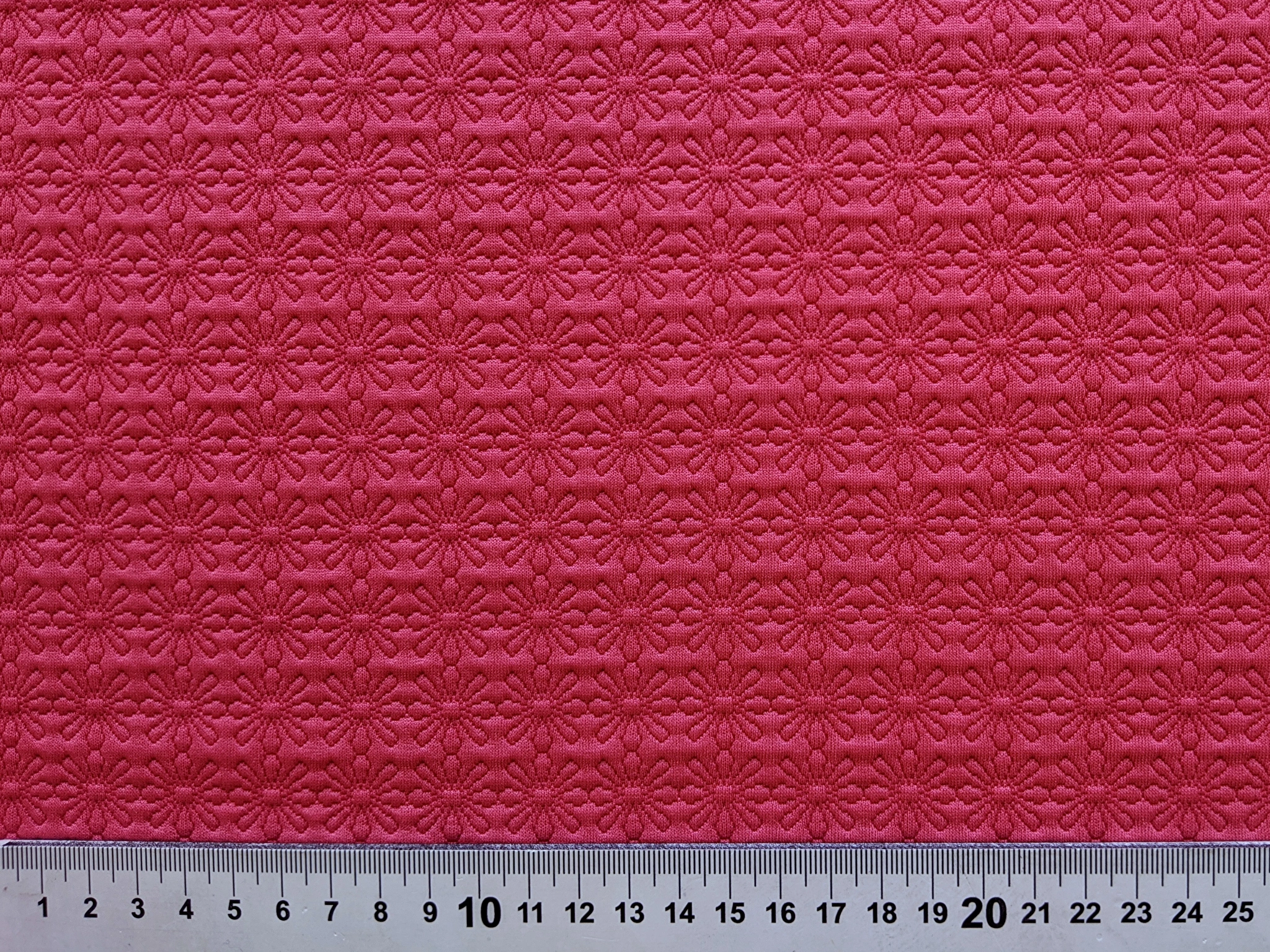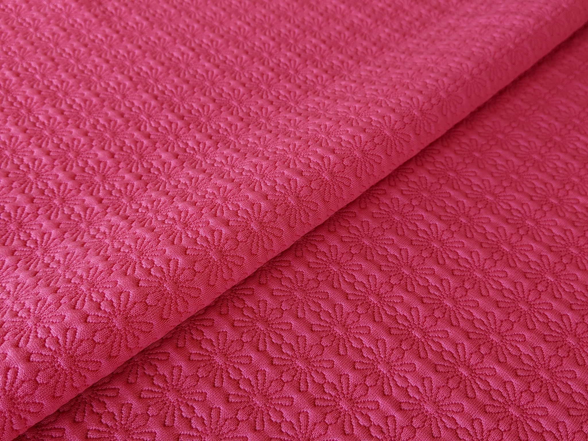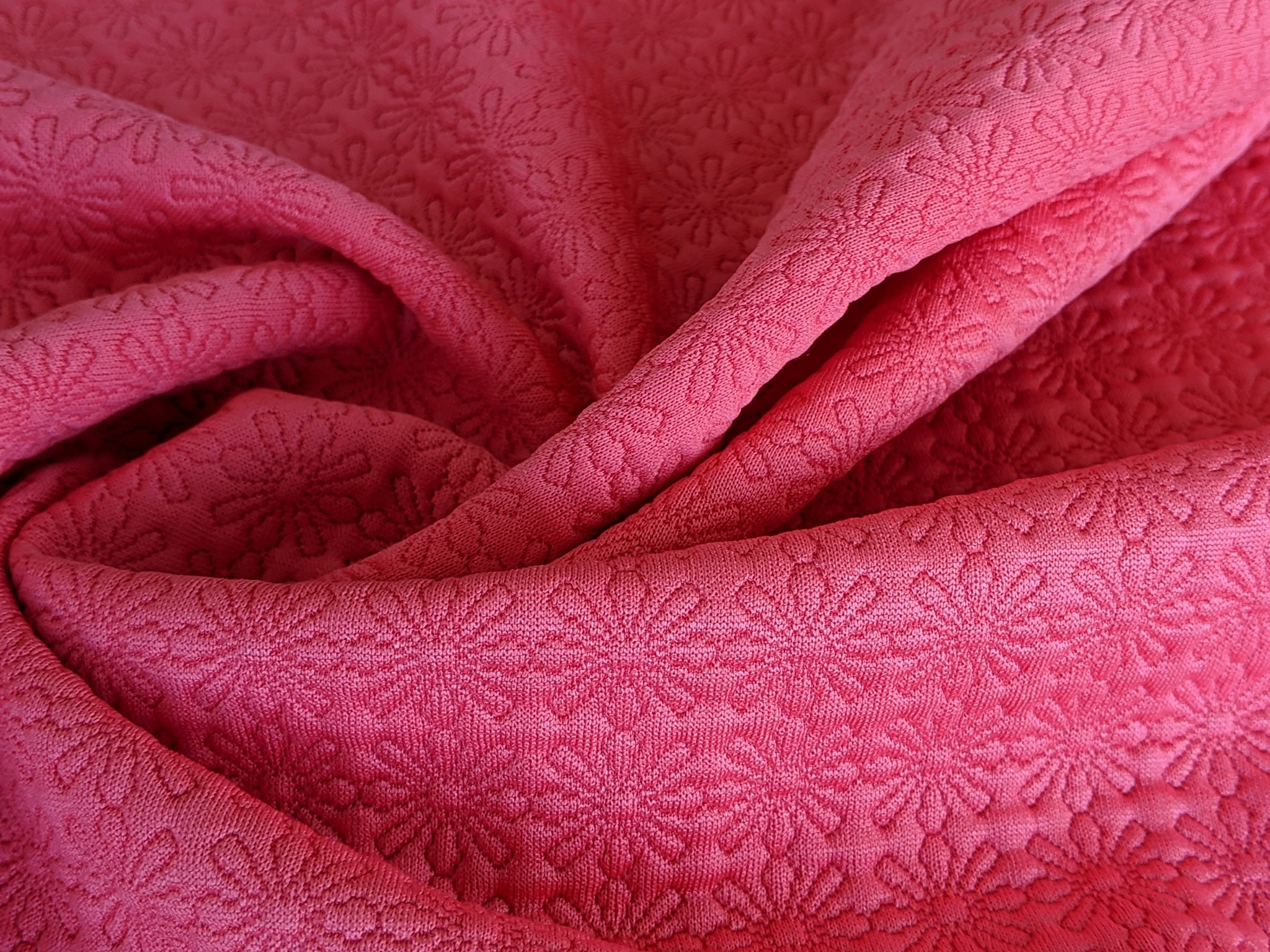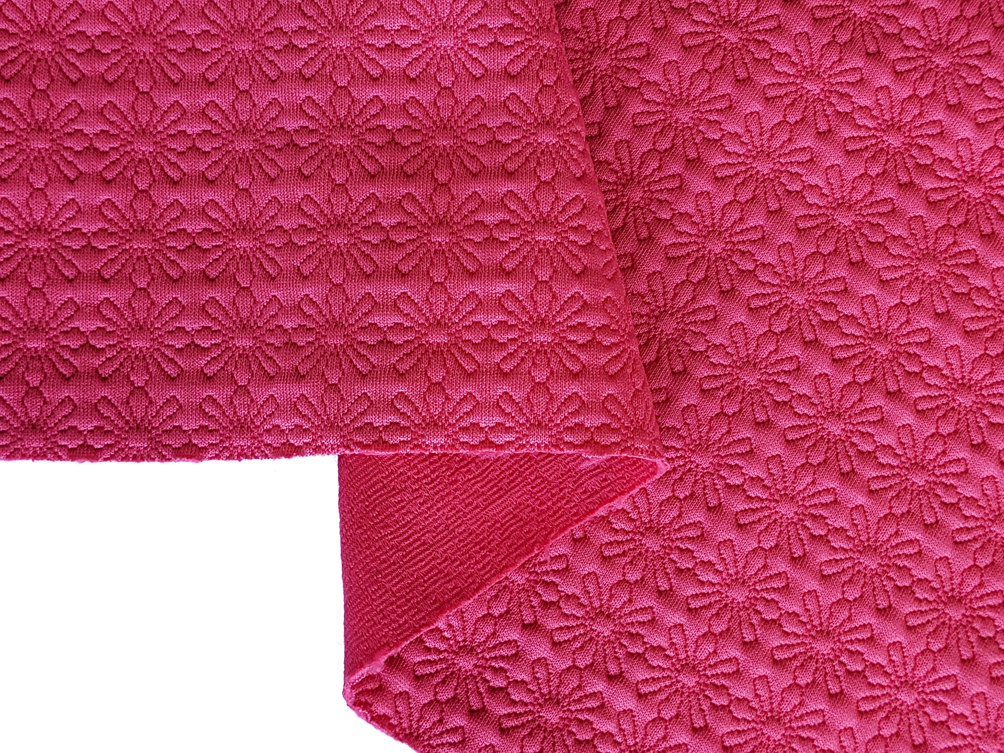 Зара жакард - трикотаж з фактурною поверхнею, завдяки жакардовому плетінню, на поверхні утворюється об'ємний, рельєфний малюнок, що створює цікавий візуальний і тактильний ефект, виворіт має більш гладку структуру. Матеріал м'який, еластичний, пружний, добре зберігає форму, не просвічується, не мнеться, добре драпірується.