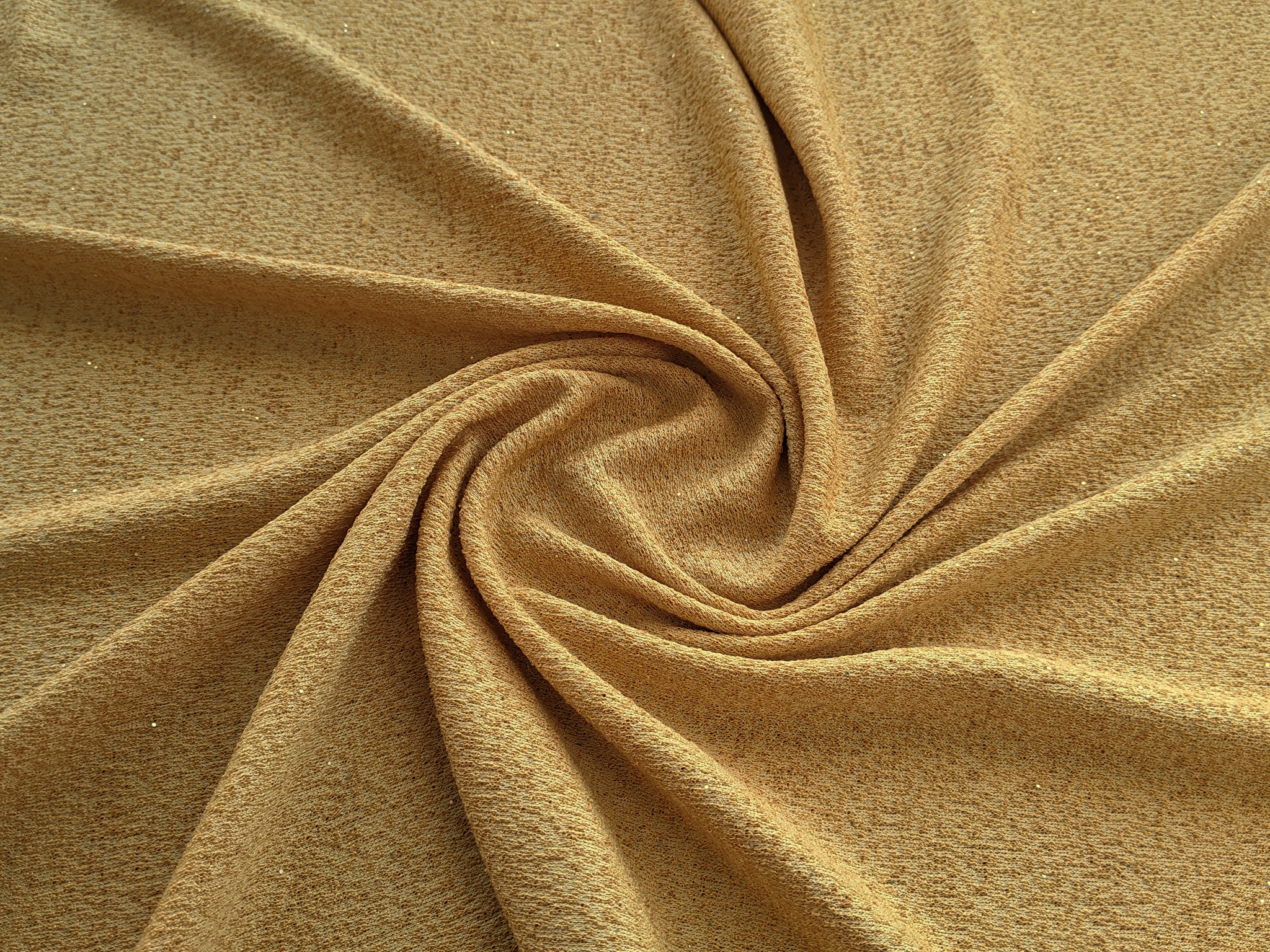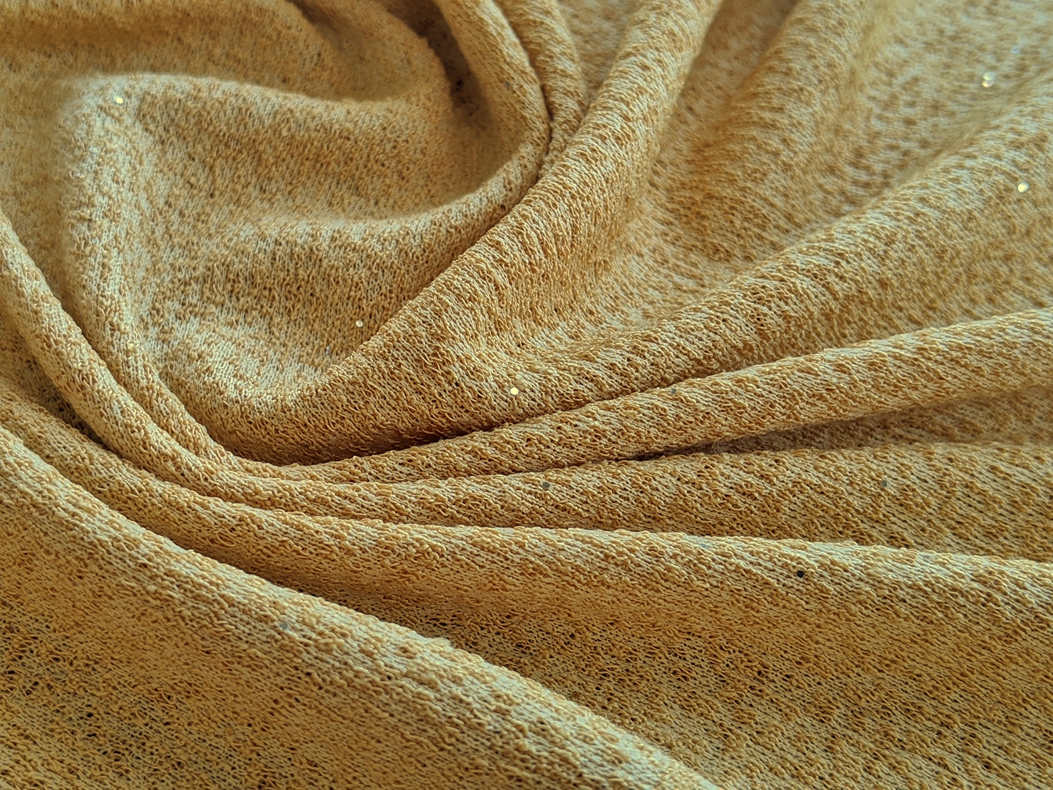 Трикотаж Маракеш - це тонке трикотажне полотно. Дуже добре тягнеться в обидві сторони. Лицьова сторона трохи фактурна, нагадує плетіння, виворітна сторона гладка. Тканина трохи мерехтить, тк на лицьовій стороні вшиті дуже маленькі блискітки. Тканина не мнеться і красиво драпірується. Має невеликий просвіт на світлі, на тілі не просвічується. На дотик трохи шорстка, але виворіт м'який. Застосовується для пошиття спідниць, суконь, кардиганів, сарафанів і костюмів.