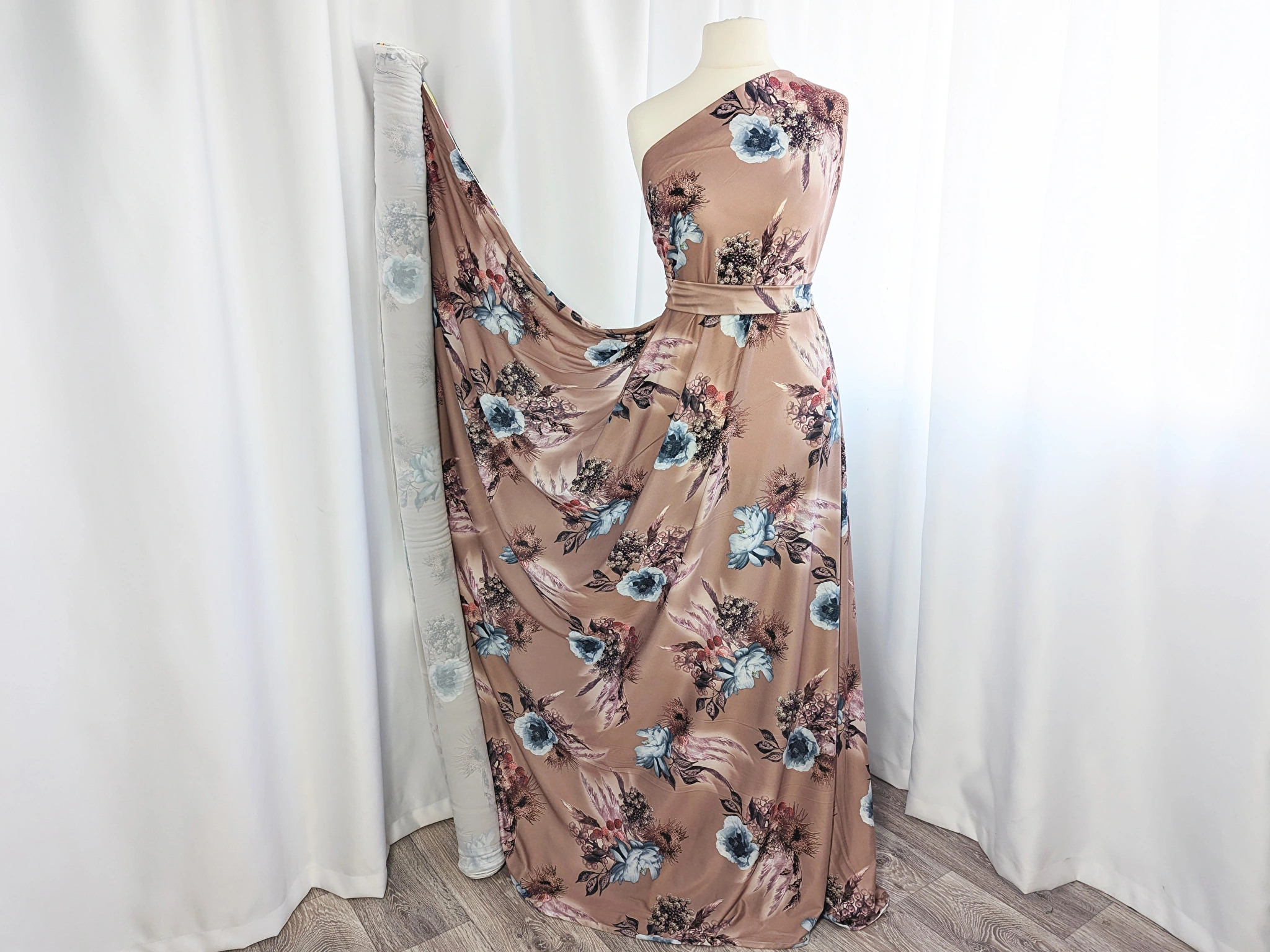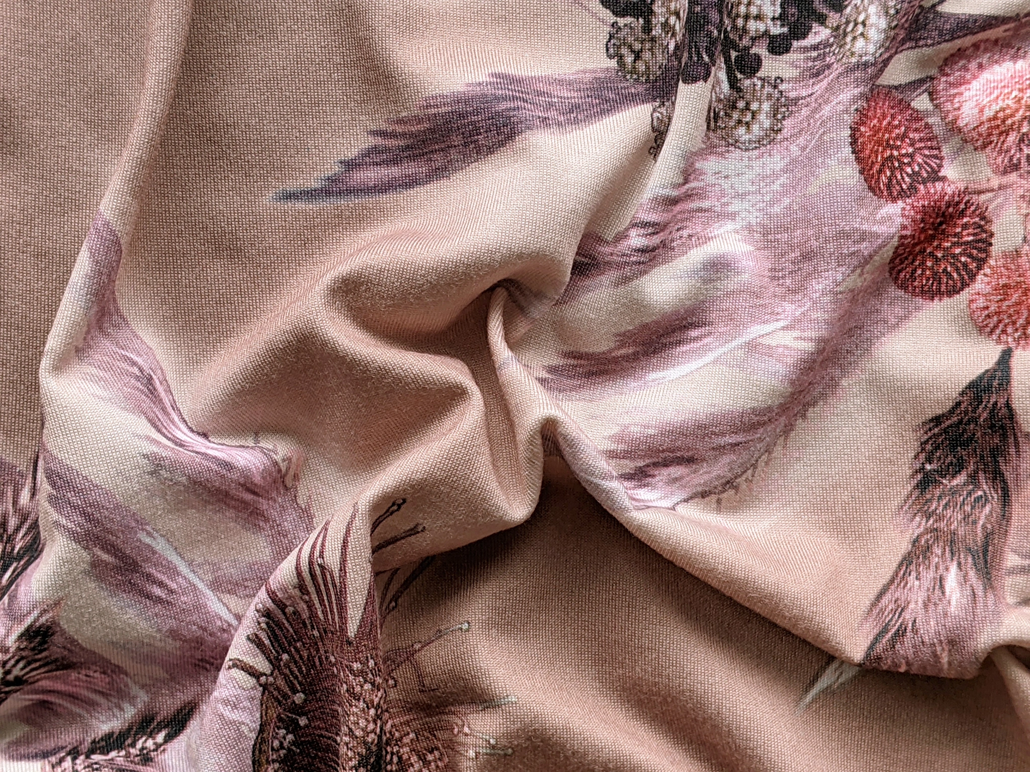 Трикотаж масло - це м'яке, еластичне, легке та приємне до тіла полотно. У складі тканини присутній спандекс, завдяки чому тканина добре тягнеться в обидва боки. Структура полотна гладка, приємна на дотик, не мнеться. Тканина комфортна в носінні, красиво лягає по фігурі, не сковує рухів і не примхлива у догляді.