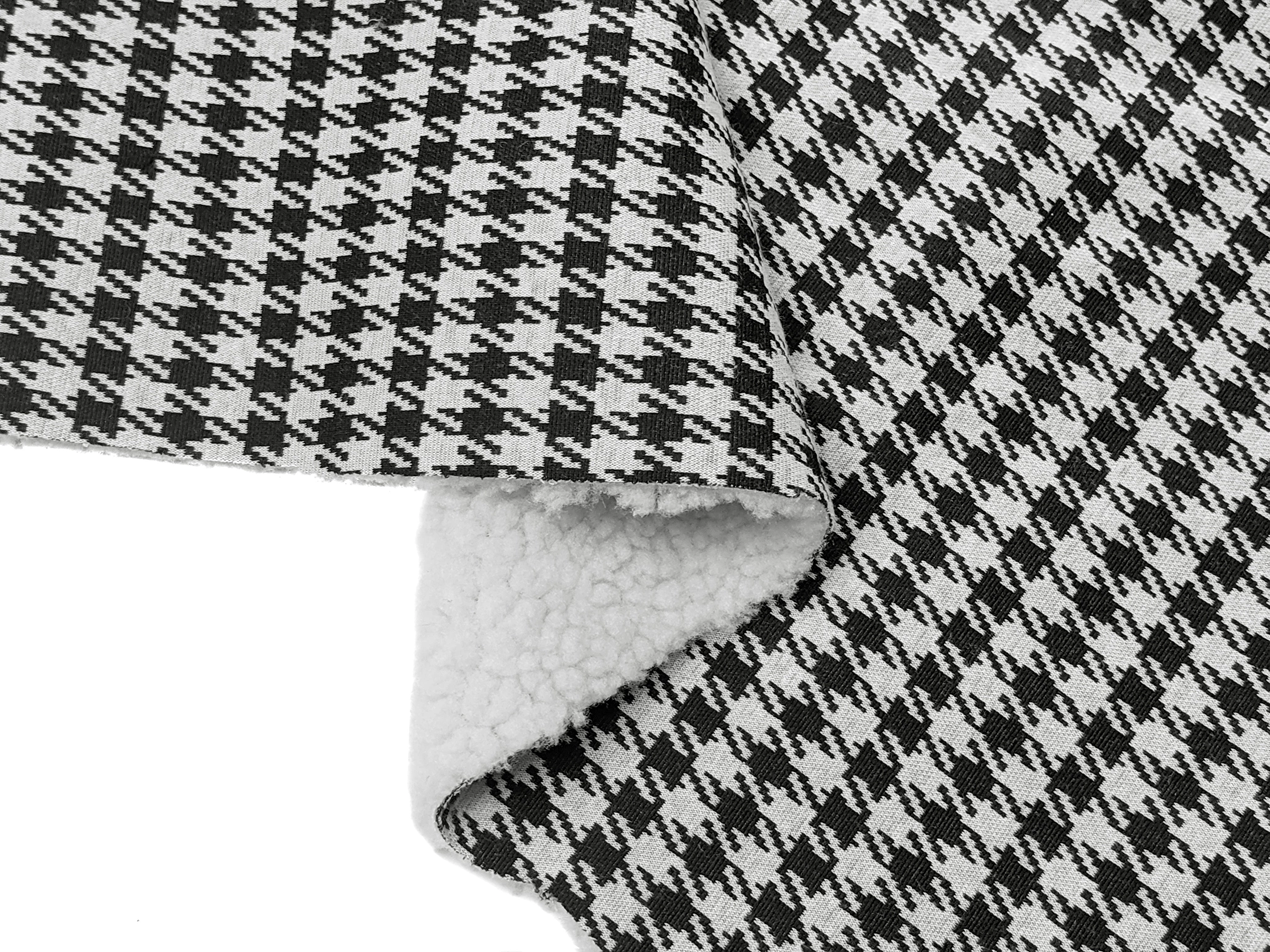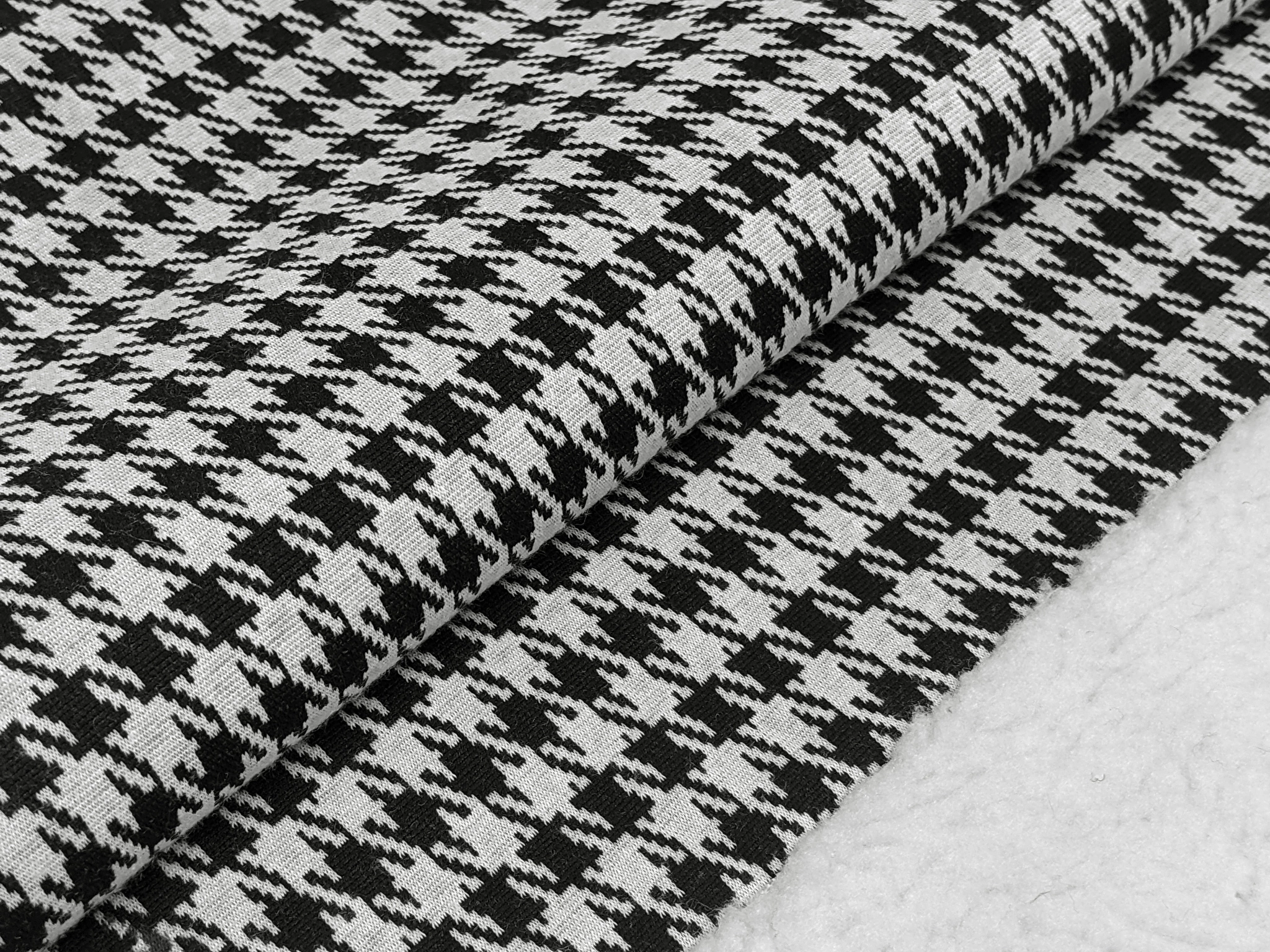 Трикотаж Шанель на овчині - це полотно з хутром з виворітного боку і трикотажною лицьовою стороною. Класичні чорно-білі дизайни - гусяча лапка і клітинка - завжди актуальні як для пошиття одягу для дорослих, так і дітей. Тканина щільна, дуже тепла, не продувається, тримає форму. З даного виду матеріалу рекомендуємо зшити жакет, бомбер, теплий костюм або худі, а також стильні головні убори для осінньо-зимового періоду.