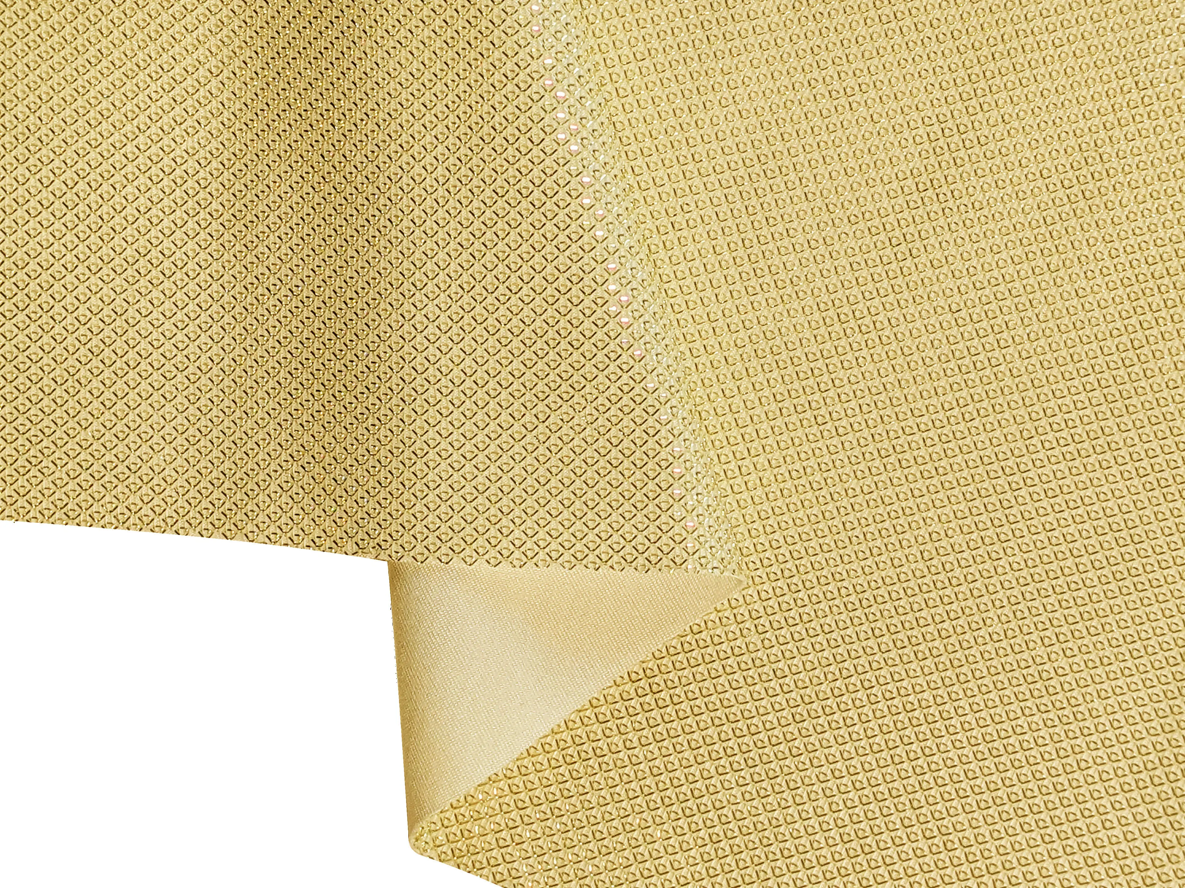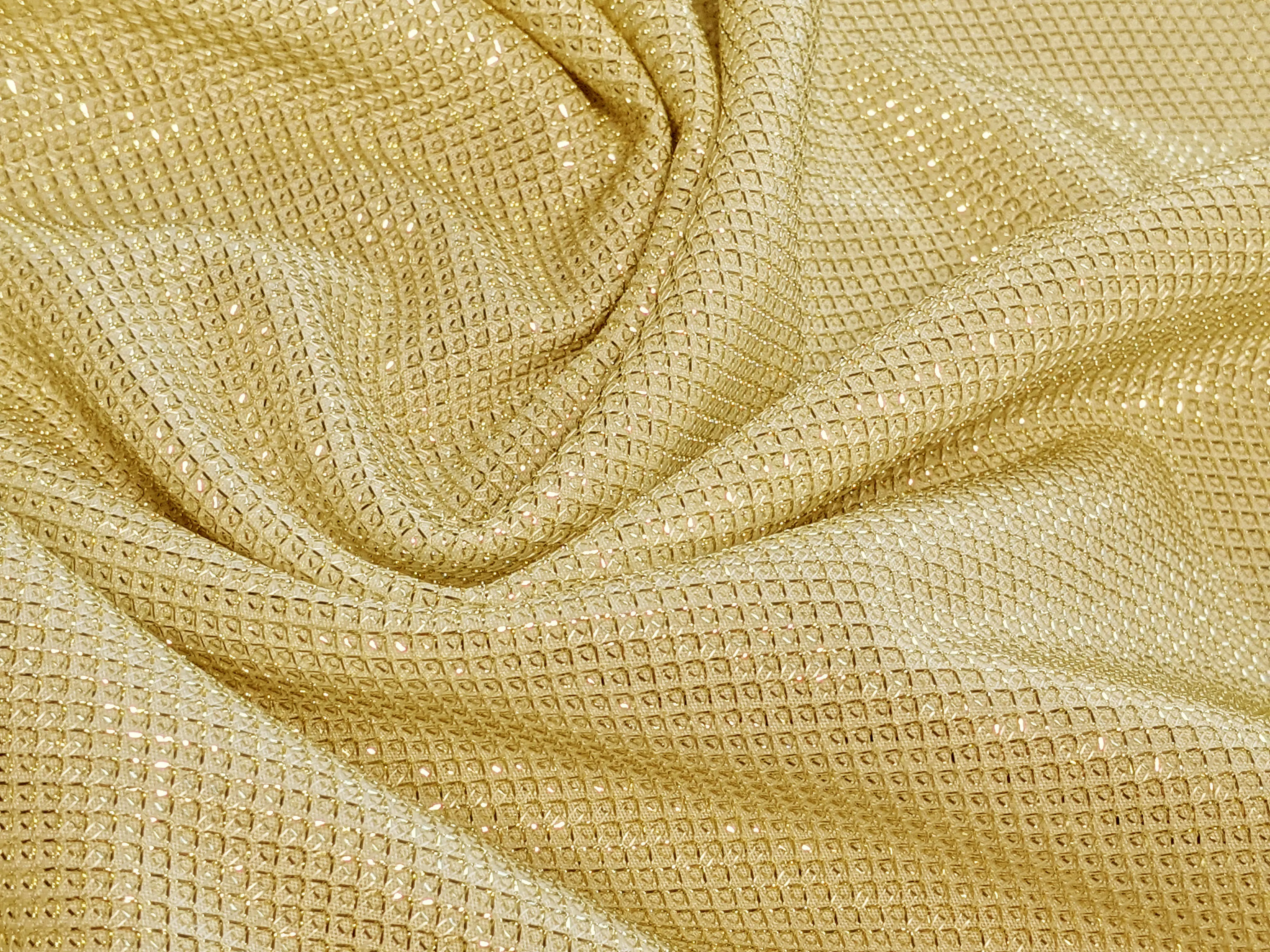 Лицьова сторона полотна має форму лусочок, витканих з люрексових ниток. Тканина має благородний блиск, який у виробі красиво переливається і грає на світлі.