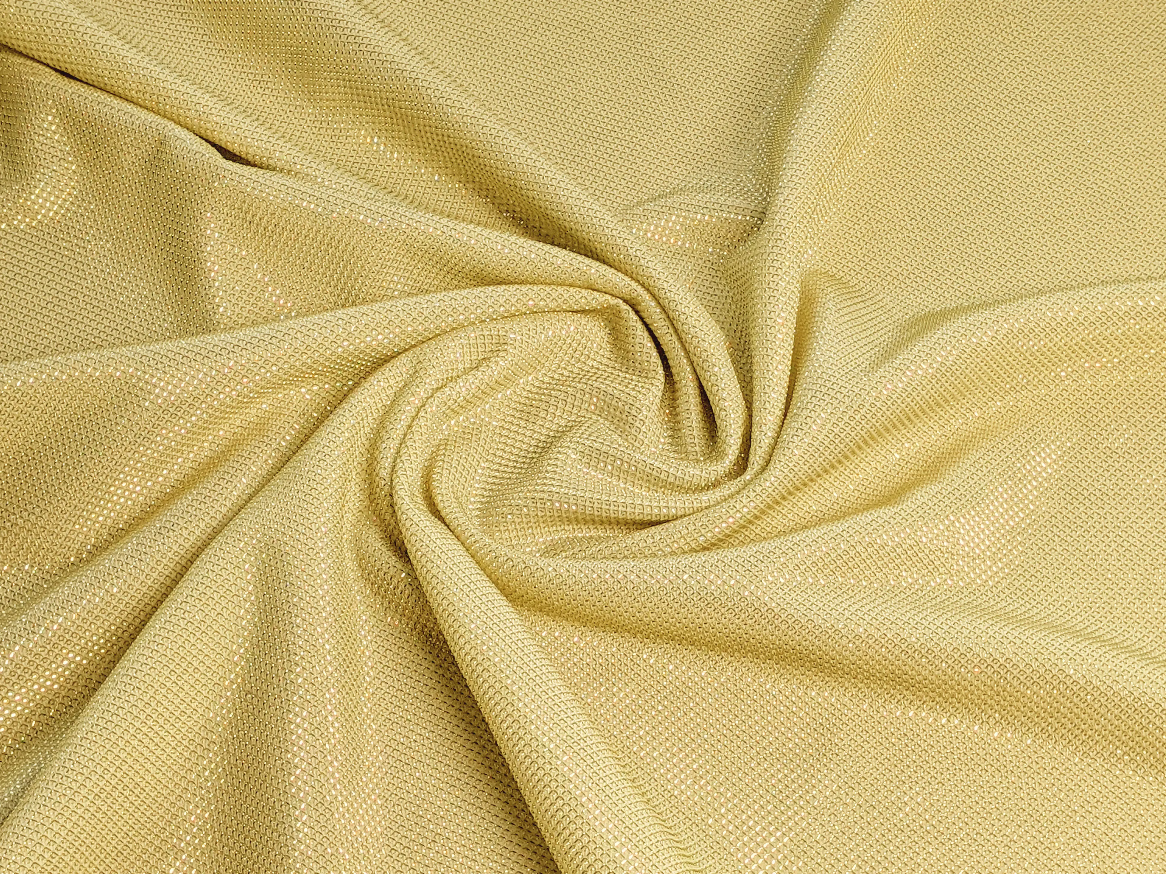 Трикотаж диско луска щільний - це один з варіантів трикотажу диско луска, виконаний на лайкрі. Основа тканини більш щільна, менше тягнеться, не світиться, не мнеться, при цьому гладка і приємна на дотик. Завдяки цим якостям з щільного трикотажу диско можна шити святкові та вечірні вбрання без підкладки.