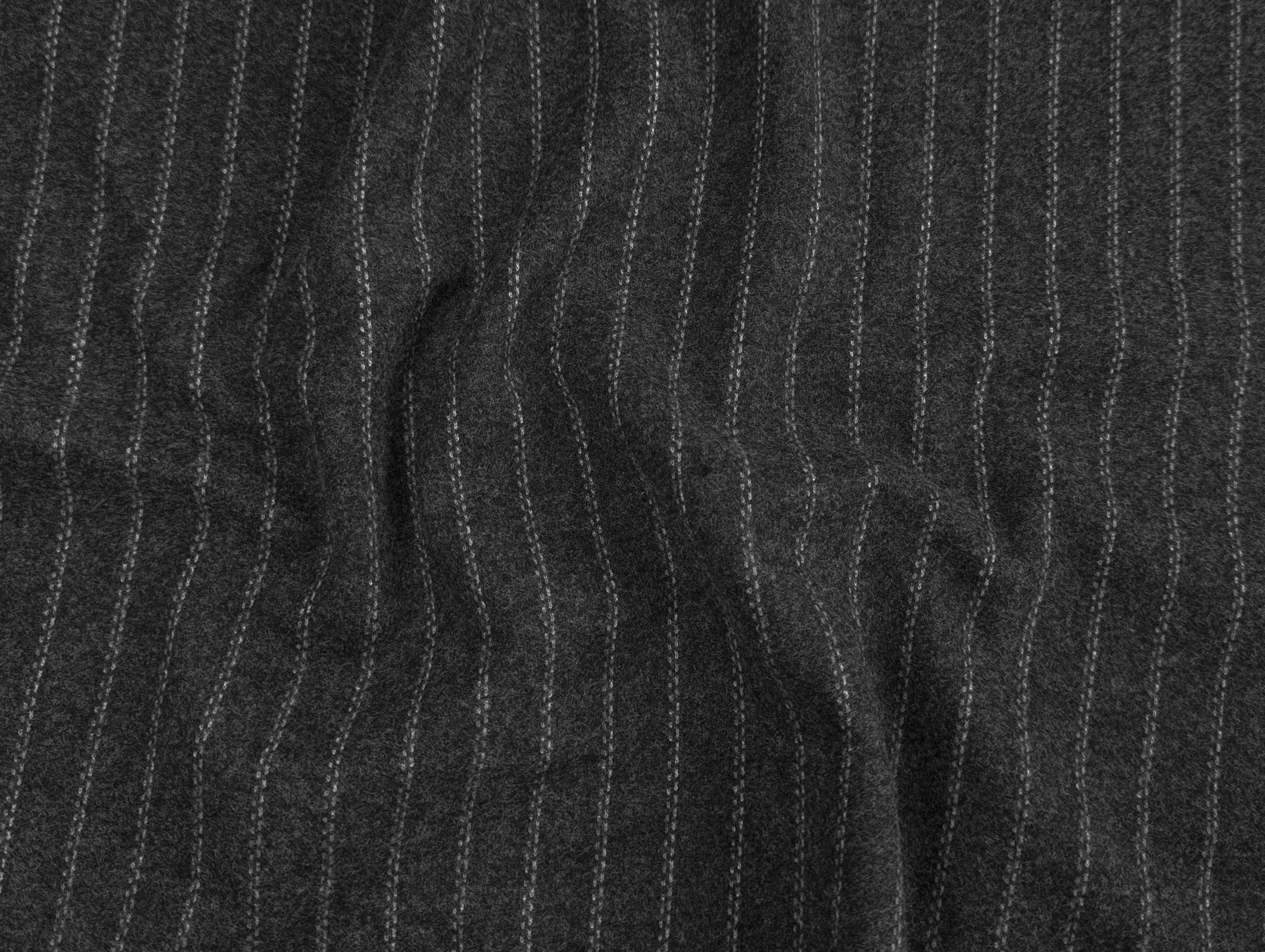 Трикотаж Каміла - тепла, м'яка тканина з легкою ворсистою текстурою з обох сторін. Матеріал приємний на дотик, добре зберігає тепло, злегка тягнеться в двох напрямках, забезпечуючи комфорт і свободу рухів, має слабке зминання. При драпіруванні складки стабільні і не розпадаються. Нанесений принт у вигляді смуг вздовж кромки надає тканині елегантності, строгості, створює ефект подовження силуету.