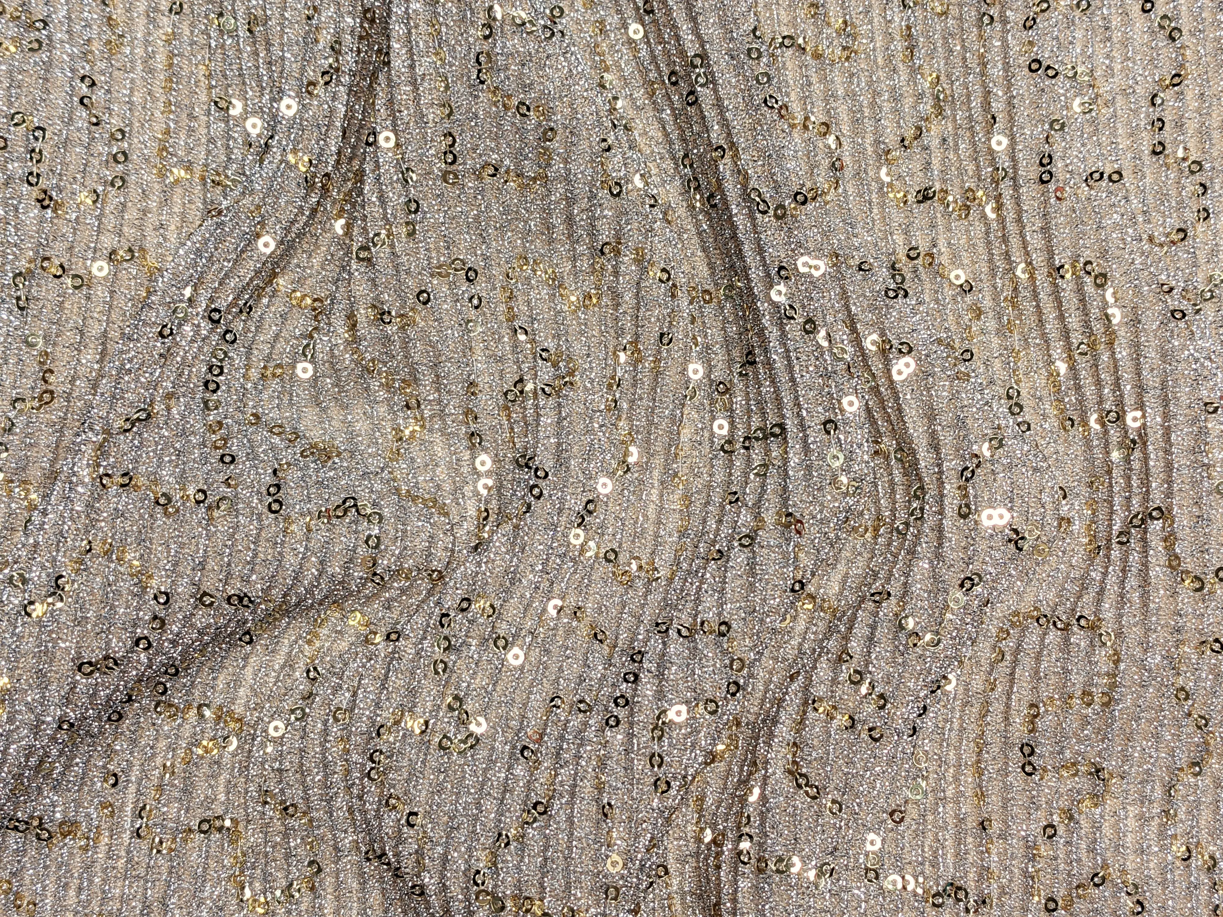 Трикотаж люрекс з паєтками - це трикотажне полотно, з нашитими довільними лініями паєтками діаметром 2 мм. Основа полотна – це тонкий трикотаж люрекс, злегка гофрований, завдяки чому тканина тягнеться в обидва боки. Миготливий блиск люрексу в поєднанні з блискучим блиском паєток дозволяє створювати по-справжньому казкові вбрання як для дорослих, так і дітей. Тканина не заминається, злегка тримає форму, трохи світиться, тому потребує підкладки. Рекомендуємо тонку трикотажну підкладку для пошиття виробу з даного виду полотна, але також ви можете застосовувати в пошитті і фатин для створення об'єму та пишності спідниці.
