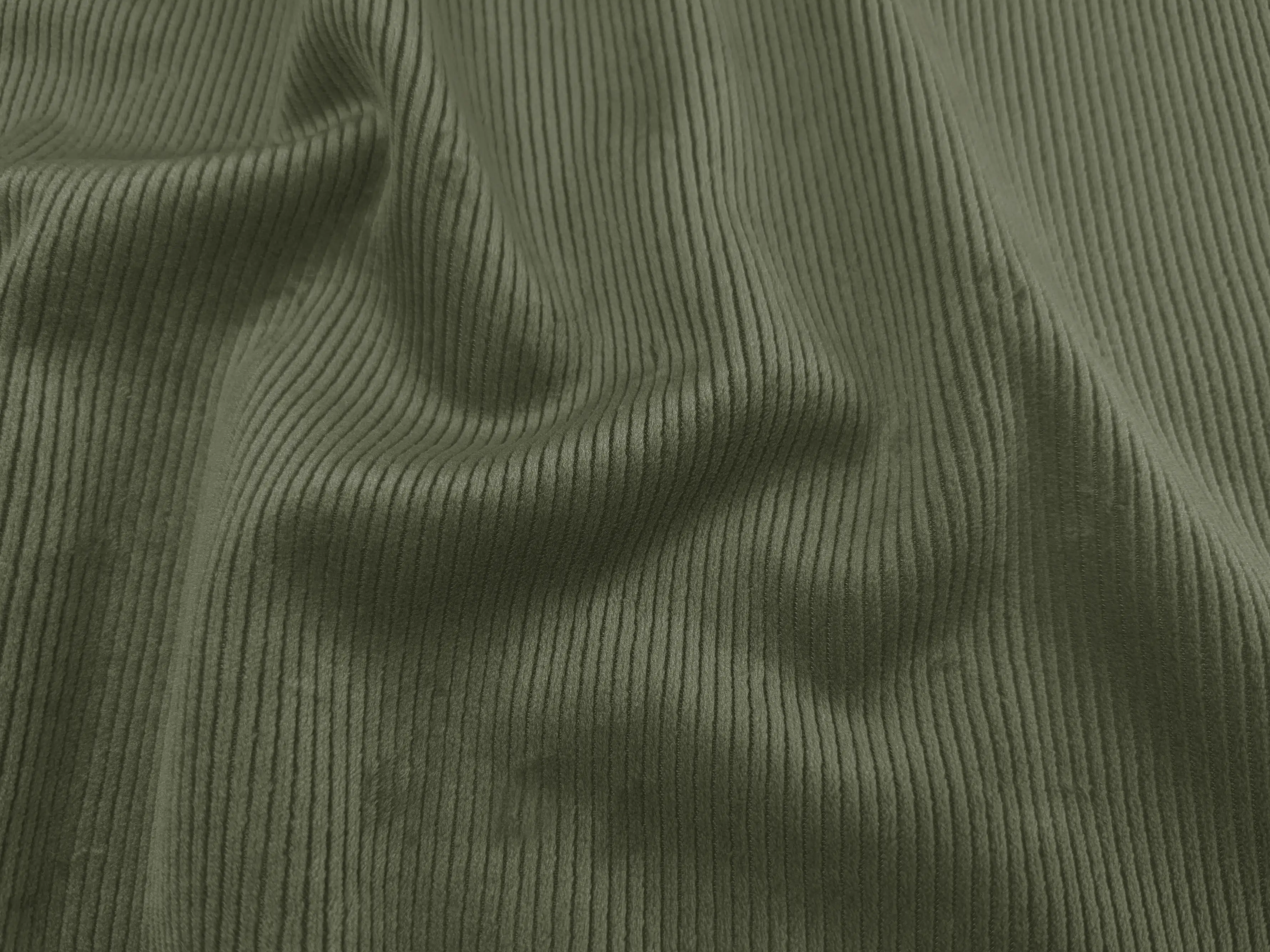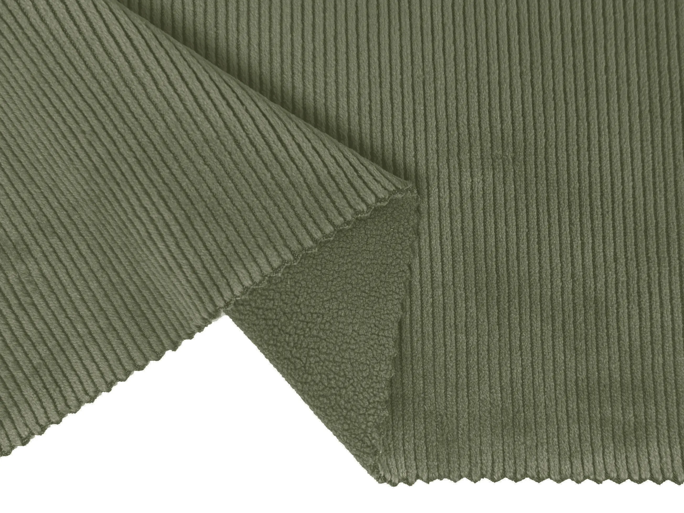 Трикотаж вельвет на флісі - це м'який, комфортний, двошаровий трикотажний матеріал. Основа тканини з лицьового боку виконана з трикотажу з ребристим ворсом у вигляді поздовжнього рубчика завширшки 2 мм, що імітує вельвет, а зворотний має теплий фліс. Тканина пластична, має хорошу розтяжність в обидва боки, пружна, добре зберігає форму, не мнеться. Матеріал має теплозберігаючі властивості.