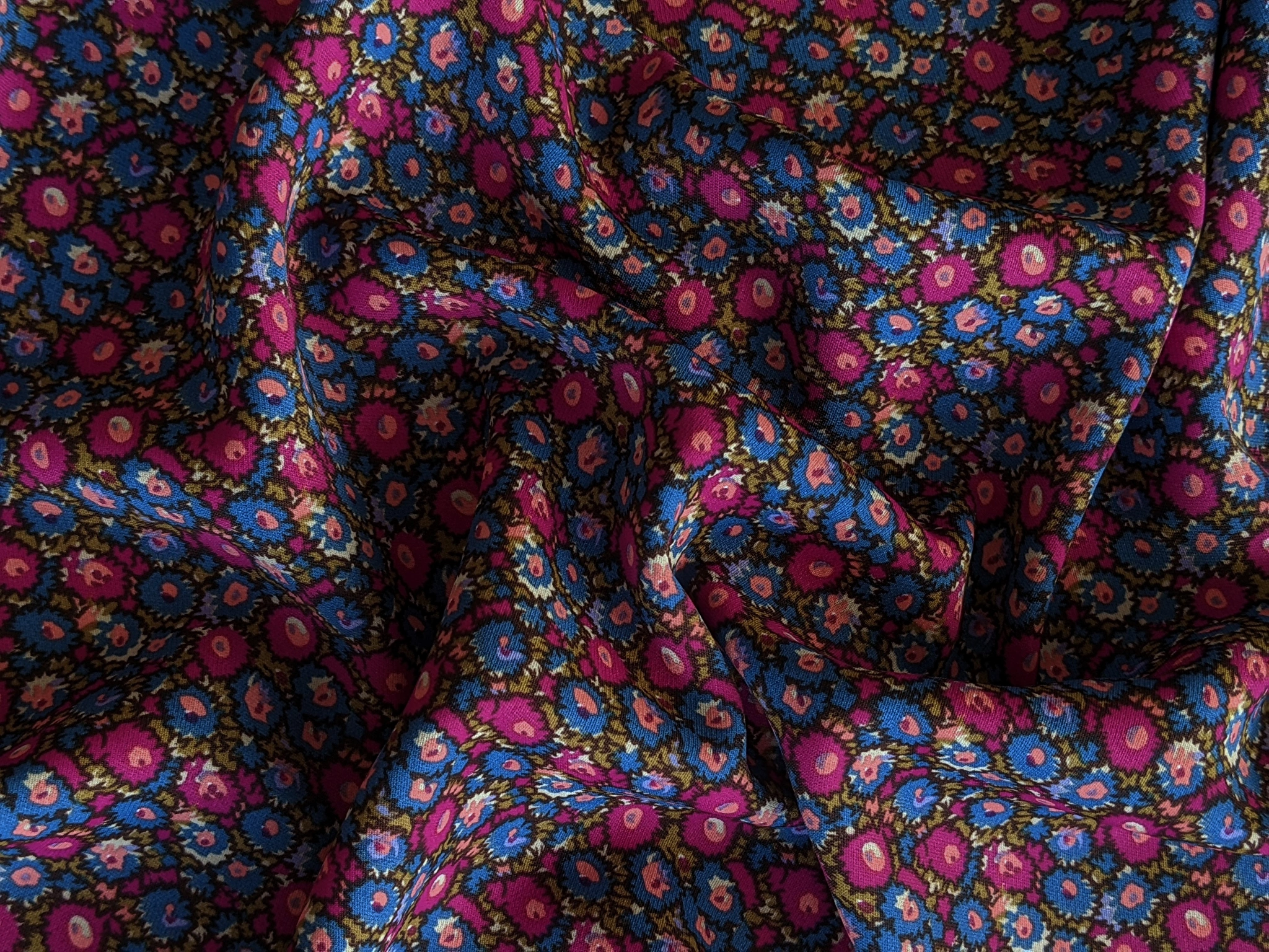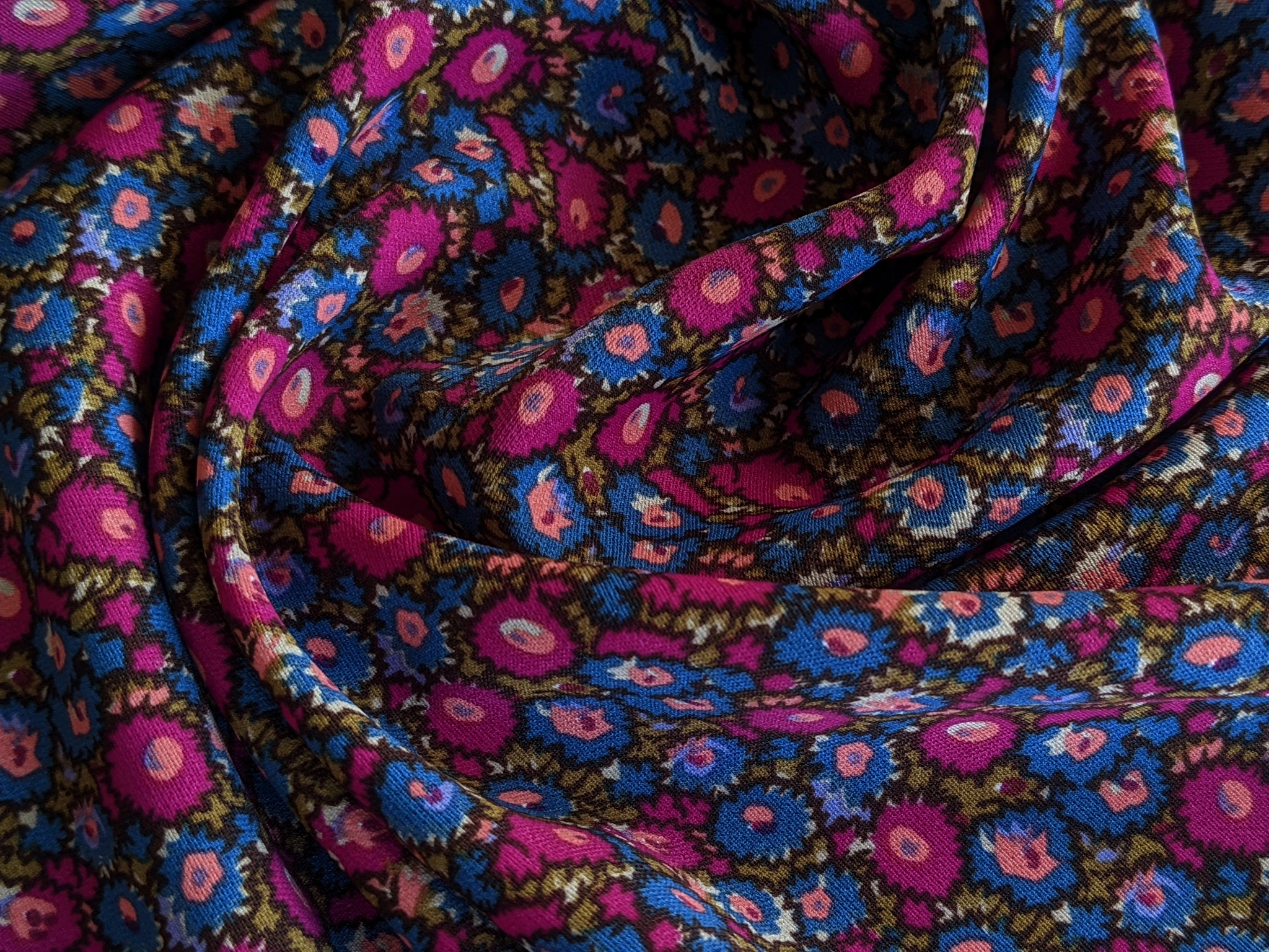 Платтяна твілова тканина з малюнком по всьому полотну. Має діагональне плетіння ниток по лицьовій стороні. Тканина не просвічується, трохи тягнеться по одній стороні, легка, але щільніша за французьку віскозу. Полотно гарно драпірується. Тканина на дотик злегка шорстка. Твіл практичний, не обмежує рухів, не мнеться. Використовується для пошиття суконь і спідниць на літній і весняний сезон.