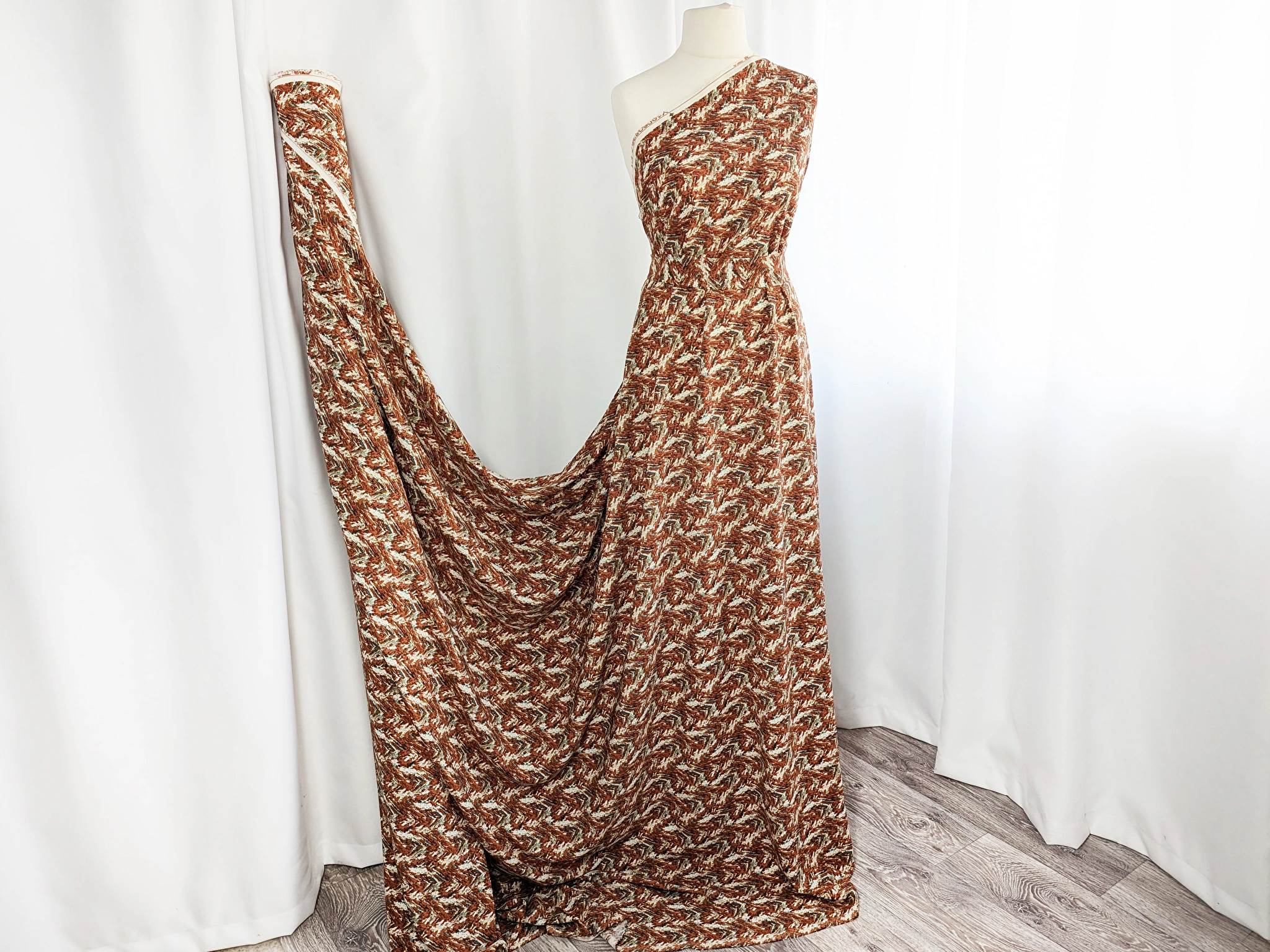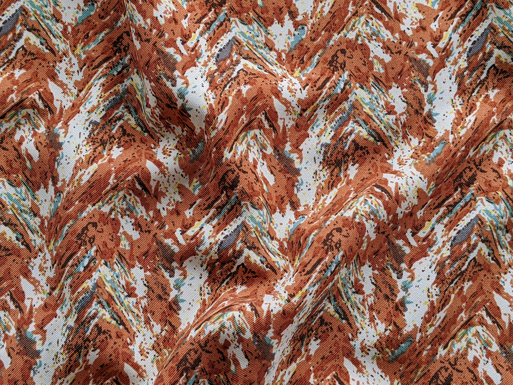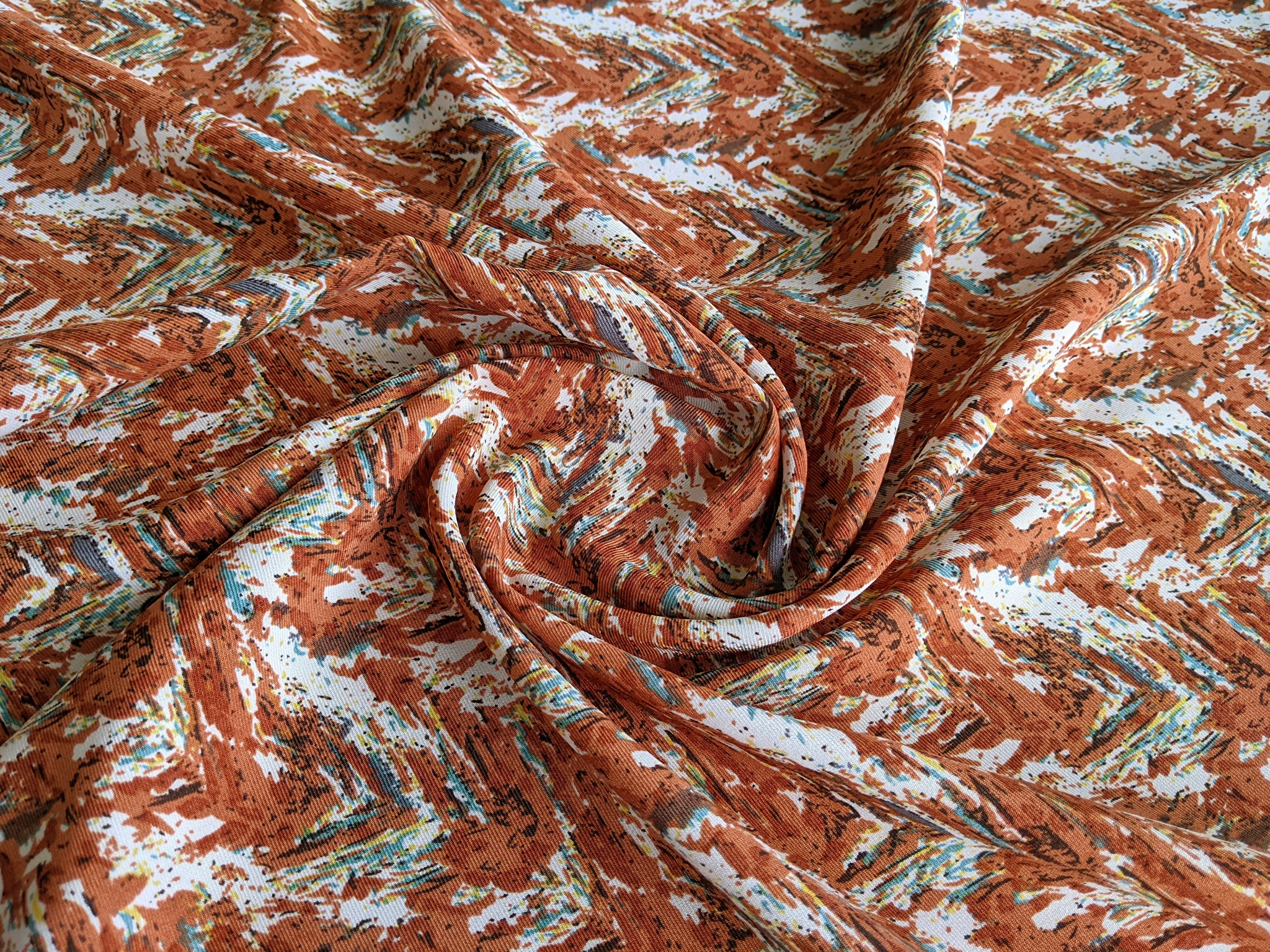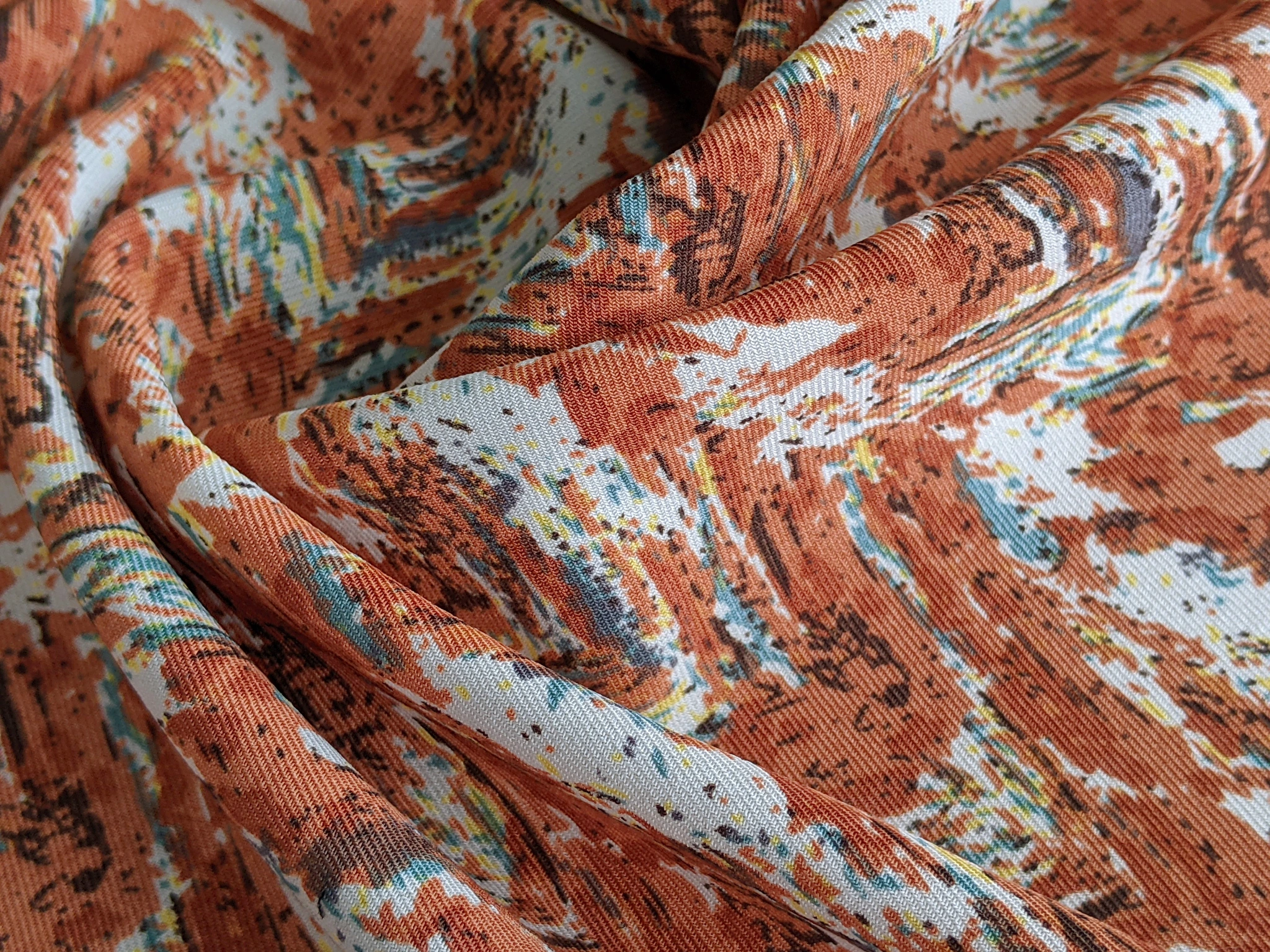 Платтяна твілова тканина з малюнком по всьому полотну. Має діагональне плетіння ниток по лицьовій стороні. Тканина не просвічується, трохи тягнеться по одній стороні, легка, але щільніша за французьку віскозу. Полотно красиво драпірується. На дотик злегка шорстка. Твіл практичний, не обмежує рухів, не мнеться. Використовується для пошиття суконь і спідниць на літній і весняний сезон.