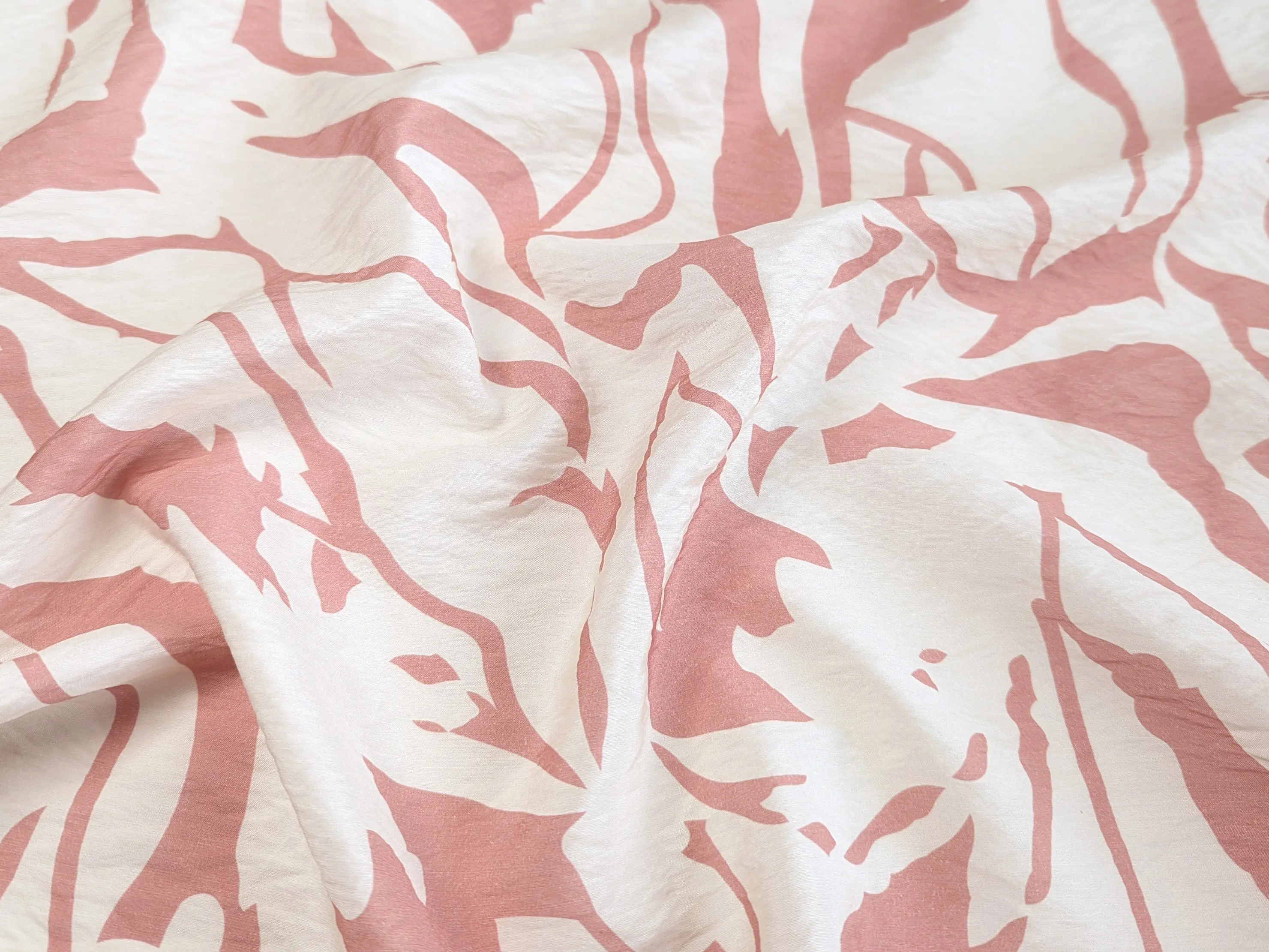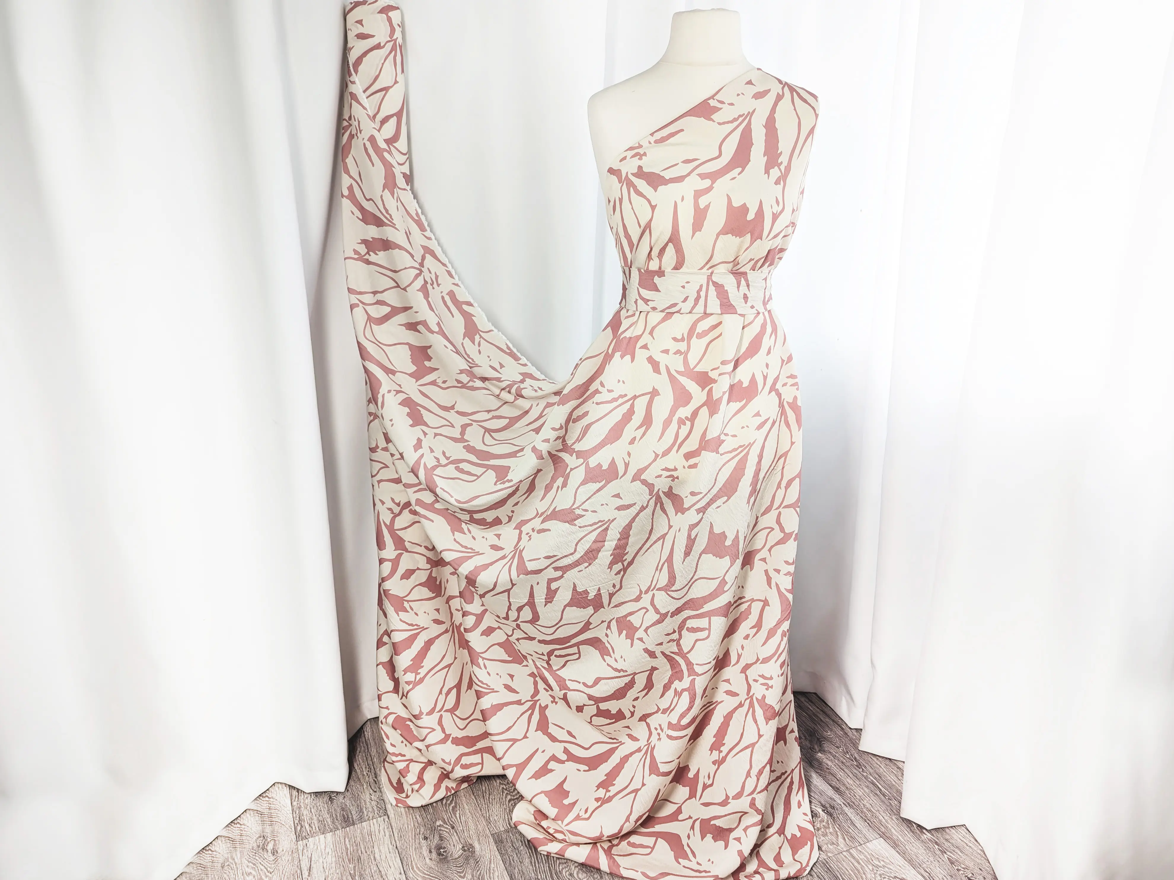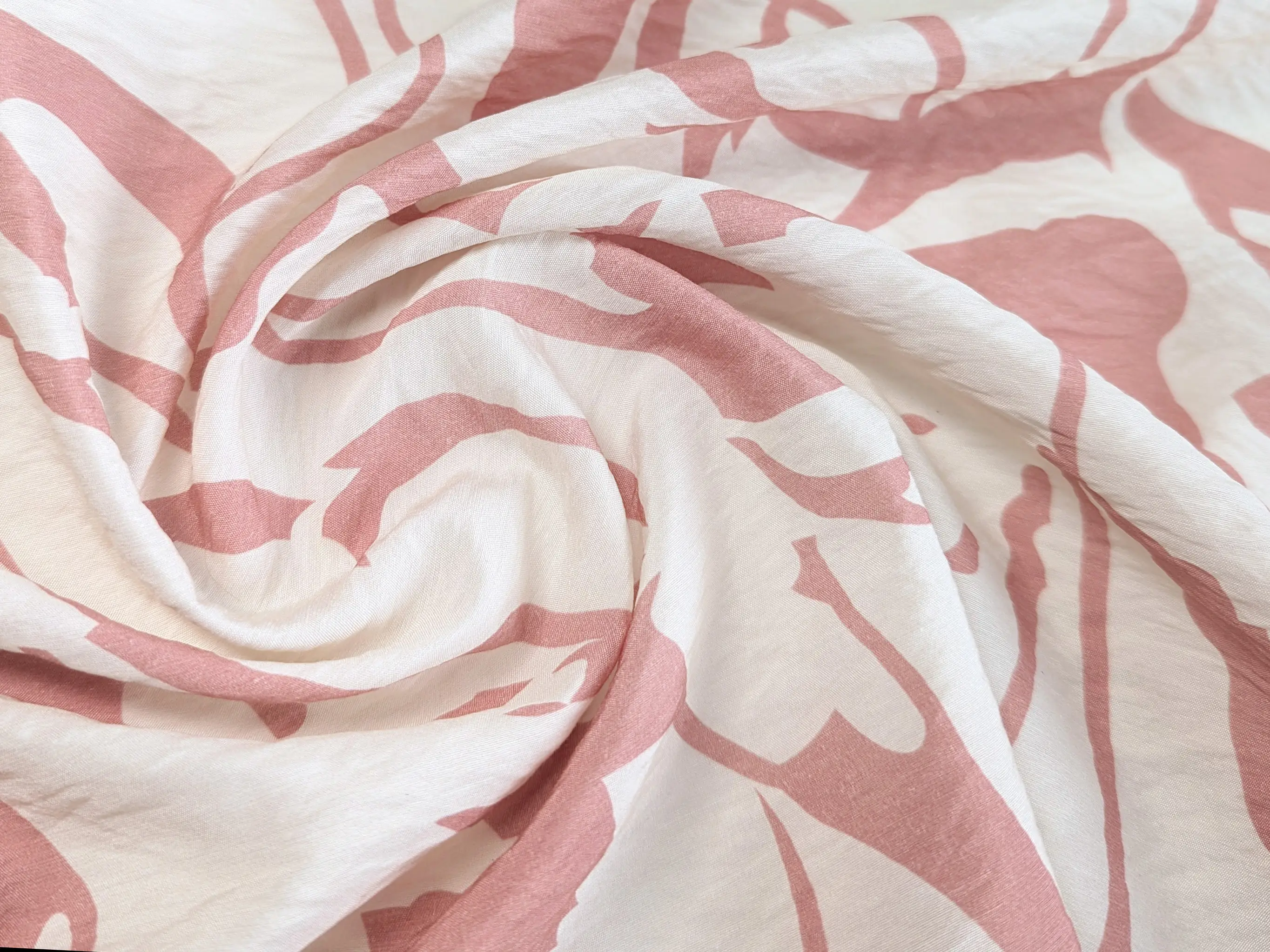 Віскоза шовк Бохо - тонкий, невагомий матеріал з ледь помітною жатою текстурою. Тканина тактильно приємна, легка і повітряна, поєднує в собі ніжність шовковистої структури і вишуканість штапеля. При драпіруванні лягає в м'які, повітряні волани і складки. Має легкий силуетний просвіт, не тягнеться, завдяки нануральному складу злегка зминається, пропускає повітря, не парить, дає відчуття прохолоди в спекотну погоду.