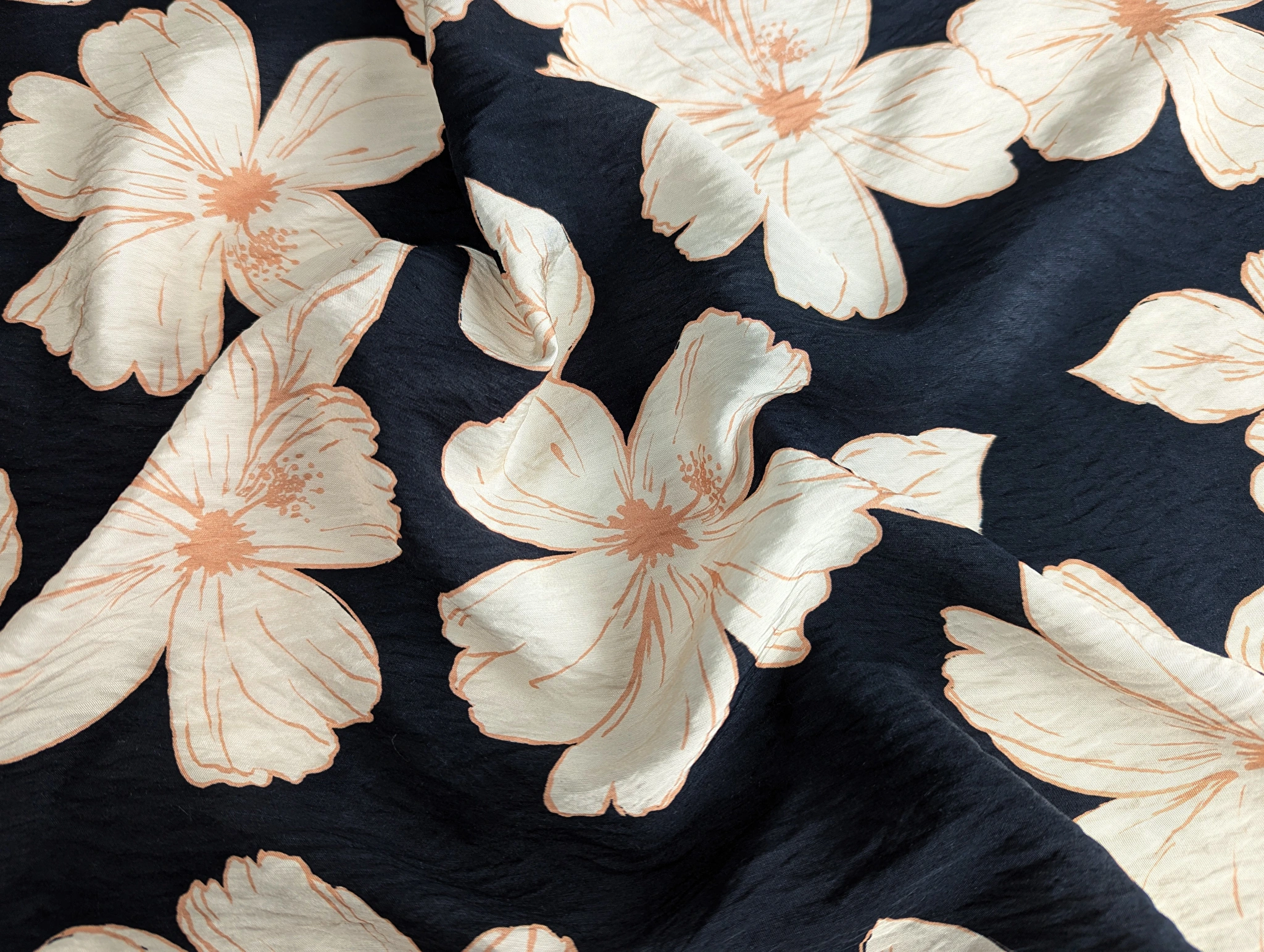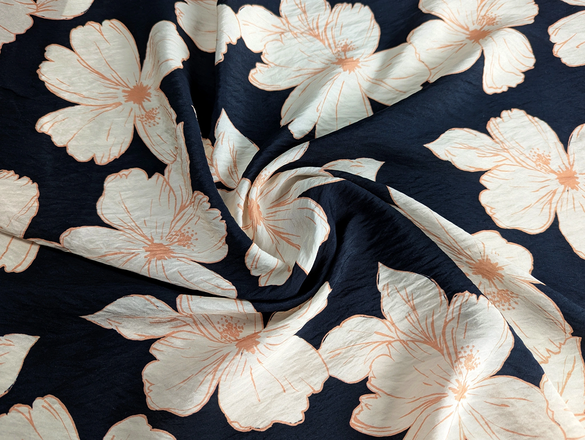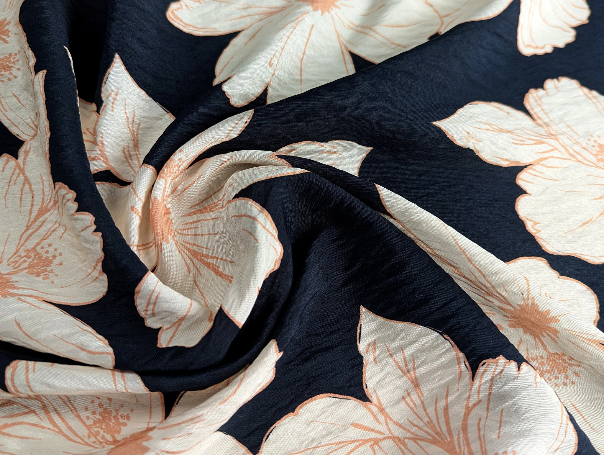 Віскоза шовк Бохо - тонкий, невагомий матеріал з ледь помітною жатою текстурою. Тканина тактильно приємна, легка і повітряна, поєднує в собі ніжність шовковистої структури і вишуканість штапеля. При драпіруванні лягає в м'які, повітряні волани і складки. Має легкий силуетний просвіт, не тягнеться, завдяки нануральному складу злегка зминається, пропускає повітря, не парить, дає відчуття прохолоди в спекотну погоду.