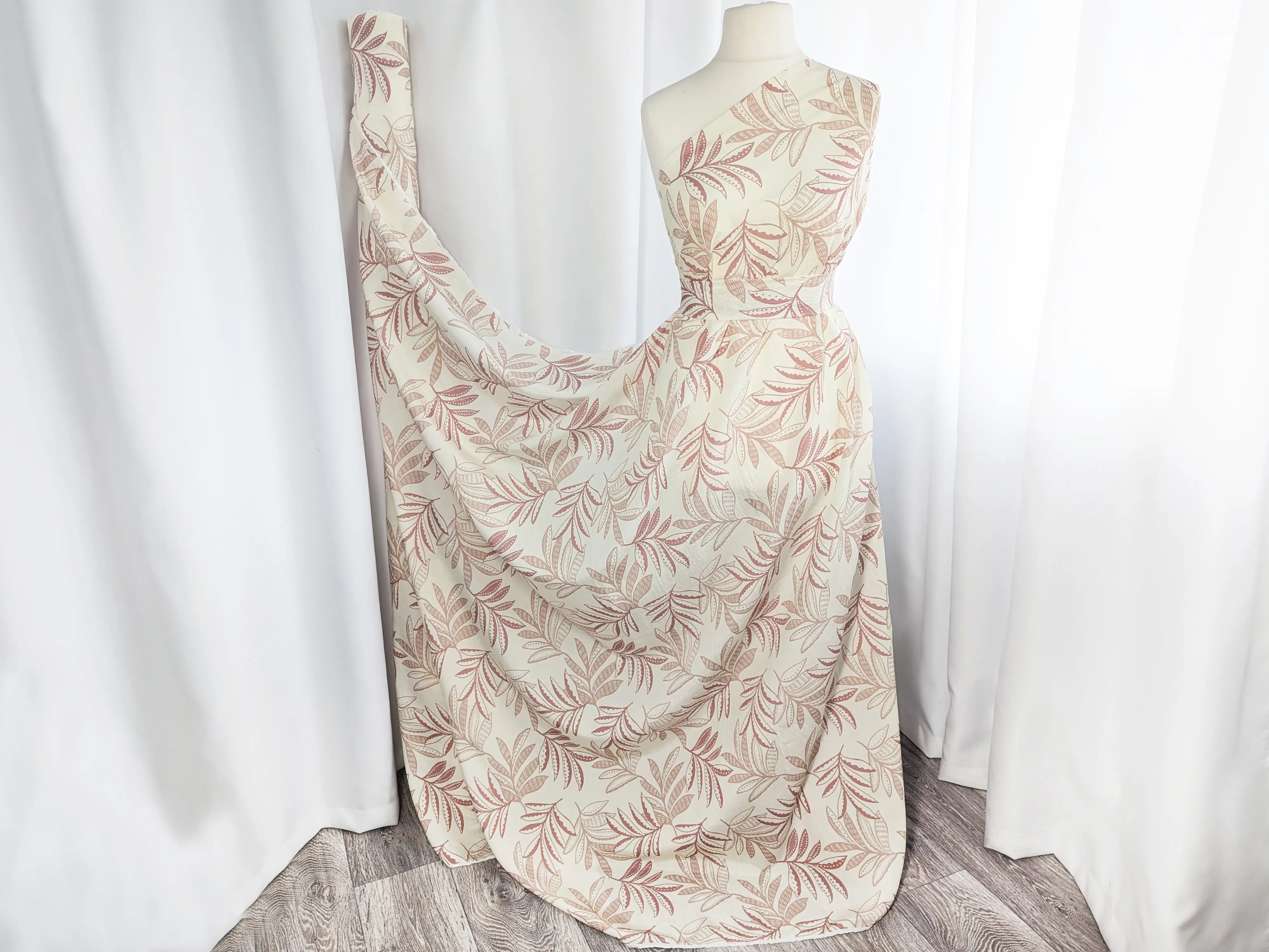 Віскоза шовк Бохо - тонкий, невагомий матеріал з ледь помітною жатою текстурою. Тканина тактильно приємна, легка і повітряна, поєднує в собі ніжність шовковистої структури і вишуканість штапеля. При драпіруванні лягає в м'які, повітряні волани і складки. Має легкий силуетний просвіт, не тягнеться, завдяки нануральному складу злегка зминається, пропускає повітря, не парить, дає відчуття прохолоди в спекотну погоду.