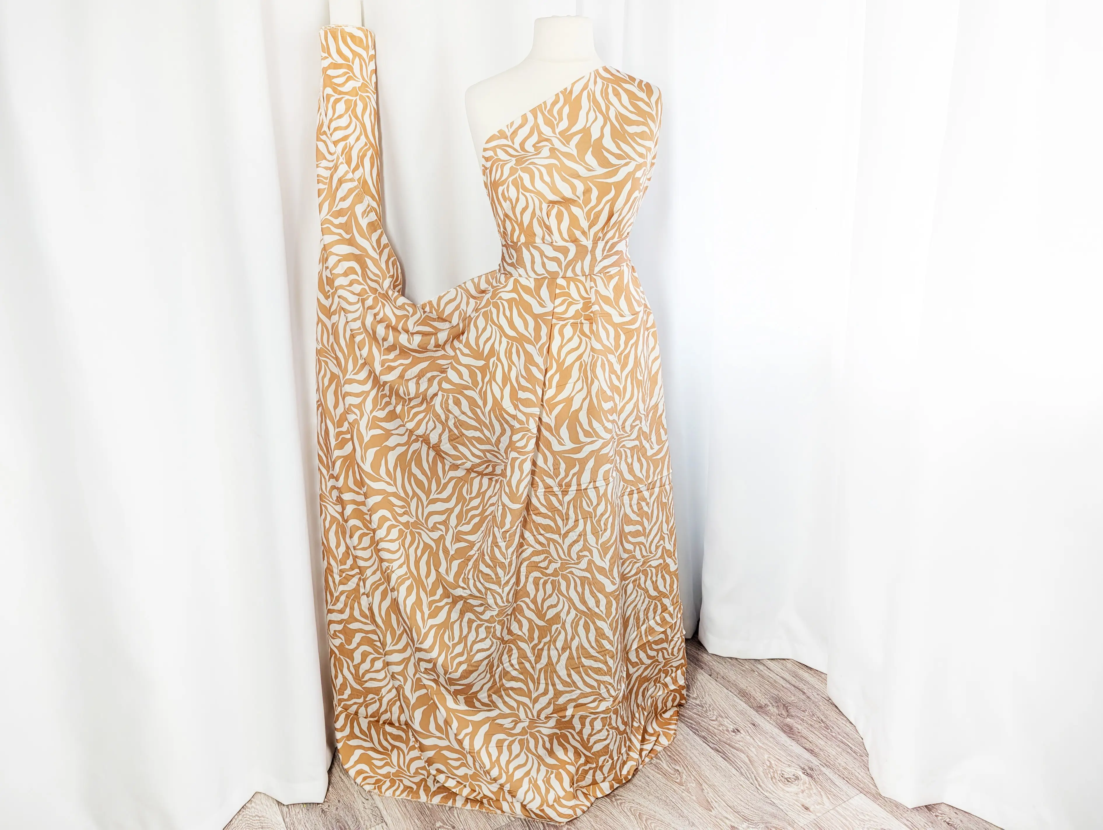 Віскоза шовк Бохо - тонкий, невагомий матеріал з ледь помітною жатою текстурою. Тканина тактильно приємна, легка і повітряна, поєднує в собі ніжність шовковистої структури і вишуканість штапеля. При драпіруванні лягає в м'які, повітряні волани і складки. Має легкий силуетний просвіт, не тягнеться, завдяки нануральному складу злегка зминається, пропускає повітря, не парить, дає відчуття прохолоди в спекотну погоду.