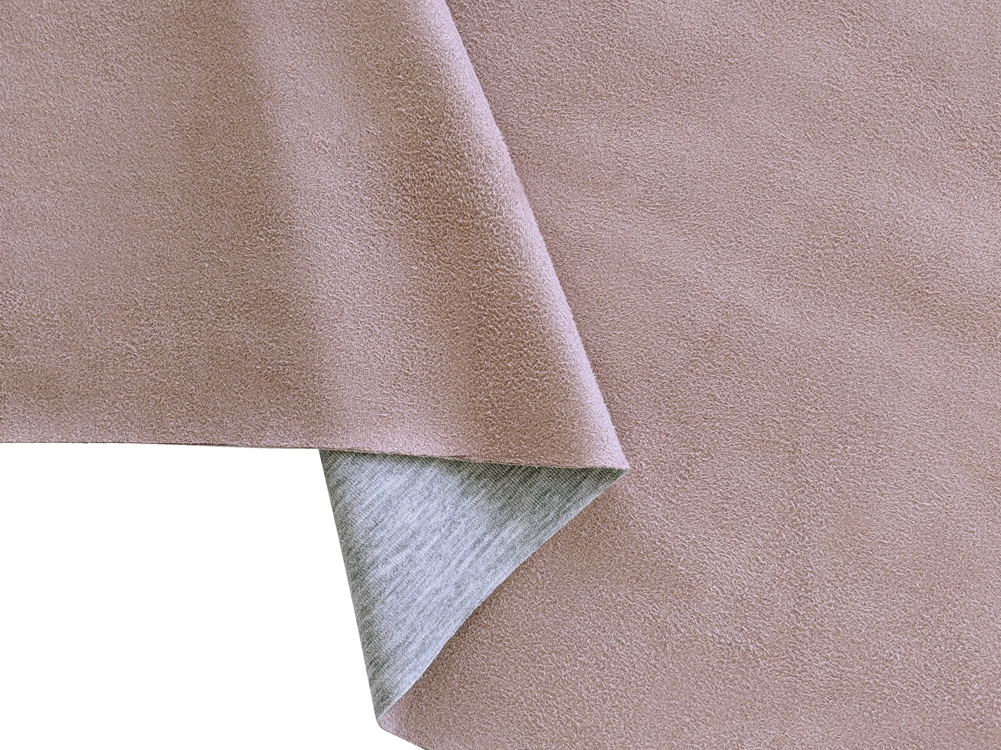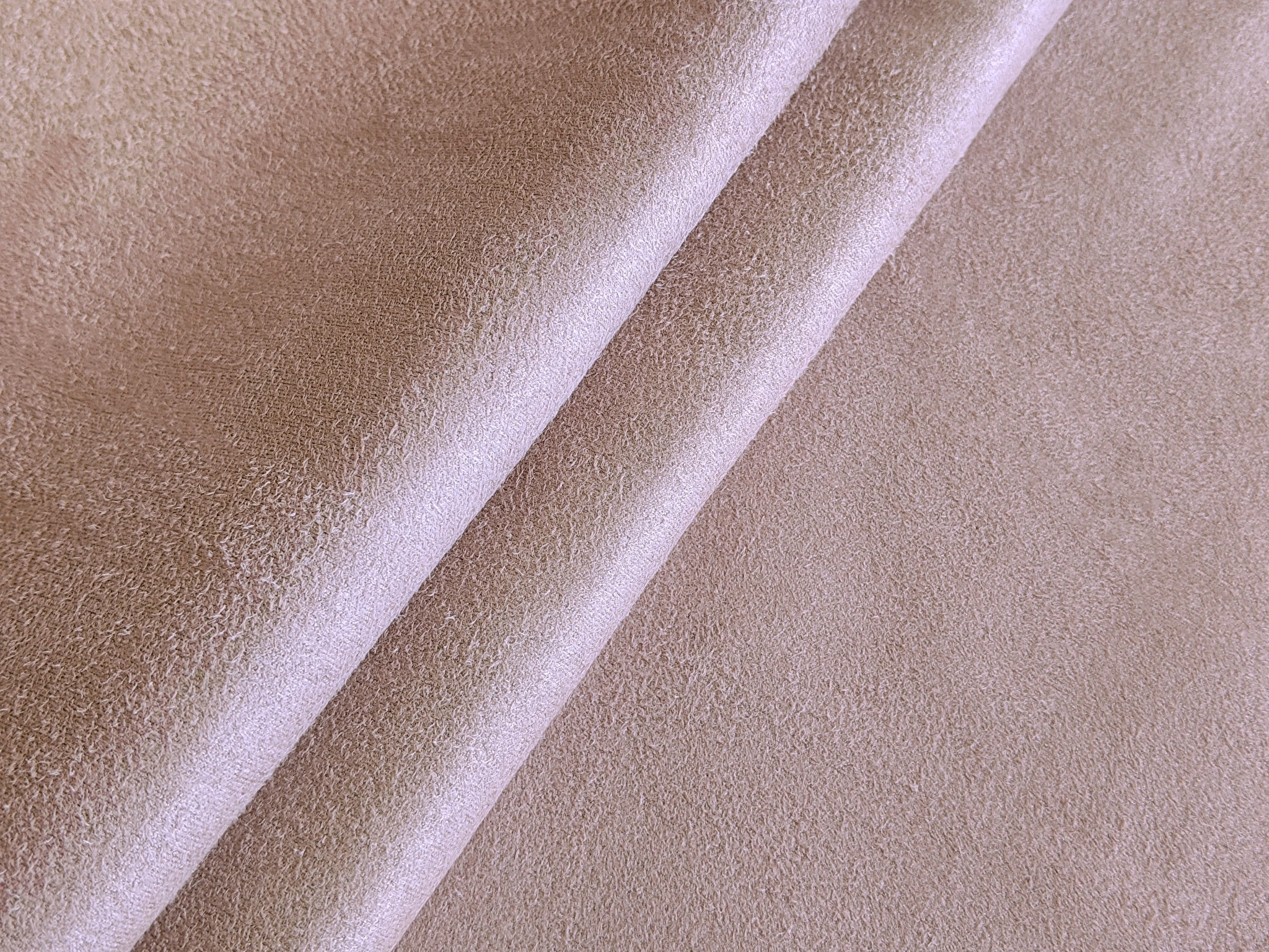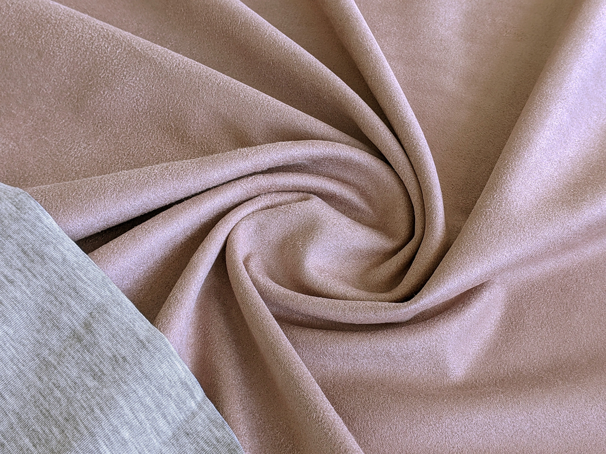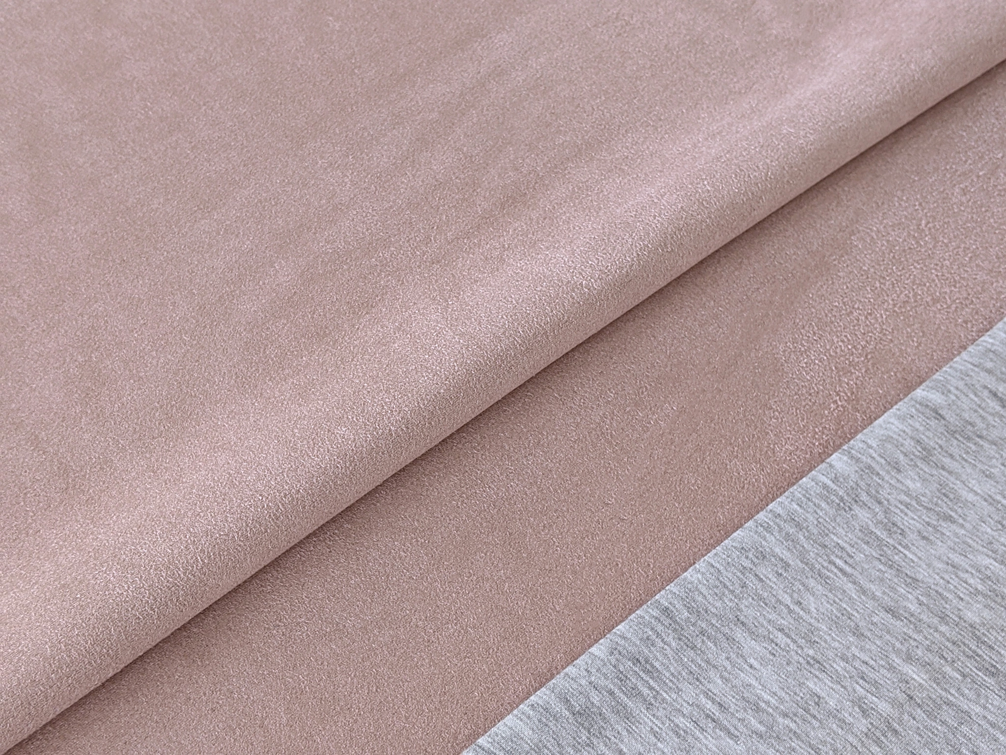 Замша на трикотажі- це еластичне двостороннє полотно з ворсом на лицьовій стороні і гладкою сірою трикотажною основа з виворітного боку. Полотно добре тягнеться. Ворсова сторона м'яка і приємна на дотик, дарує приємні тактильні відчуття, не приносить дискомфорту і не сковує рухів. Варто відзначити, що навіть через тривалий час носіння одягу із замші на трикотажі, не втрачає своєї форми і не вигоряє. Замша на трикотажі не вимагає особливих зусиль у догляді. Кольорова палітра чудово підійде для створення одягу сезону осінь-весна. Застосовується для пошиття стильних костюмів, суконь, спідниць, кардиганів та брюк.